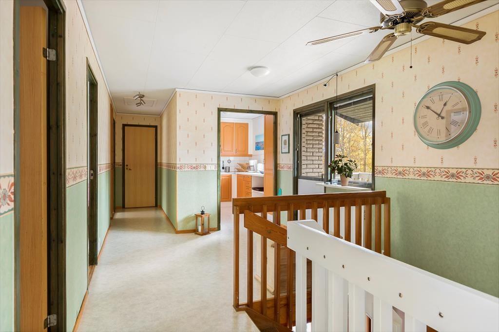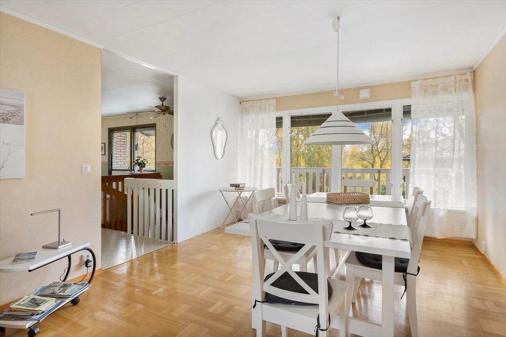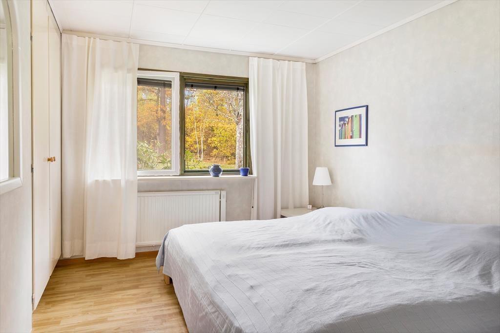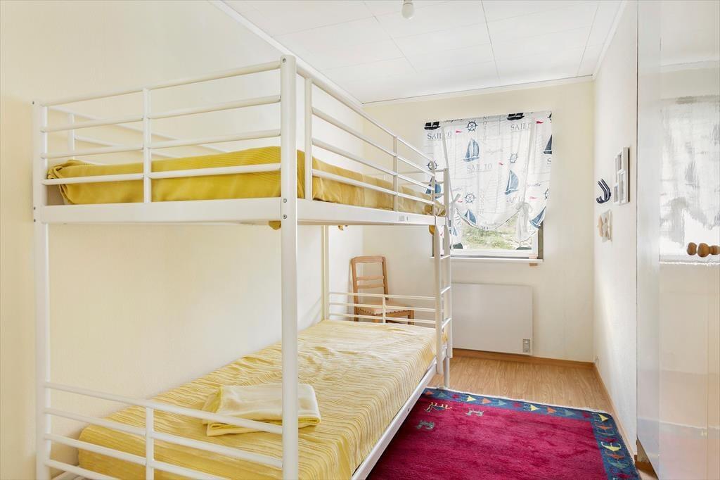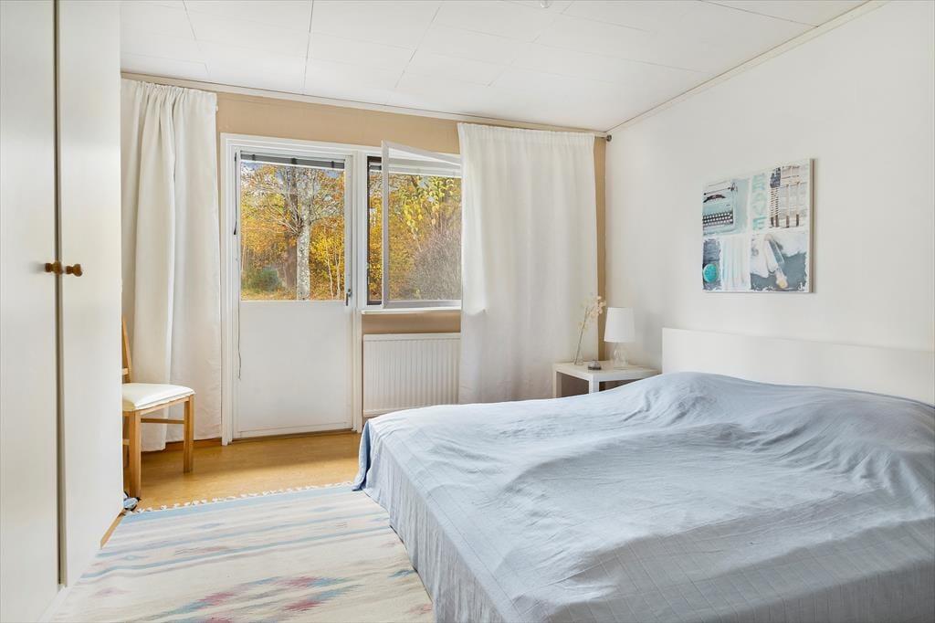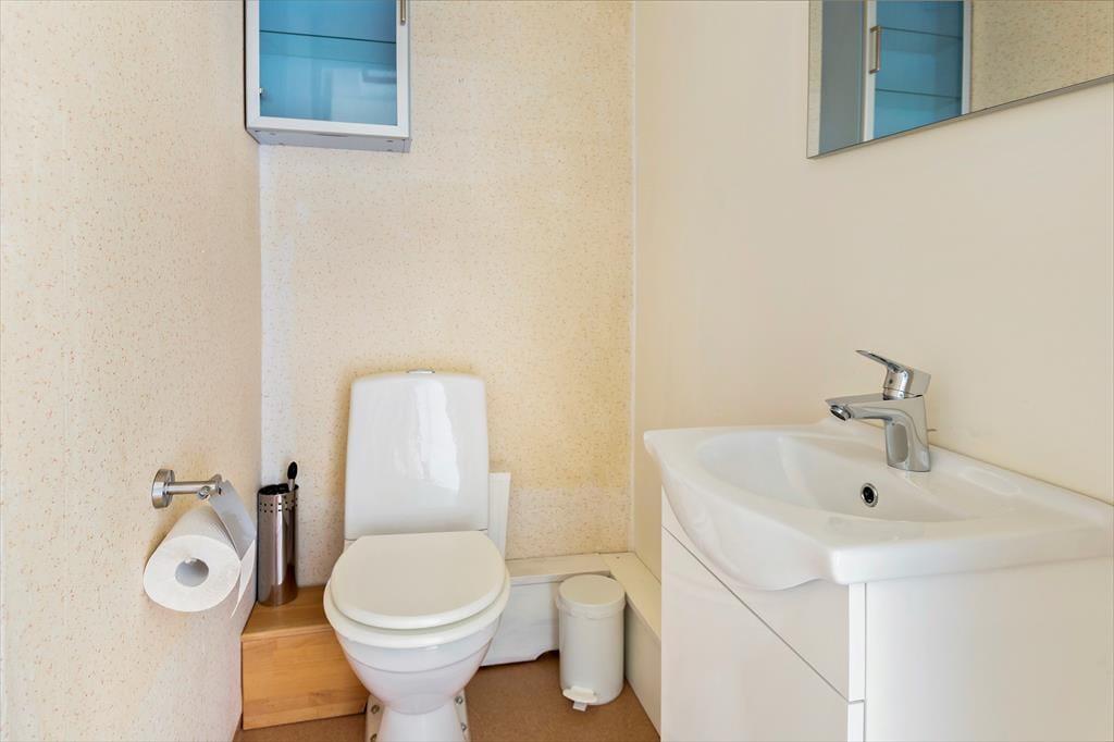 Ein modernes, geräumiges Ferienhaus für bis zu sechs Personen mit sehr guter Ausstattung. Das am Hang liegende, zweigeschossige Ferienhaus hat eine Wohnfläche von etwa 140 m². Der Hauseingang befindet sich ebenerdig auf der Straßenseite. Im Erdgeschoss des Hauses findet man ein geräumiges Wohnzimmer, ausgestattet mit gemütlichen Sitzmöbeln, Kaminofen und Sat-TV (deutsche Programme) sowie, im ehemaligen Hauswirtschaftsraum, eine Sauna mit Dusche und Waschmaschine und eine separate Toilette. Drei Schlafzimmer, zwei davon mit Doppelbetten, eines mit einem Etagenbett ausgestattet, sowie die Küche, ein Esszimmer und ein Duschbad mit WC befinden sich im Obergeschoss, an das sich zur Straßenseite ein von der Küche und vom Flur aus begehbarer Balkon anschließt und man auf der Hausrückseite über den mit gepolsterten Gartenmöbeln ausgestatteten Wintergarten in den höher gelegenen hinteren Teil des Grundstücks gelangt, wo sich auf der Rasenfläche eine Wäschespinne befindet. In der modernen Küche gibt es einen Elektroherd mit Backofen sowie eine Kühl- Gefrierkombination und eine Kaffeemaschine. Das Haus hat ganzjährig kommunale Wasser- und Abwasserversorgung und kann elektrisch beheizt werden. In der über den Saunaraum erreichbaren ehemaligen Garage befinden sich Gartengeräte sowie drei Fahrräder. Den Gästen des Hauses stehen weiterhin zwei Sonnenliegen, ein Kugelgrill sowie ein Ruderboot zur Verfügung, das, wenn das Haus nicht bewohnt ist, im Carport aufbewahrt wird.