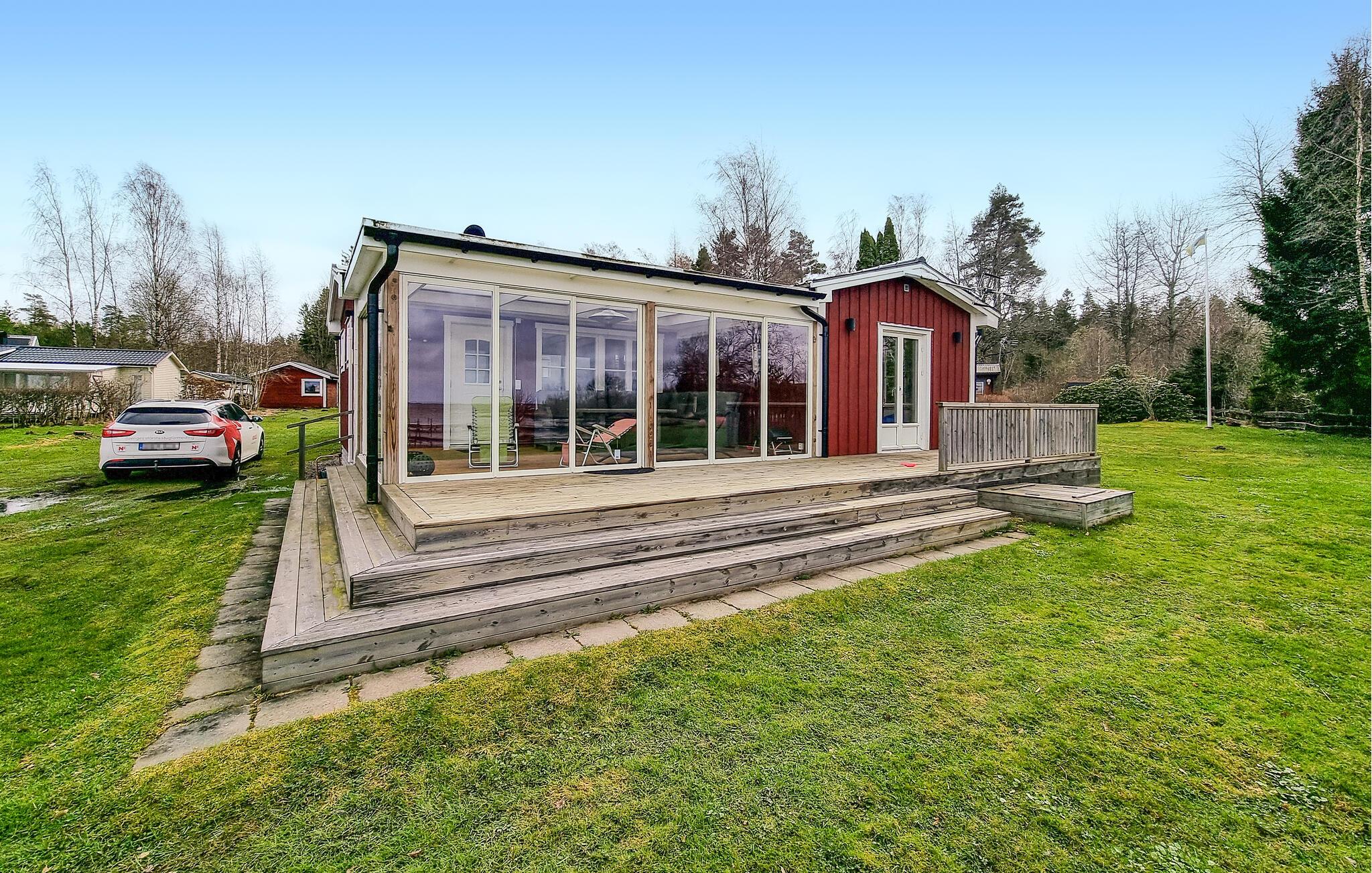 Direkt an Schwedens größtem See, dem Vänern, gelegen, empfängt Sie dieses gemütliche Ferienhaus mit offenen Armen. Das stilvolle Holzambiente im Innen- und Außenbereich schafft eine angenehme Stimmung. Dazu kommt noch der prächtige Panoramablick auf den See, den Sie auf der geschlossenen, überdachten Terrasse genießen können, auch wenn das Wetter mal nicht ganz so gut sein sollte. Die praktische Küche steht bereit für große und kleine Hobbyköche, und der Essbereich lädt zu geselligen Mahlzeiten ein. Nutzen Die den Wohnbereich mit der gemütlichen Sitzgruppe und dem zentralen Kamin für familiäre Zusammenkünfte.