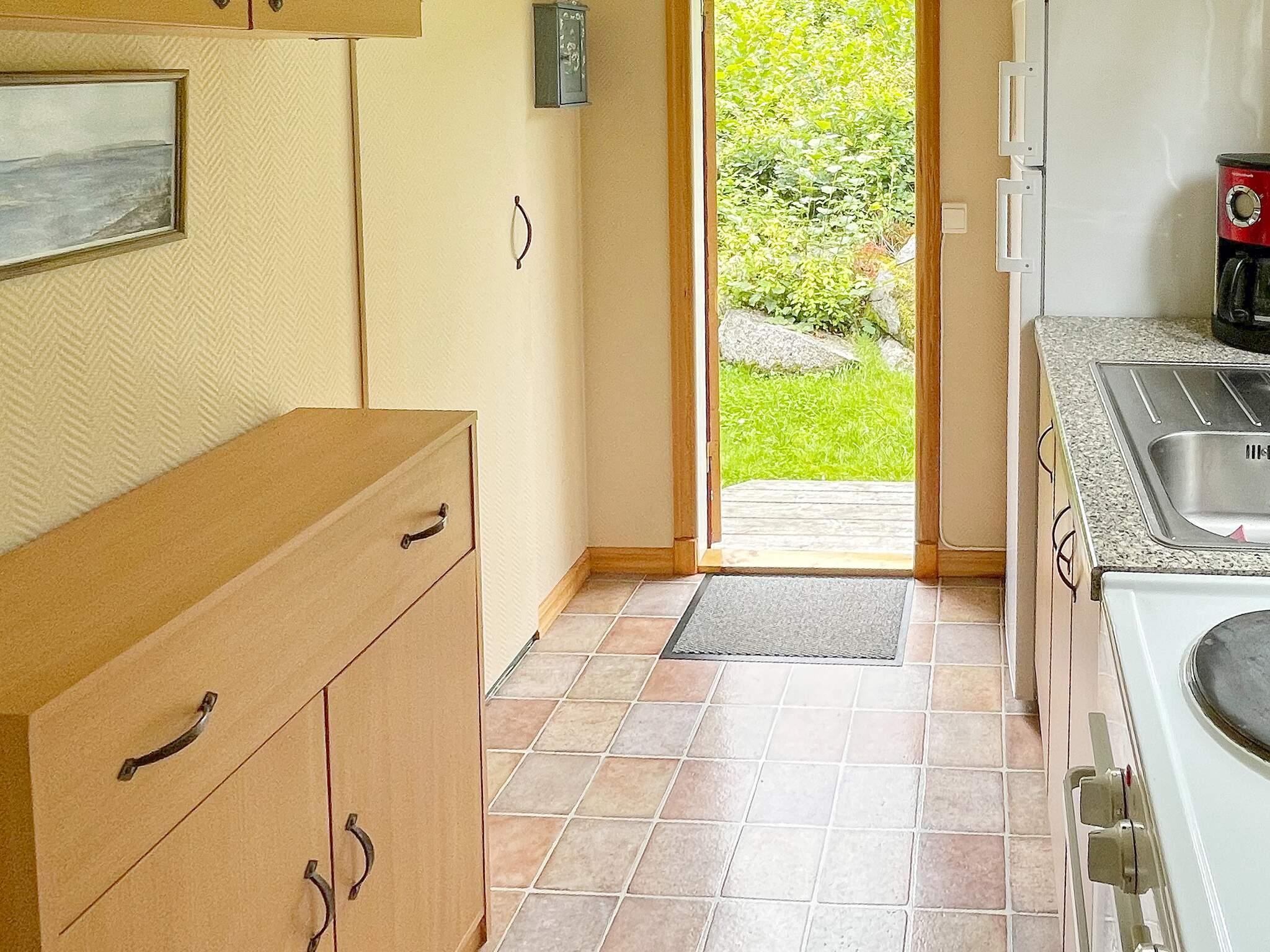 Eingang auf der Veranda mit Zugang zum großen Familienzimmer, das sowohl einen Esstisch als auch ein Schlafsofa und ein Smart-TV beinhaltet. Das Schlafzimmer verfügt über ein 180 cm langes Doppelbett (kürzere Länge als Standard). Weiter im Haus finden Sie die Küche, die einen Ausgang zum Garten an der Rückseite des Hauses hat. Angrenzend an die Küche gibt es einen Stauraum und ein Waschbecken mit Spiegel.