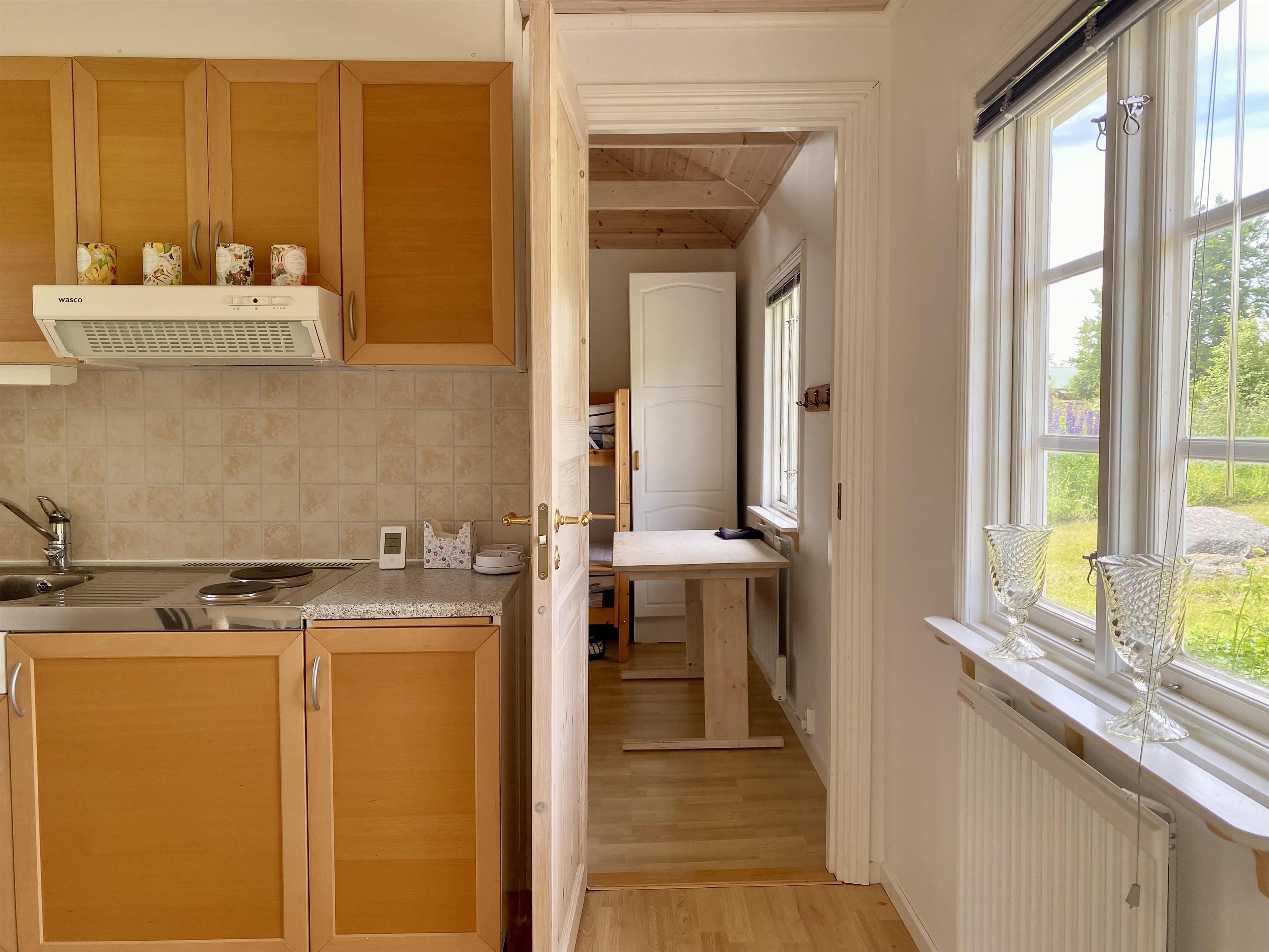 Im kleineren Haus gibt es ein Zimmer mit einem Etagenbett für zwei Kinder sowie ein ausziehbares Bett für 2 Personen. Außerdem gibt es ein sogenanntes Daybed und ein Babybett. In diesem kleineren Haus befindet sich derzeit ein Waschbecken und eine Campingtoilette, die der Eigentümer im Winter 2024 gegen eine Verbrennungstoilette austauschen wird. Dann wird auch eine Dusche installiert. Hier gibt es bereits eine Küche mit Kühlschrank/Gefrierfach und einer Kaffeemaschine.