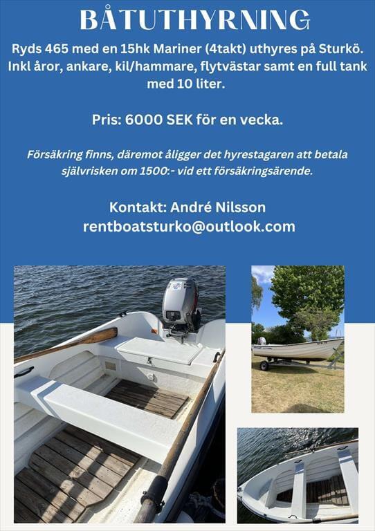 Auf der Nachbarinsel Sturkö kann ein Motorboot mit 15 PS gemietet werden. Die Kosten betragen 1500 SEK pro Tag, 3000 SEK für 3 Tage und 6000 SEK für 1 Woche. Bei Interesse werden die Kontaktdaten vermittelt.