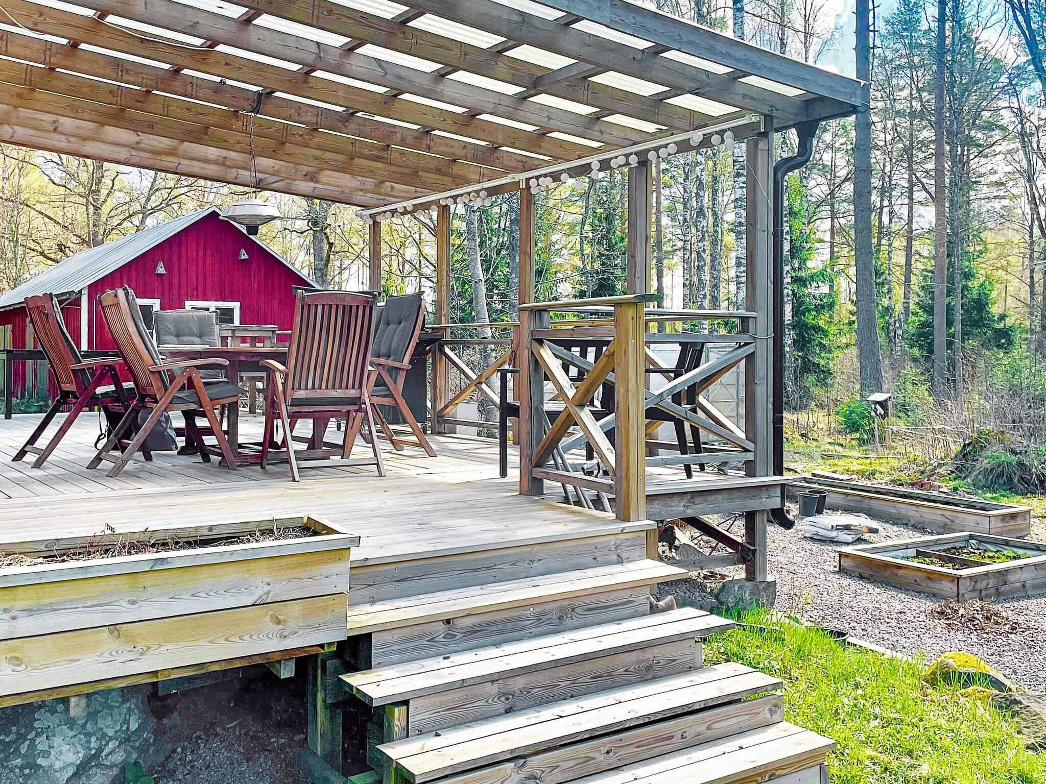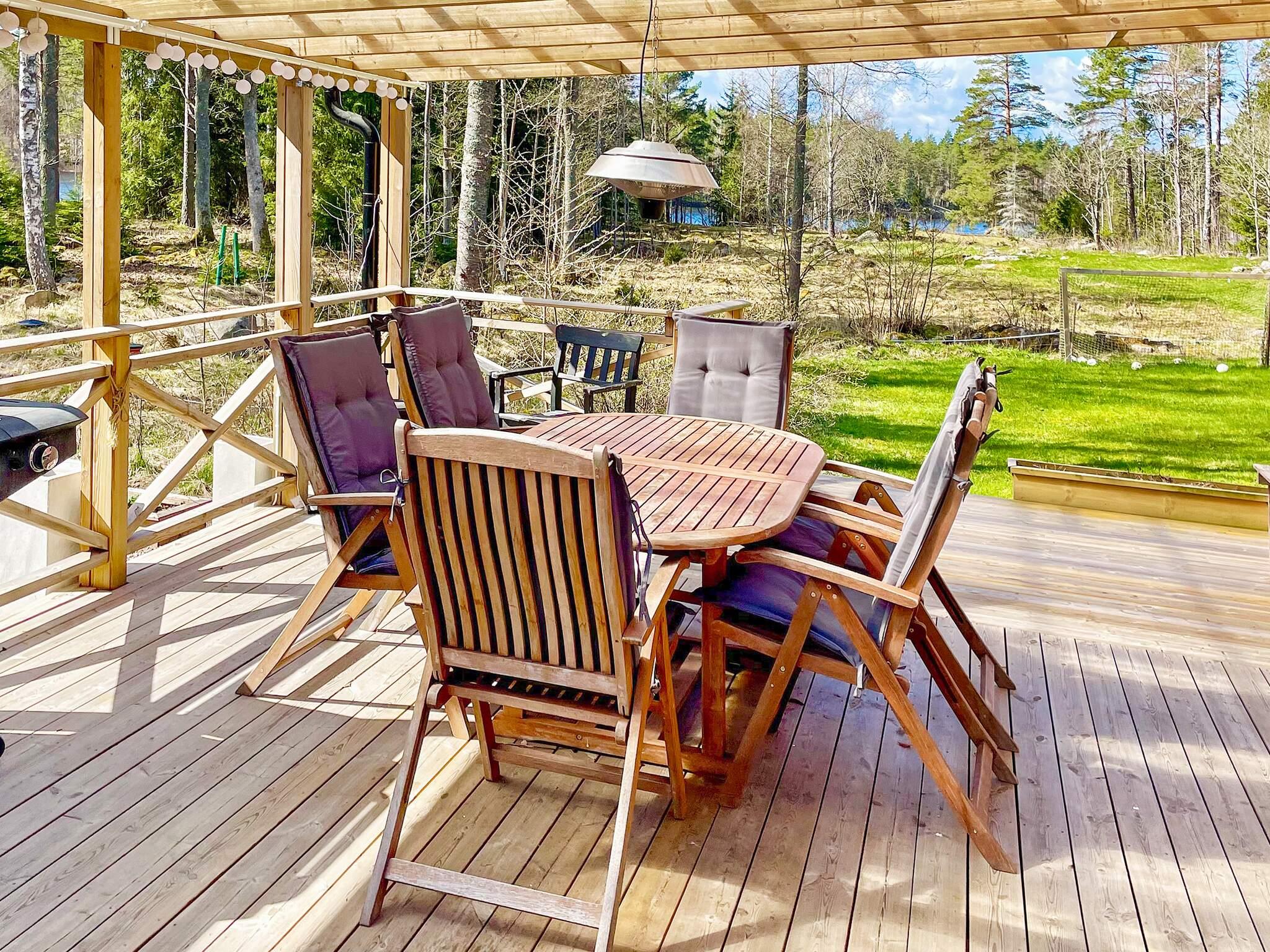 Das Ferienhaus ist in gutem Zustand und hat eine große, teils überdachte Terrasse mit Gartenmöbeln und einem Grill. Von dort können Sie den See in der Ferne wunderschön funkeln sehen.