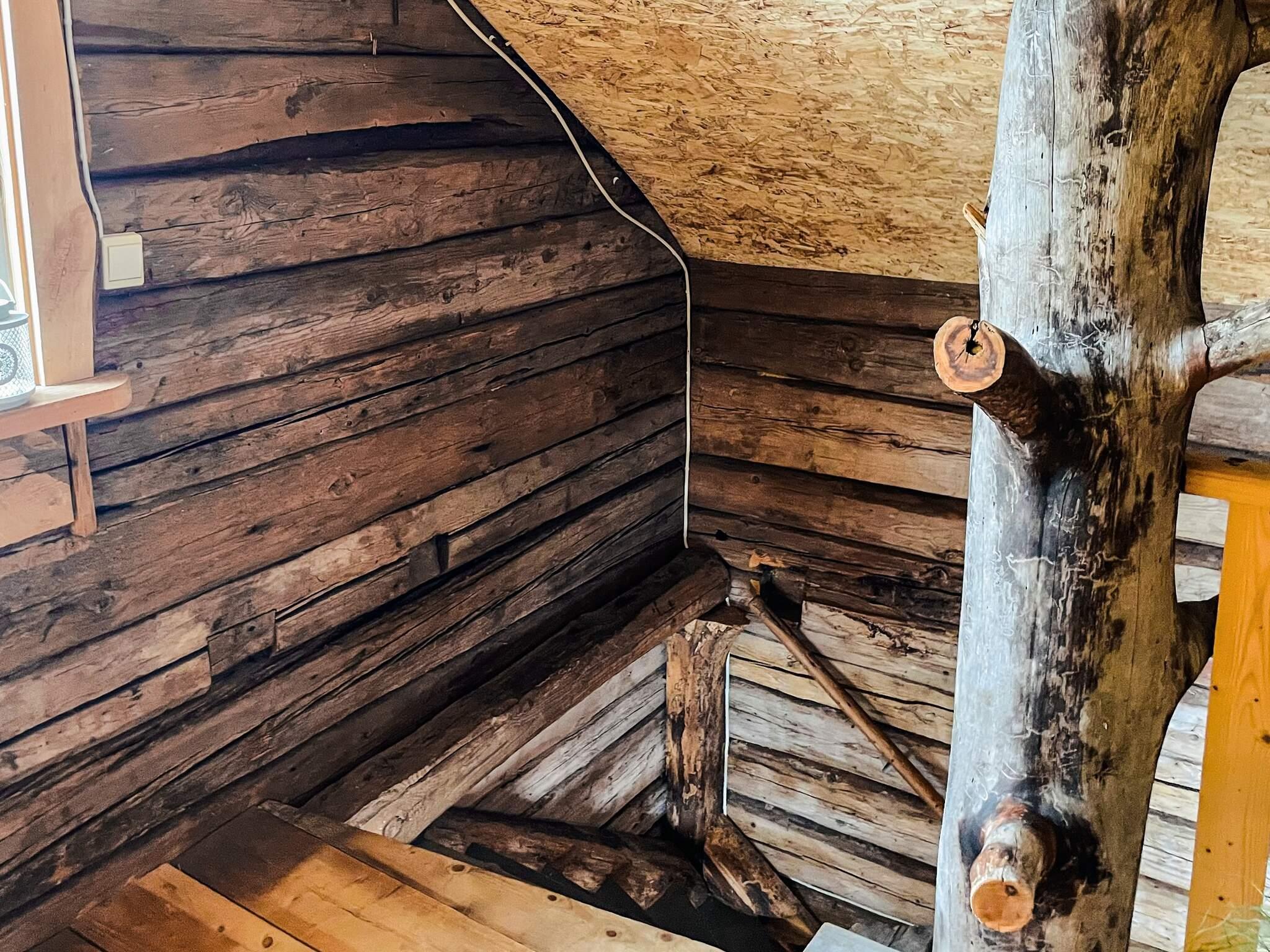 Im Obergeschoss, erreichbar über eine steile Treppe, befinden sich zwei Einzelbetten. Im angrenzenden Zimmer steht ein Doppelbett für zwei weitere Personen bereit. Hier gibt es viel Platz, allerdings ist die Deckenhöhe durch die Dachschräge etwas eingeschränkt.