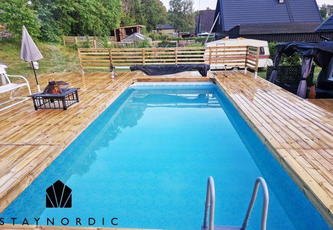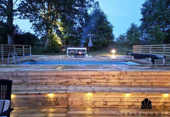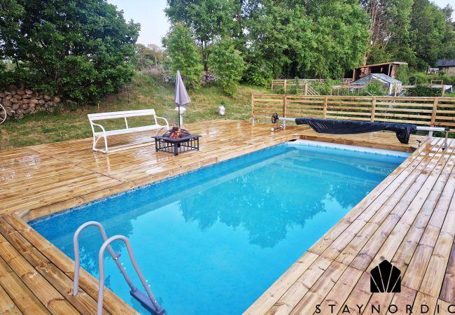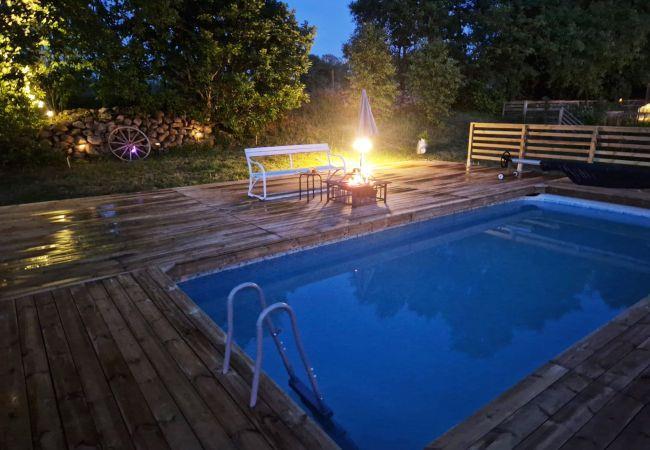 Outside, there is a terrace with garden furniture and a grill, where you can enjoy outdoor meals and delightful summer evenings. The garden is a place for relaxation with a private pool for refreshing dips and a cozy little spot with a fire pit, perfect for gathering around a fire and enjoying starry nights.