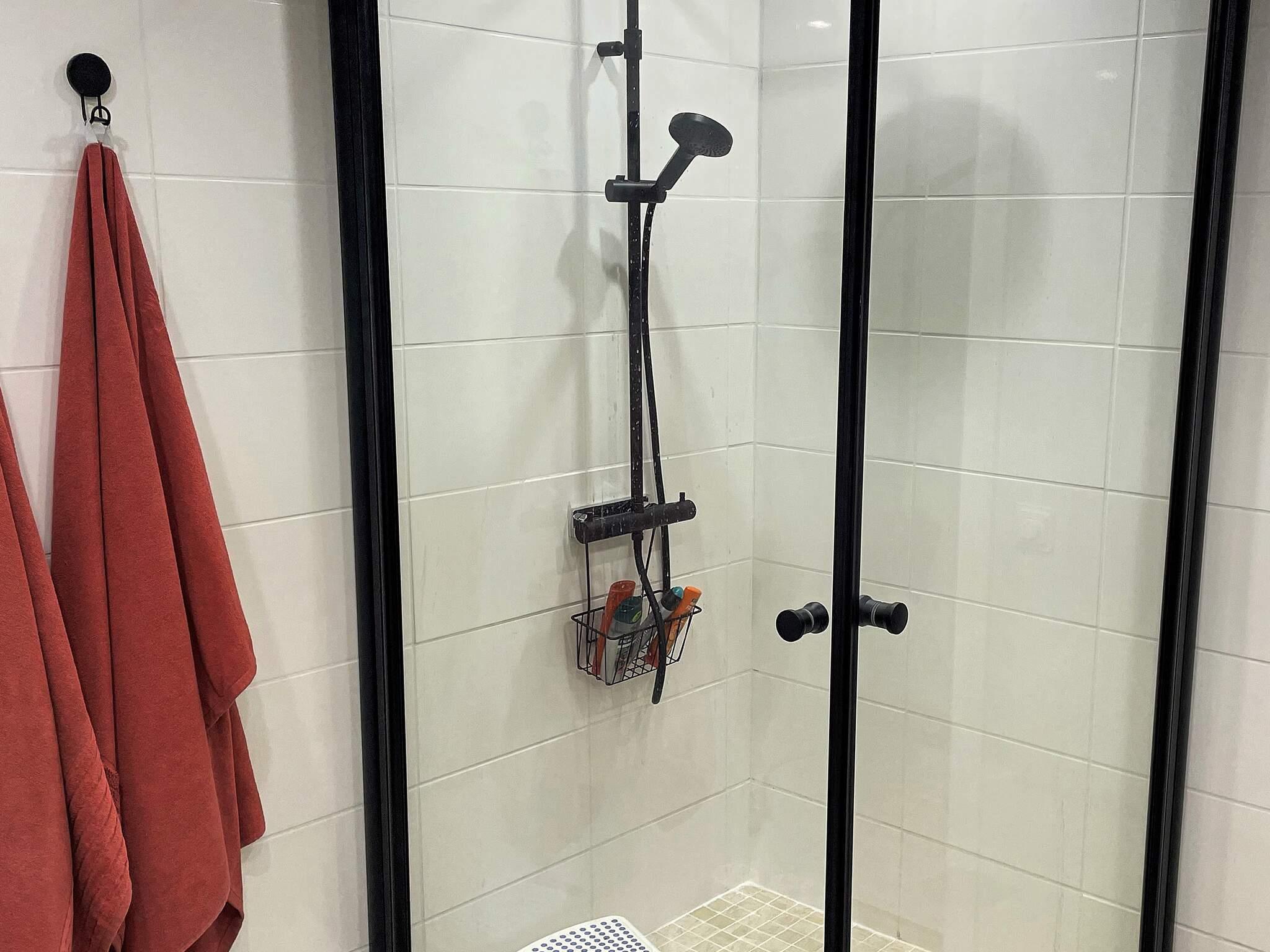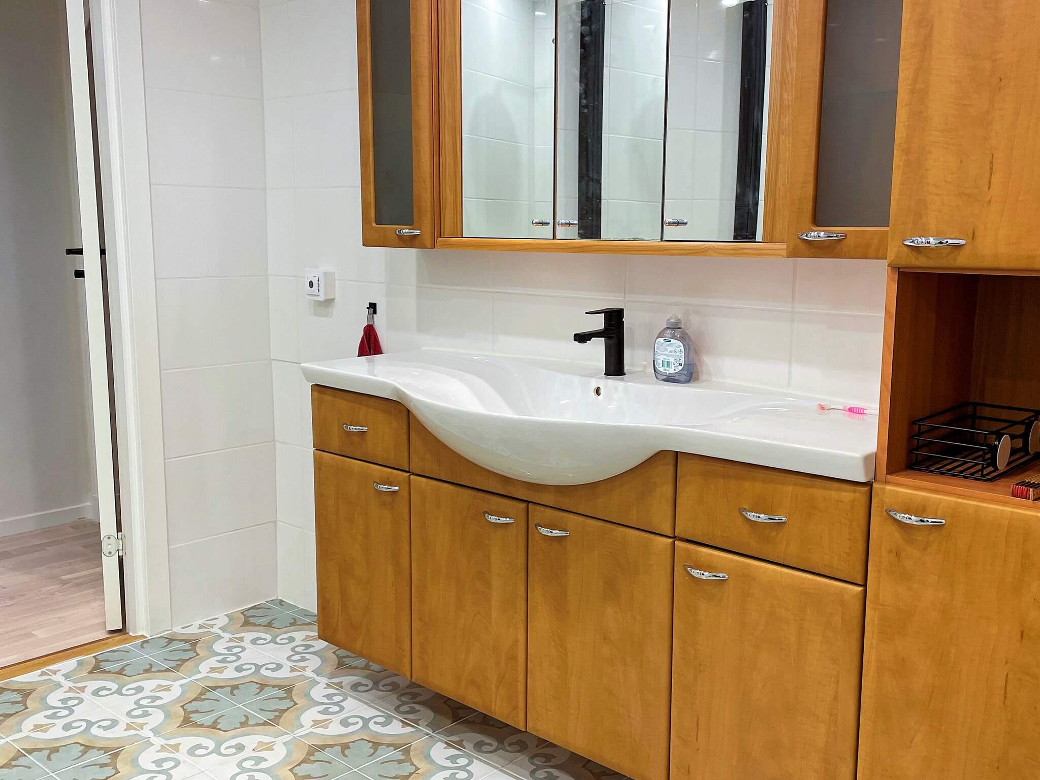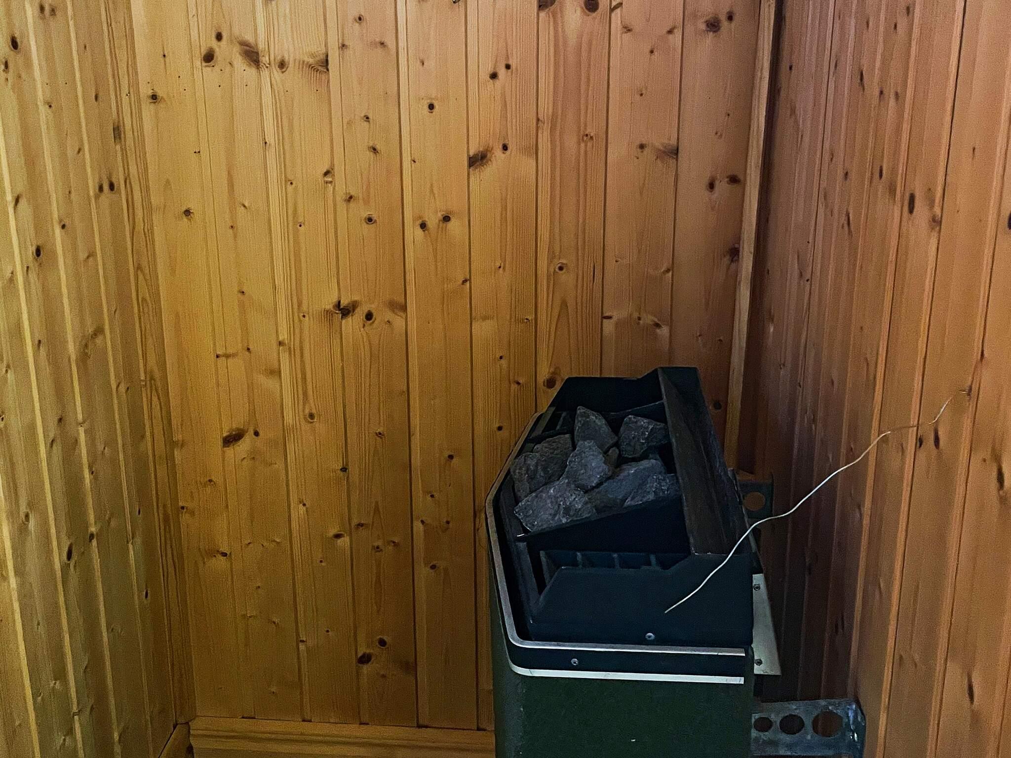 Sie betreten das Haus durch den Eingang an der Vorderseite und werden von einer schönen hellen, geräumigen Diele empfangen. Geradeaus geht es durch den Flur zum Badezimmer mit Fliesenboden und einer großzügigen Dusche, Toilette und Waschbecken. Rechts vom Badezimmer befindet sich eine kleine Sauna für 2 Personen. Links im Bad stehen Waschmaschine und Wäschetrockner bereit.