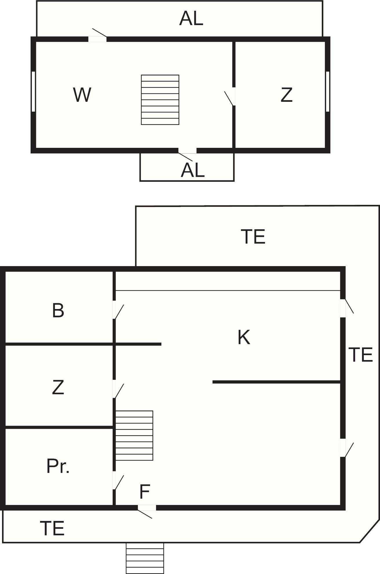 Durch das Tor an der Vorderseite des Hauses gelangt man auf die Holzterrasse, die das Haus an drei Seiten umgibt. Der Eingangsbereich ist geräumig und offen zum kombinierten Wohn- und Küchenbereich hin. Ein Kaminofen sorgt für Wärme und Gemütlichkeit. Die Küche ist für Selbstversorger ausgestattet und bietet Platz für alle am Essbereich. Zwei Ausgänge führen hinaus auf die Terrasse, wo sich Grill und Gartenmöbel für gemeinsame Mahlzeiten befinden. Im Erdgeschoss befindet außerdem sich ein Schlafzimmer mit Etagenbett für zwei Personen.
