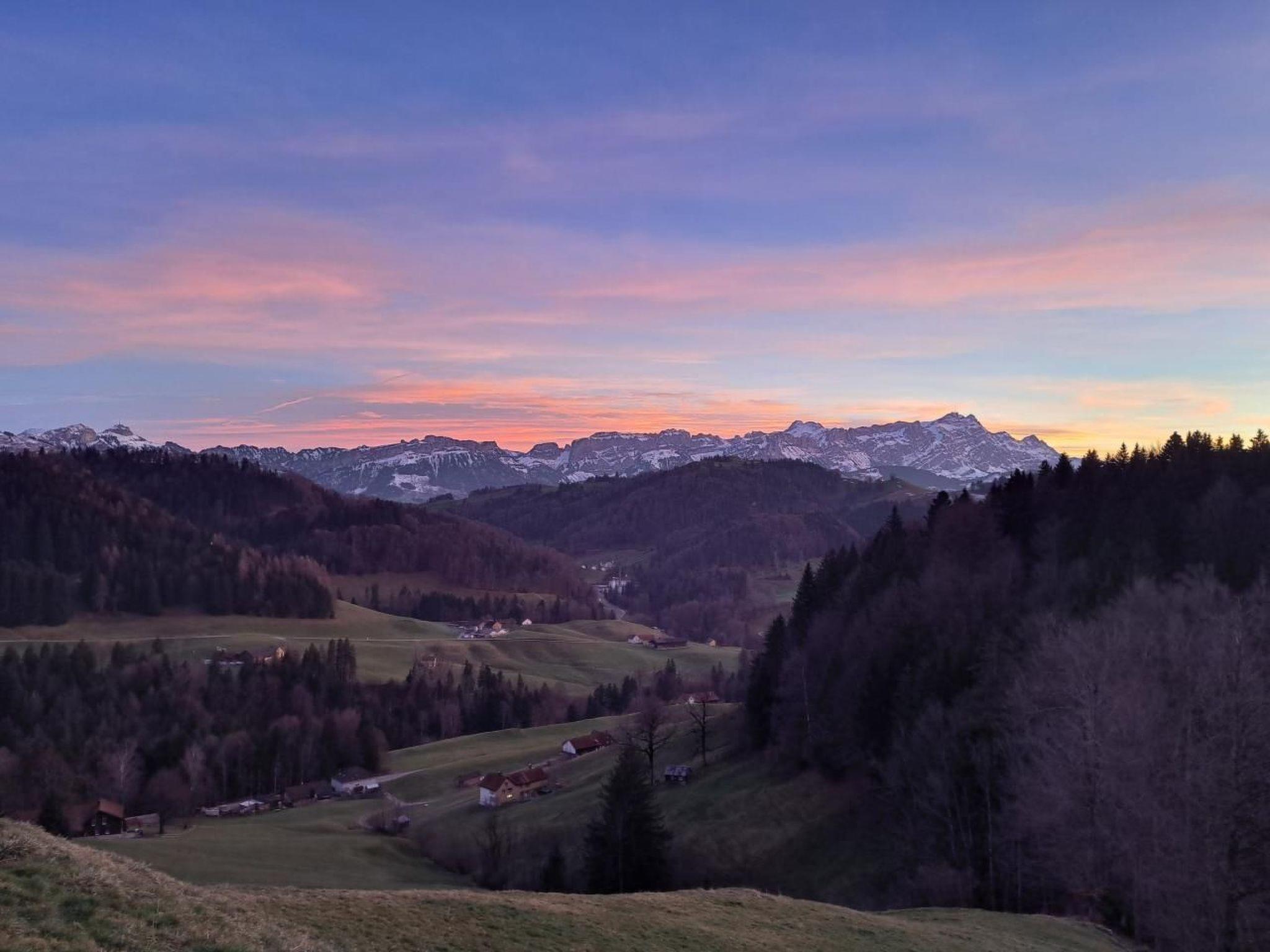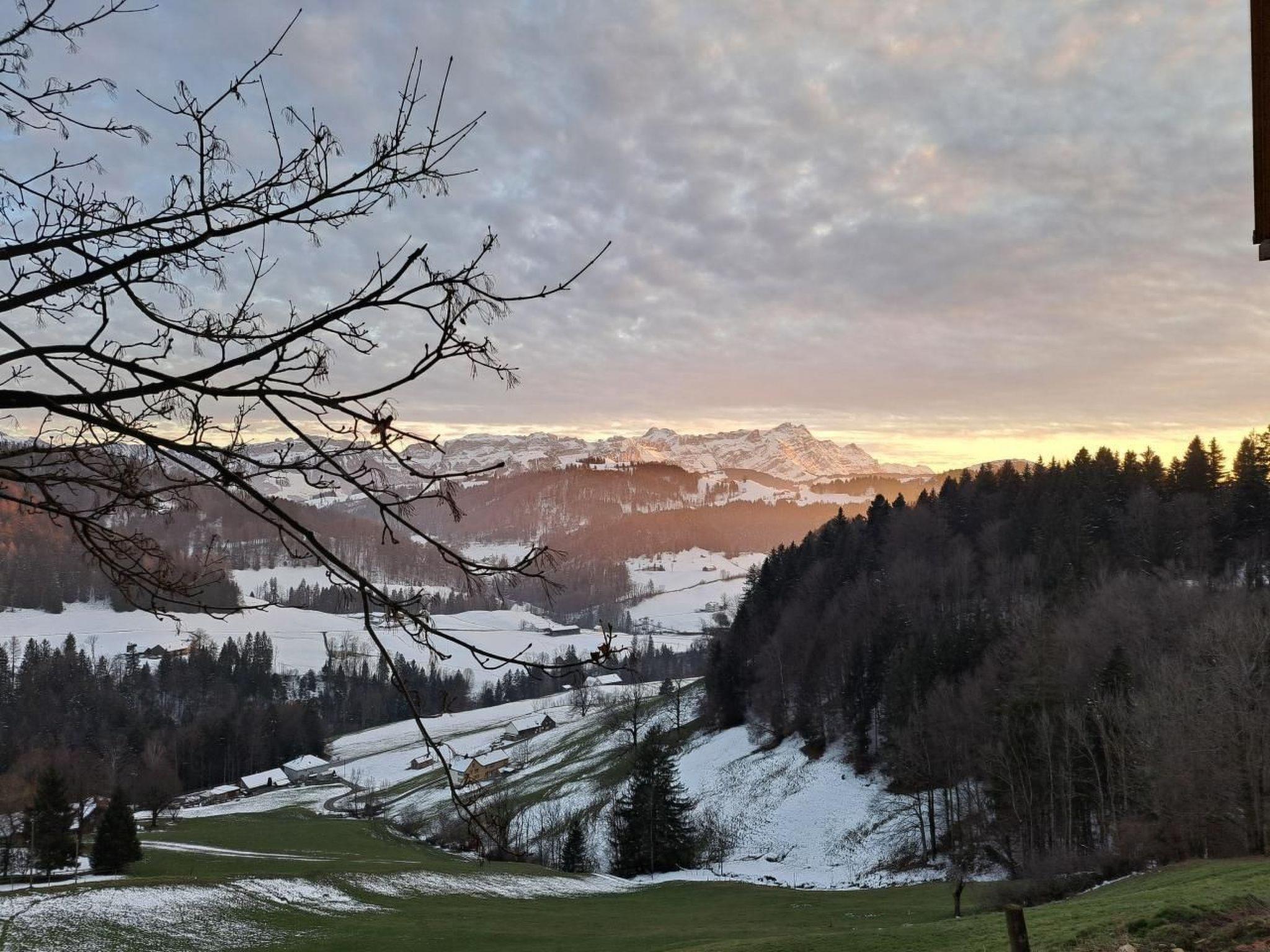In our cosy Sennenstübli at 1000m above sea level, the Alpstein is closer to you than ever before. The small chalet with its optimally equipped kitchen, a bathroom with WC and shower, the bedroom with double bed and the small cosy parlour with TV and radio invites you to linger. However, we recommend the panoramic TV programme on the Alpstein. Above the parlour there is a dormitory that can accommodate up to three people. The large garden and terrace provide space to relax and enjoy nature. You can enjoy beautiful sunrises and sunsets with a view of the Alpstein. The breathtaking view over the Alpstein, hills and countryside also invites you to hike, do sports and go for walks. The cottage is perfectly located for hikes or winter sports holidays with snowshoeing, cross-country skiing or sledging. If you like it simple and close to nature, you've come to the right place. With us you can escape from everyday life and get a taste of country life. You are also welcome to take a look at our farm, not far from the holiday home. Fresh milk directly from the cow and eggs from our chickens can be obtained from us, the holiday home is located outside the village there is a one-way street to the house. Please note that a 4x4 car is necessary in winter.
