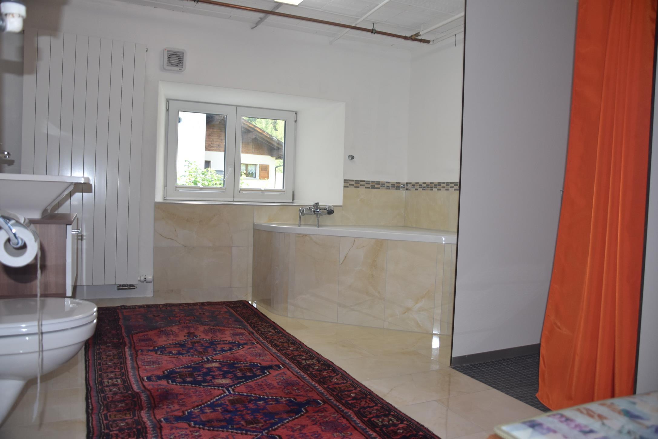 Grosses Badezimmer mit einer Eckbadewanne, 2 Duschkabinen und WC. Im 3. Obergeschoss befindet sich ein weiteres Badezimmer mit WC.