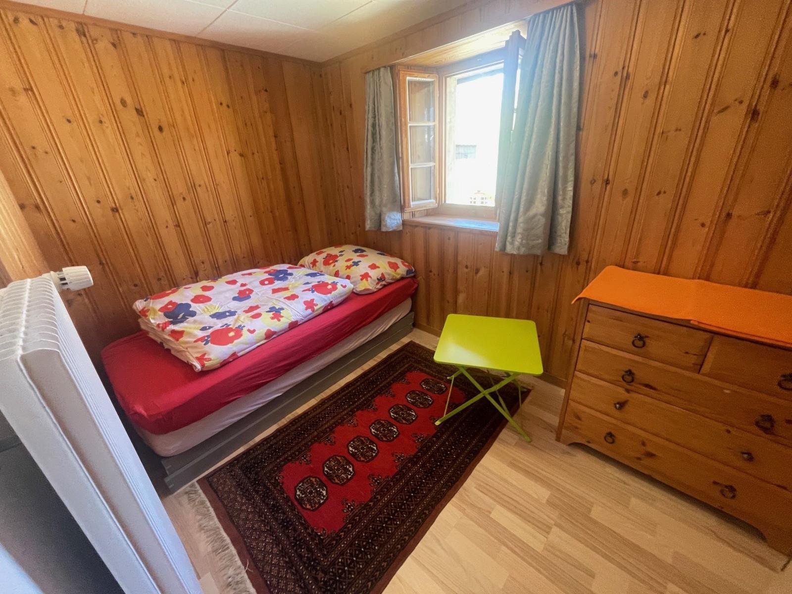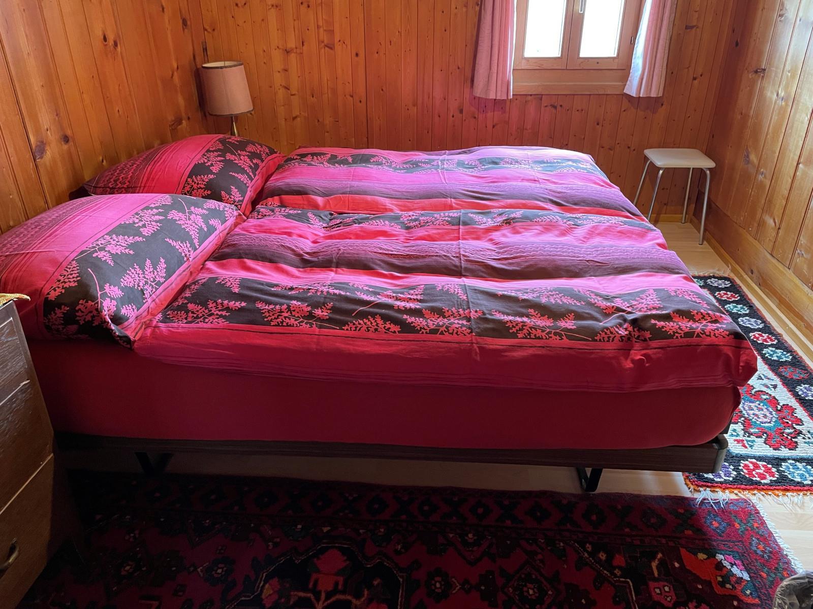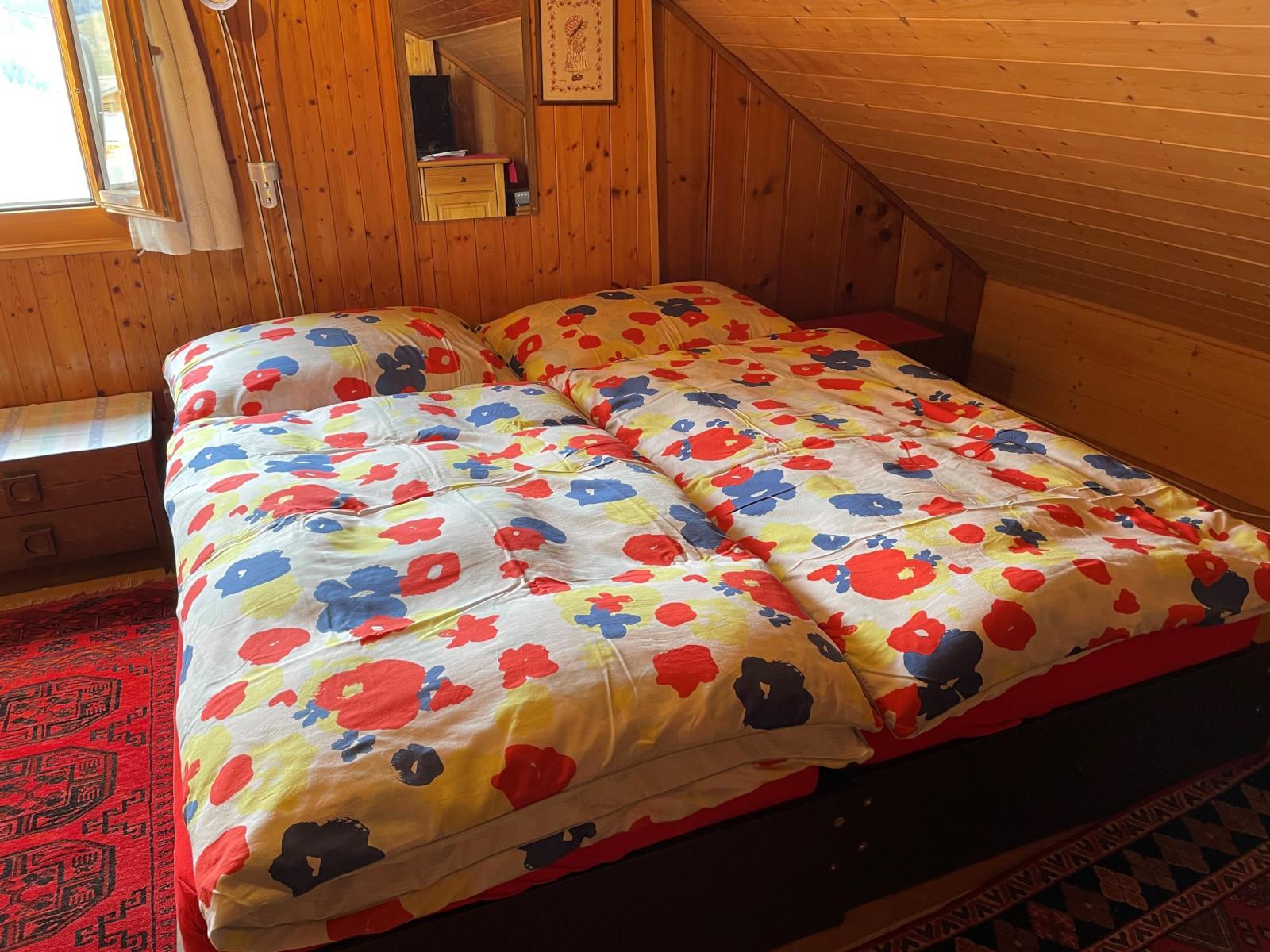 Die Wohnung bietet ein Schlafzimmer mit Doppelbett und ein Schlafzimmer mit zwei Einzelbetten. Im 3. Obergeschoss sind 3 weitere Doppelzimmer und ein Dreibettzimmer. Diese Zimmer erreicht man über eine Treppe ausserhalb der Wohnung. Alle Zimmer sind mit genügend Abstellplatz ausgestattet, das eine Doppelzimmer im 3.Obergeschoss ist zusätzlich noch mit TV ausgestattet. Bettwäsche vorhanden und im Preis nicht inbegriffen. Wohnzimmer: