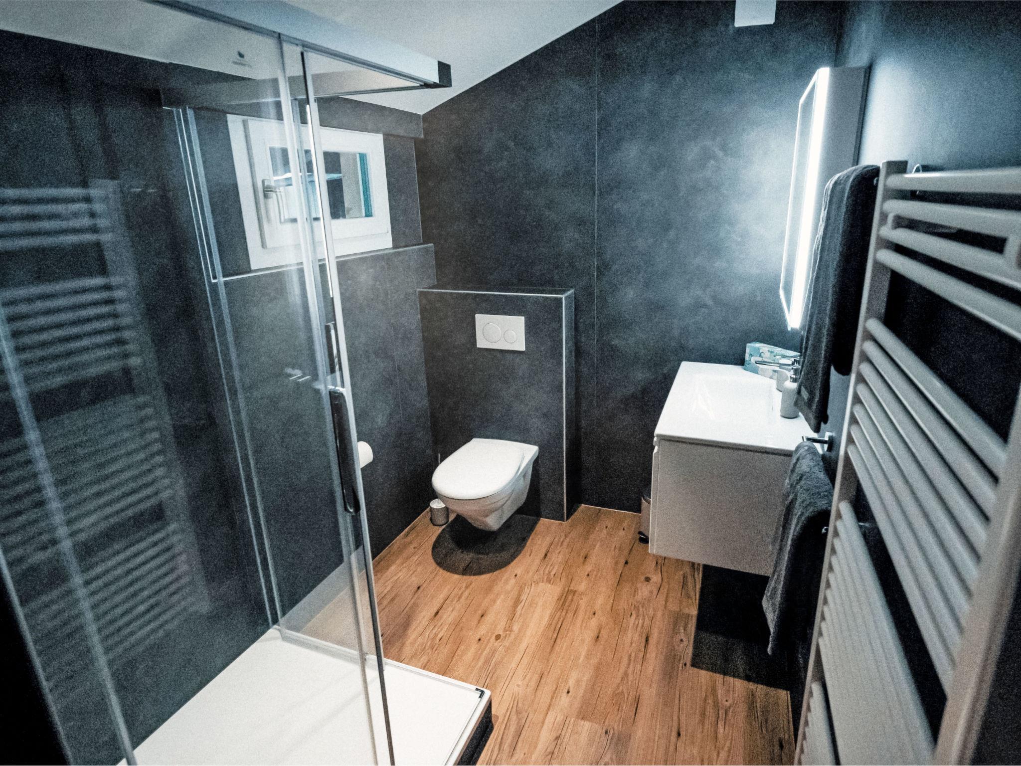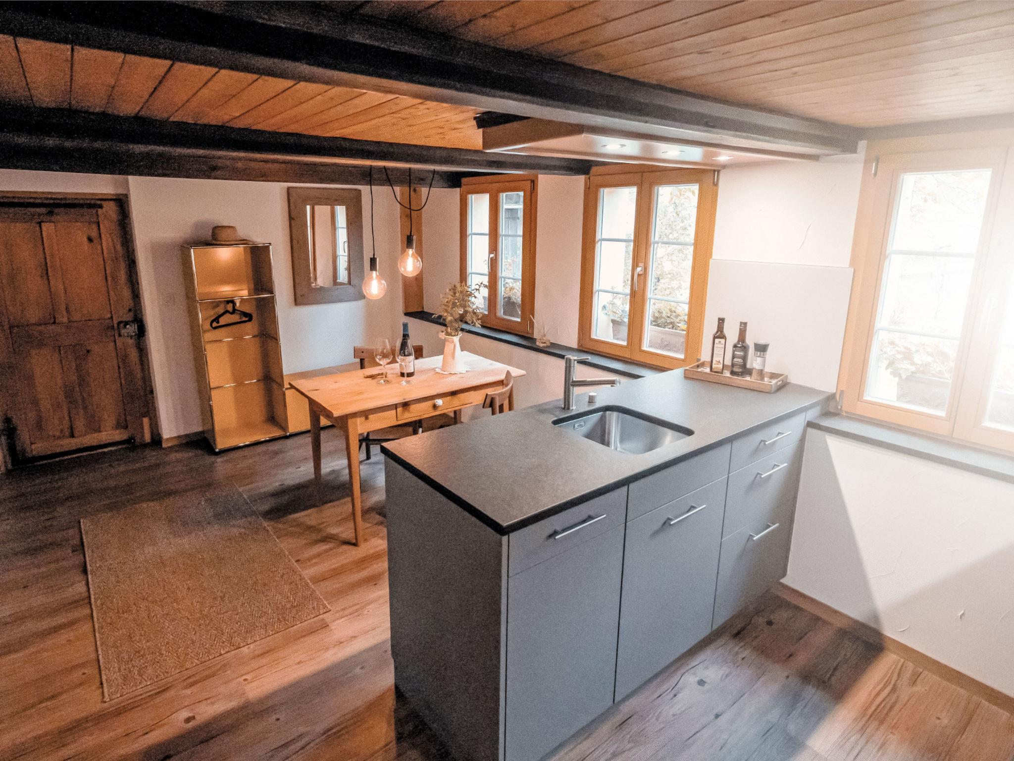 3-room apartment 100 m2, on the ground floor. Spacious, fully renovated in 2024, luxurious and tasteful furnishings: large living/dining room with dining table and digital TV. 1 large double bedroom with 1 double bed (180 cm, length 200 cm), shower/WC. Open kitchen (oven, dishwasher, 4 induction hot plates, toaster, kettle, raclette grill, fondue Set (chinoise, cheese)) with dining table. Wood heating. Wooden floors. Terrace, large patio. Terrace furniture, deck chairs. Marvellous view of the mountains and the countryside. Facilities: baby cot for up to 2 year olds (extra), hair dryer. Internet (WiFi, free). Parking. E-charging station. Please note: non-smoking house. Fire extinguisher.