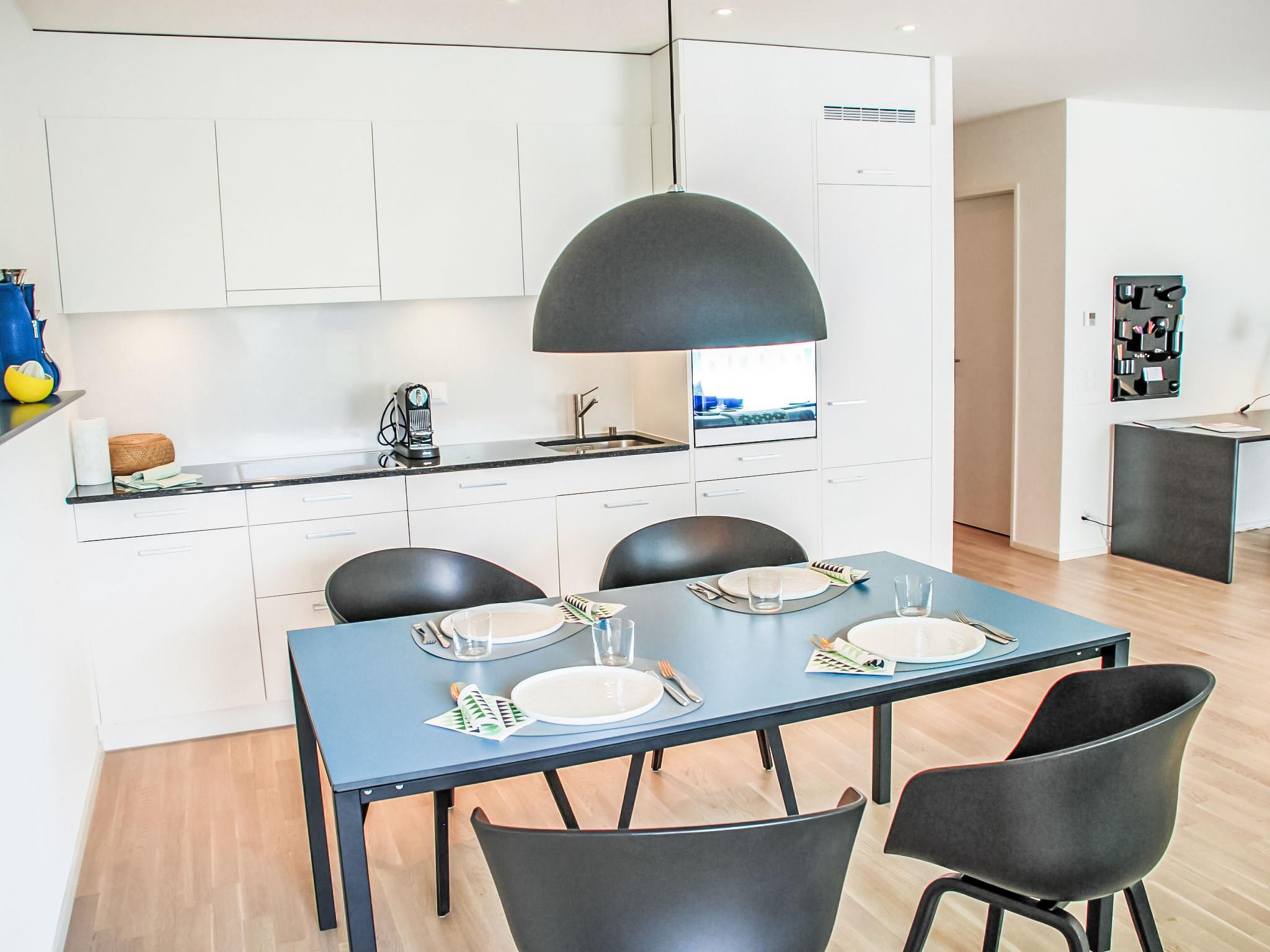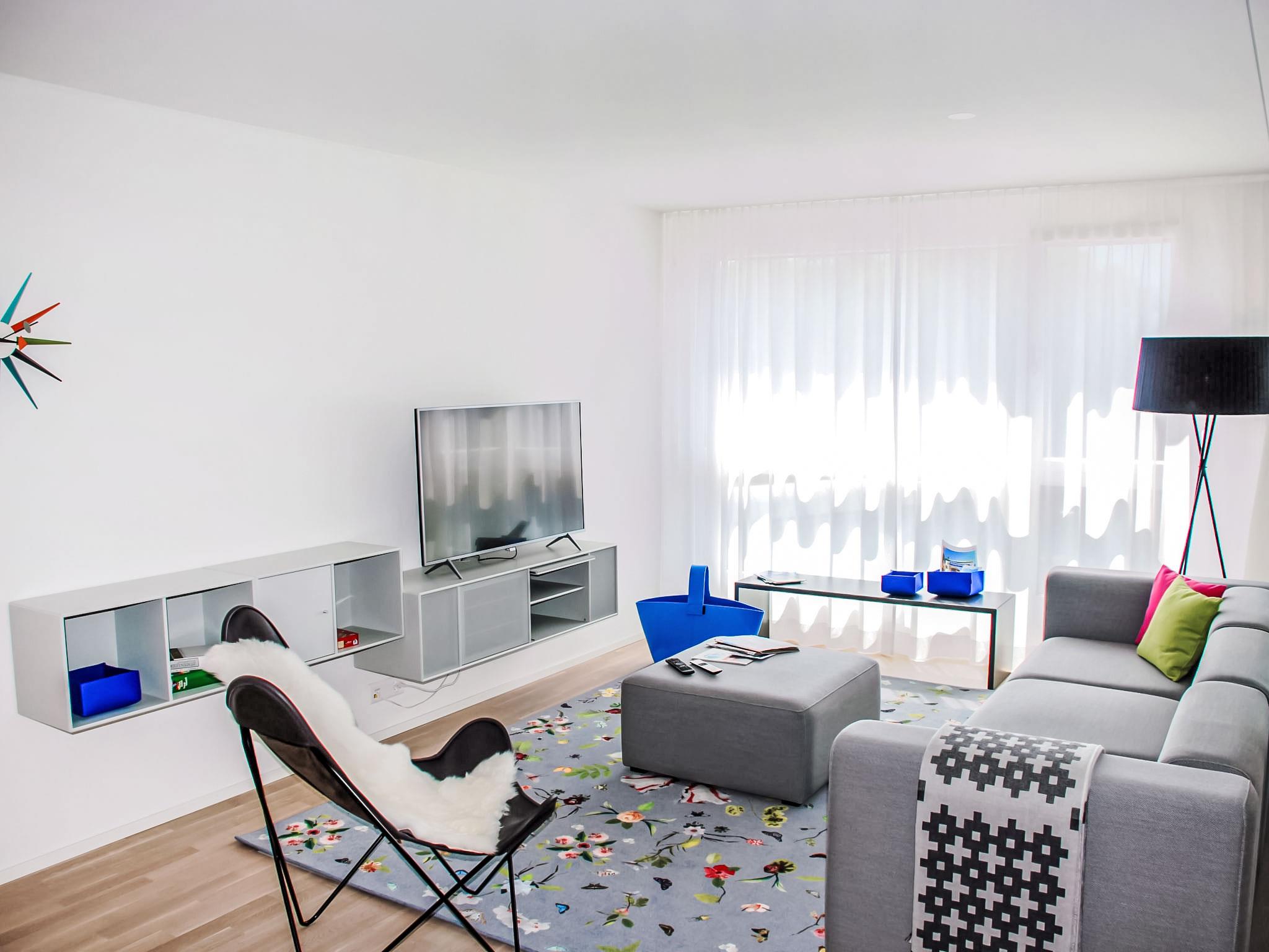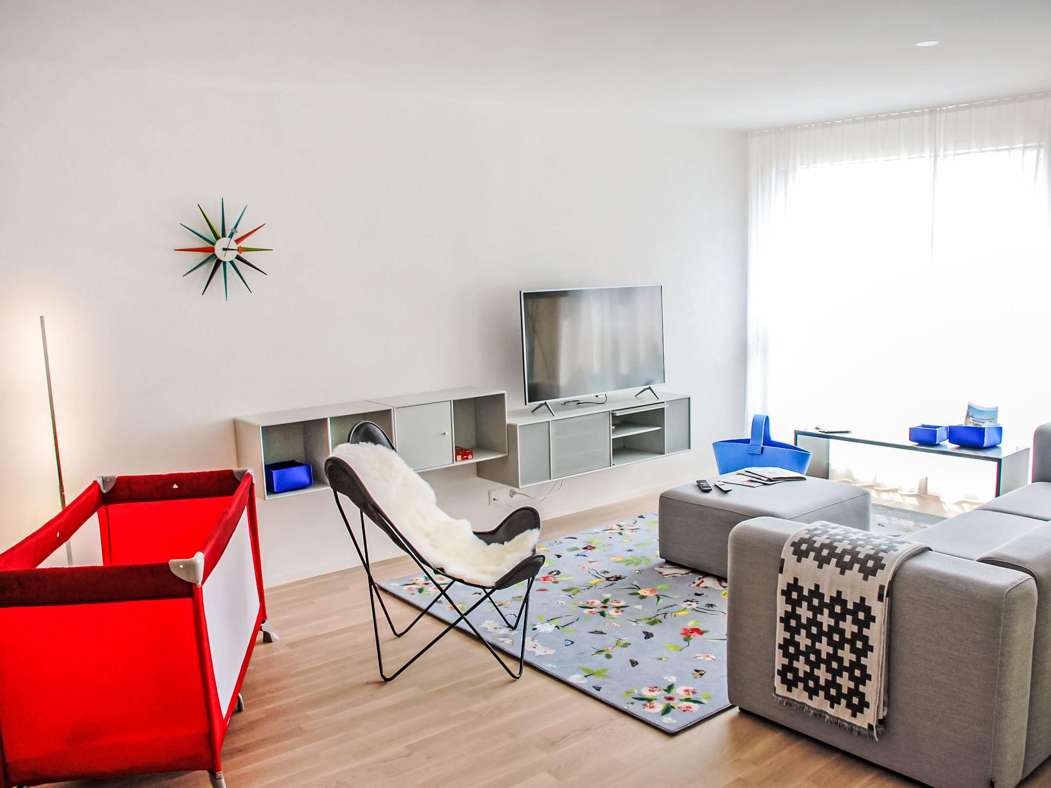 "LaVille A-4-3", 3-room apartment 89 m2 on 4th floor, south-west facing position. Spacious and bright, modern and tasteful furnishings: open large living/dining room with satellite TV and flat screen. 1 double bedroom with 1 double bed (2 x 90 cm, length 200 cm). 1 room with 2 beds (90 cm, length 200 cm). Open kitchen (oven, dishwasher, 4 induction hot plates, freezer, electric coffee machine, Capsules for coffee machine (Nespresso) extra) with dining table. Exit to the balcony. Bath/WC, shower/WC. Floor heating. Balcony 9 m2, south facing position and west facing position. Balcony furniture, deck chairs (1). View of the mountains and the countryside. Facilities: washing machine, dryer, iron, children's high chair, baby cot for up to 2 year olds (extra), hair dryer. Internet (WiFi, free). Parking space n 51 (extra), height 210 cm, width 230 cm. Please note: non-smokers only. NL-00006857
