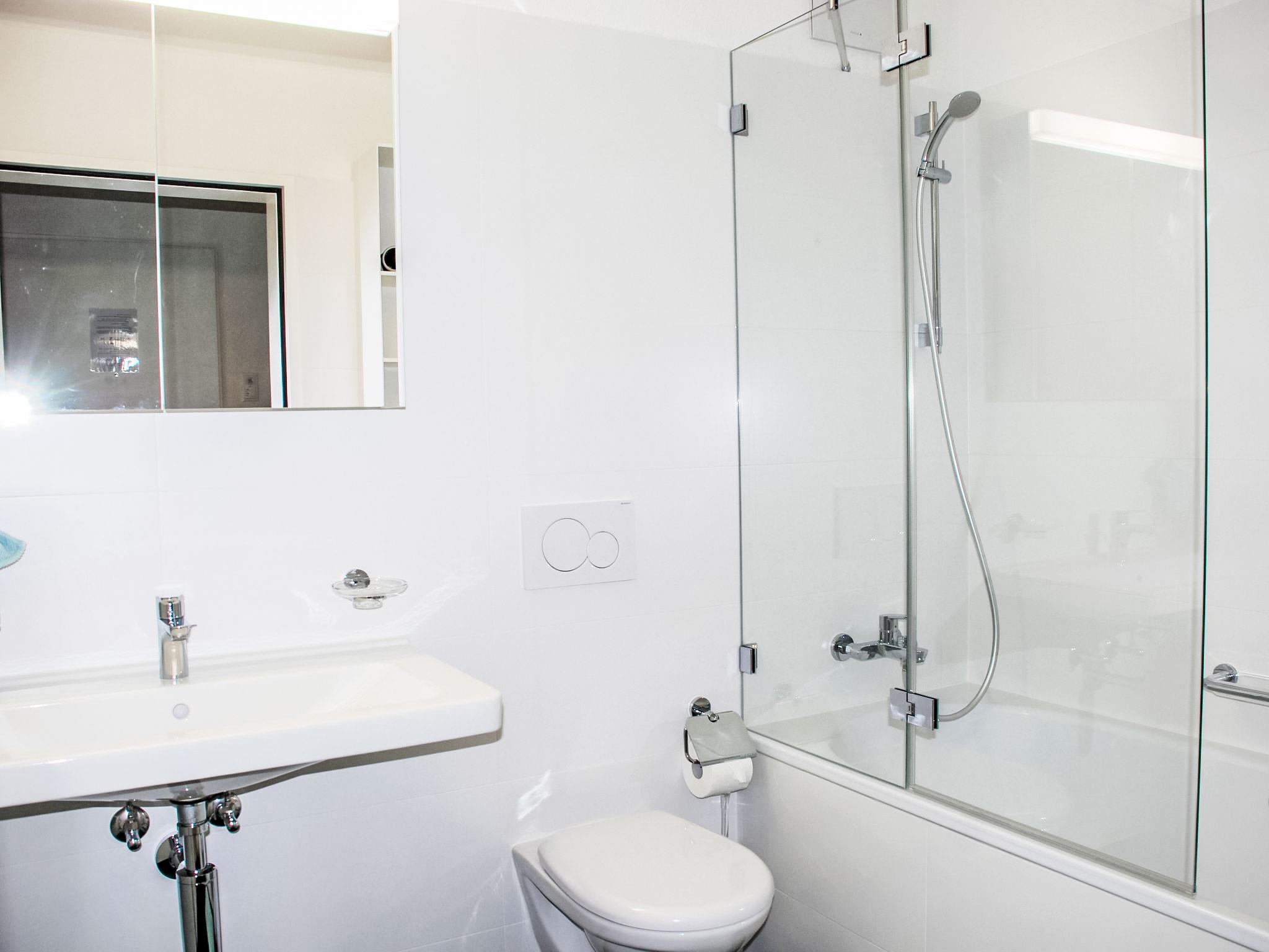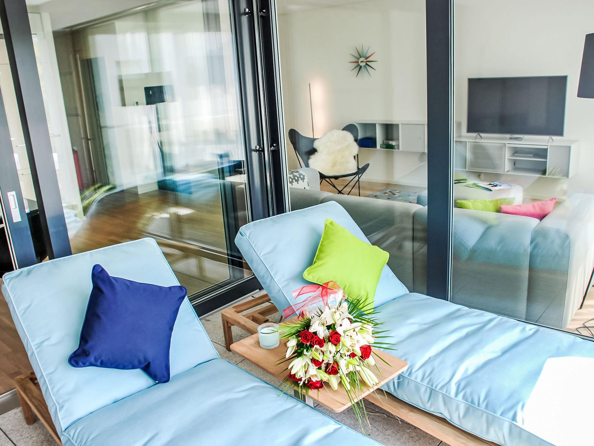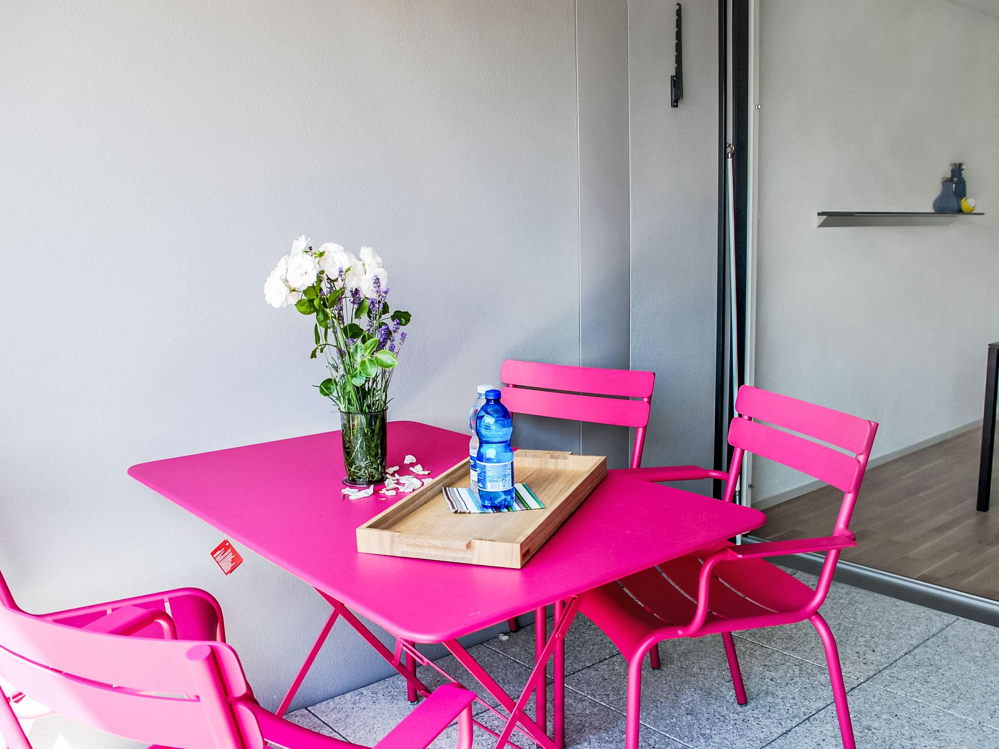 "LaVille A-4-3", 3-room apartment 89 m2 on 4th floor, south-west facing position. Spacious and bright, modern and tasteful furnishings: open large living/dining room with satellite TV and flat screen. 1 double bedroom with 1 double bed (2 x 90 cm, length 200 cm). 1 room with 2 beds (90 cm, length 200 cm). Open kitchen (oven, dishwasher, 4 induction hot plates, freezer, electric coffee machine, Capsules for coffee machine (Nespresso) extra) with dining table. Exit to the balcony. Bath/WC, shower/WC. Floor heating. Balcony 9 m2, south facing position and west facing position. Balcony furniture, deck chairs (1). View of the mountains and the countryside. Facilities: washing machine, dryer, iron, children's high chair, baby cot for up to 2 year olds (extra), hair dryer. Internet (WiFi, free). Parking space n 51 (extra), height 210 cm, width 230 cm. Please note: non-smokers only. NL-00006857