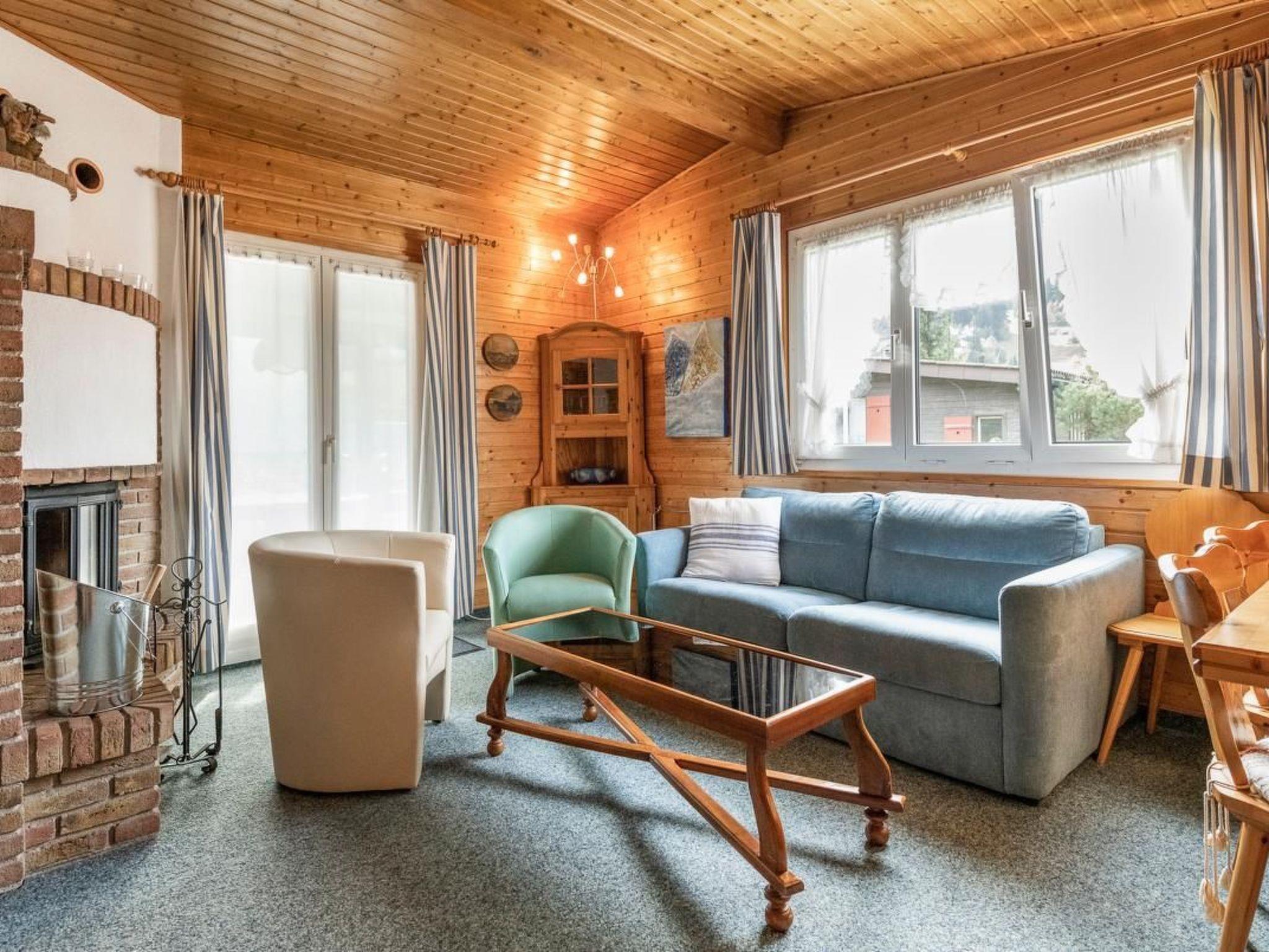 The interior of our chalet comprises a spacious 4 1/2 room flat with a cosy living room with a fireplace and three bedrooms: a master bedroom with a double bed and two further rooms with bunk beds. A small, practical kitchen and a shower with WC are also part of the interior. For your entertainment and convenience, there is a Nespresso coffee machine (capsules available from Volg), a filter coffee machine, an electric water jug, a fondue and raclette oven, a fondue set for Bourguignon, TV with Swisscom radio, WLAN and a video player.
