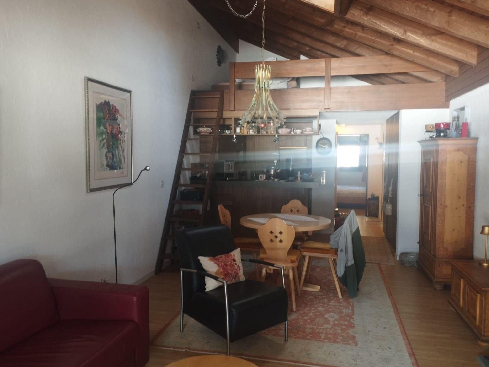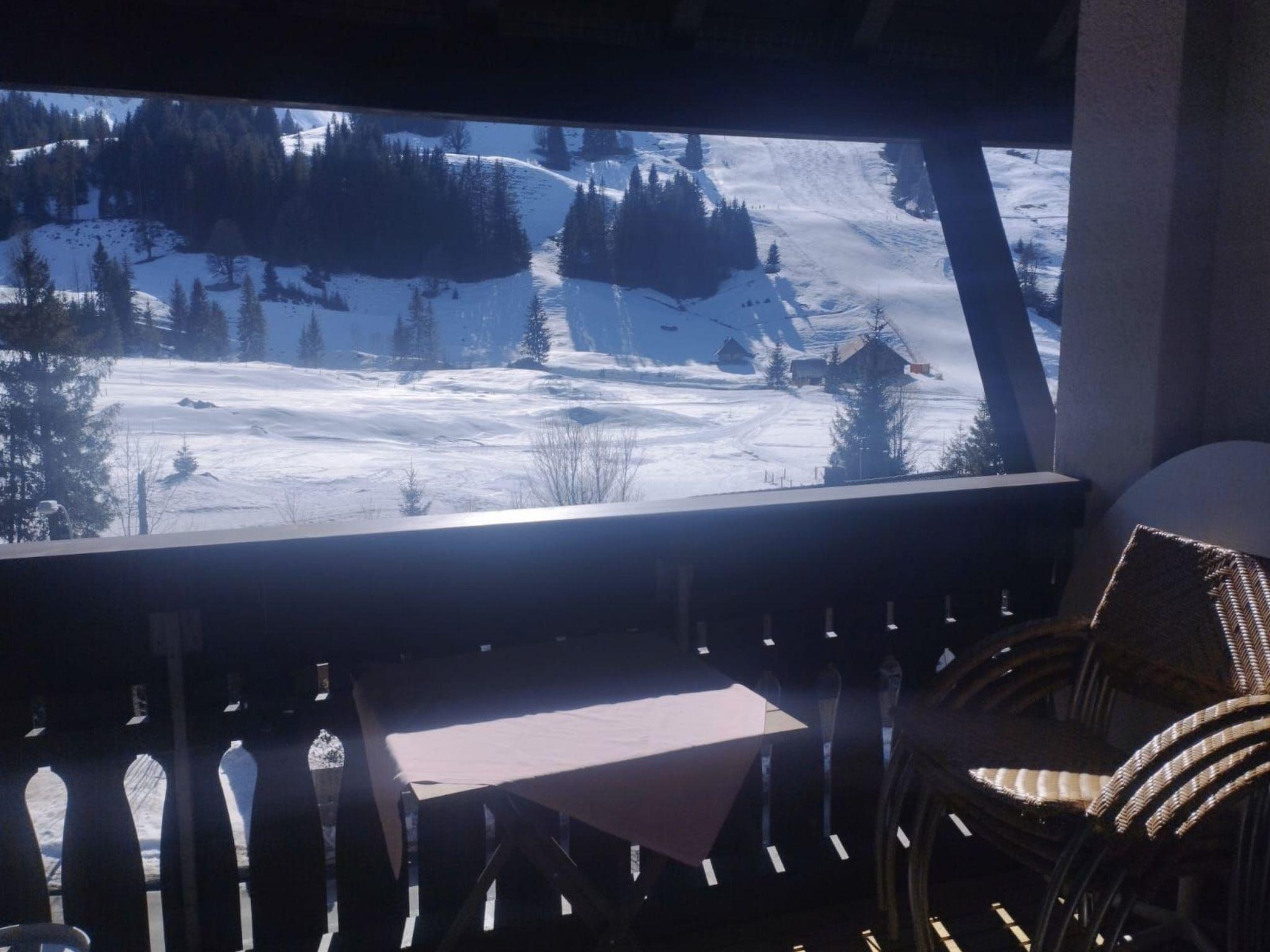 The living room is spacious with an open fireplace and access to the balcony, from which you have a marvellous view of the mountains and the ski area.
