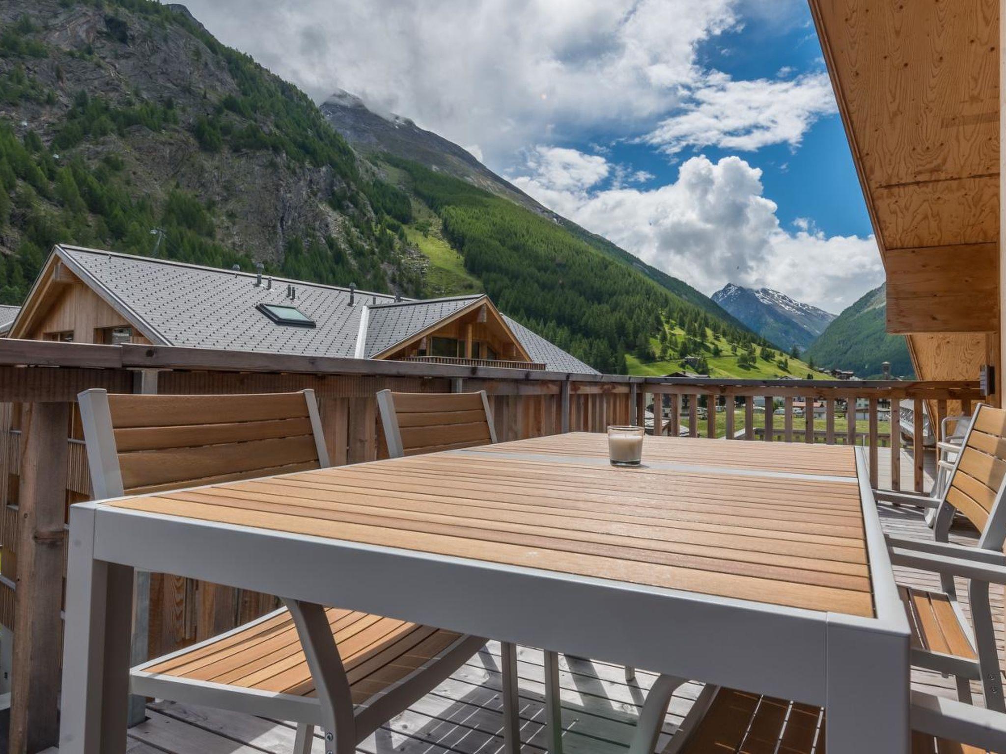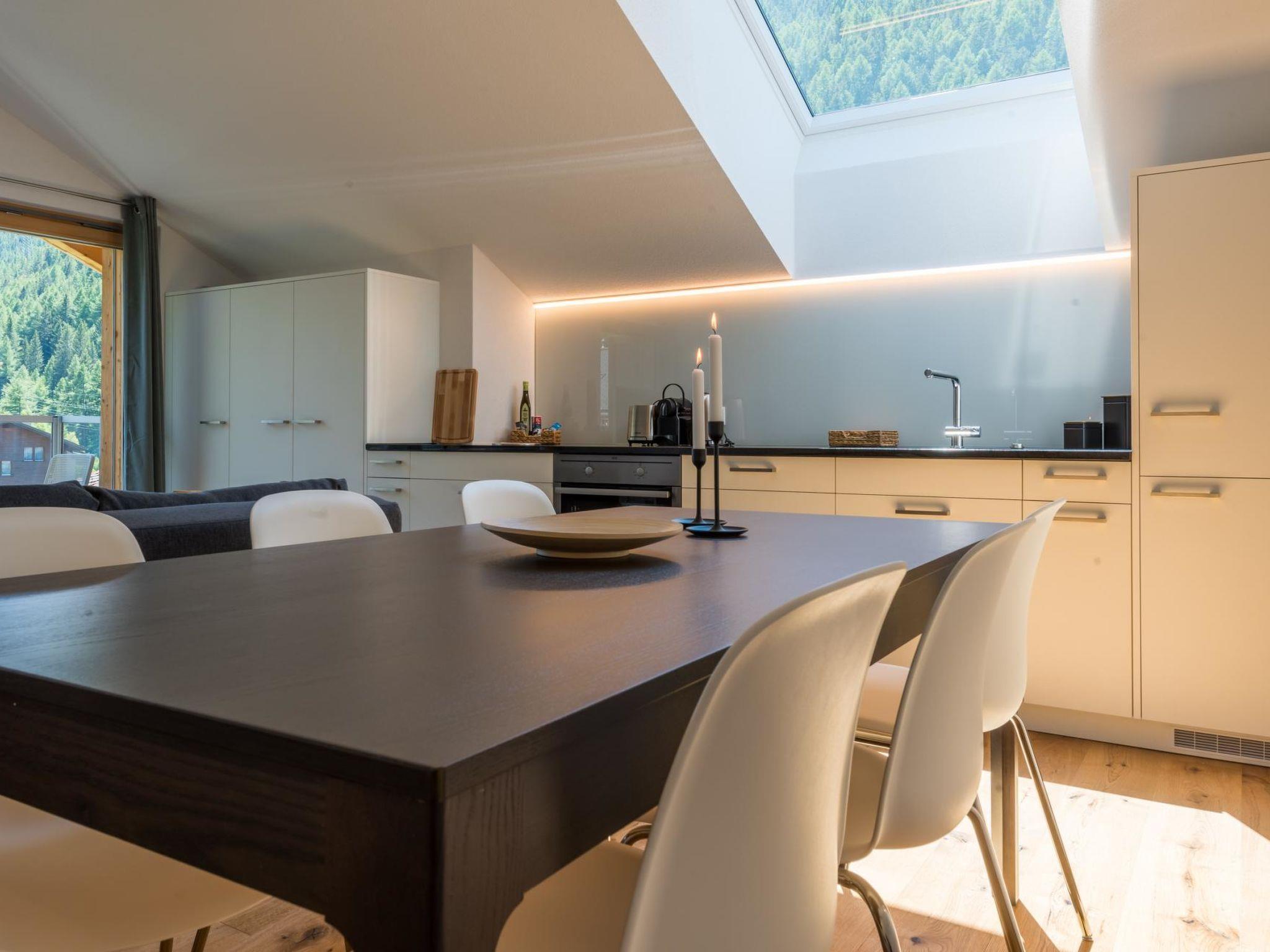 Penthouse apartment with 2 bedrooms and 2 bathrooms (Montela Holiday Stay) Quietly situated apartment (non-smoking) with large terrace, approx. 5 minutes walk from the valley station of the Hohsaas mountain railways. The modern Penthouse apartment with 2 bedrooms and 2 bathrooms for 4-5 people is comfortably and lovingly furnished. The two separate bedrooms each have a double bed. In the living area, the sofa bed (140cm wide) can be used for an additional person. The two bathrooms (with shower/WC and bathtub/WC) and the open kitchen are fully equipped. On the large terrace with garden furniture you can enjoy a magnificent view of the Saas mountains. Free top high-speed WLAN, a private parking space in front of the house (free of charge), a ski and bike room with its own lockable locker as well as a laundry room (for a fee) for shared use in the basement of the house round off the offer. Lift available. Dogs welcome on request. Bedroom with two separable beds (180cm wide in total) or non-separable queen-size bed 160cm.