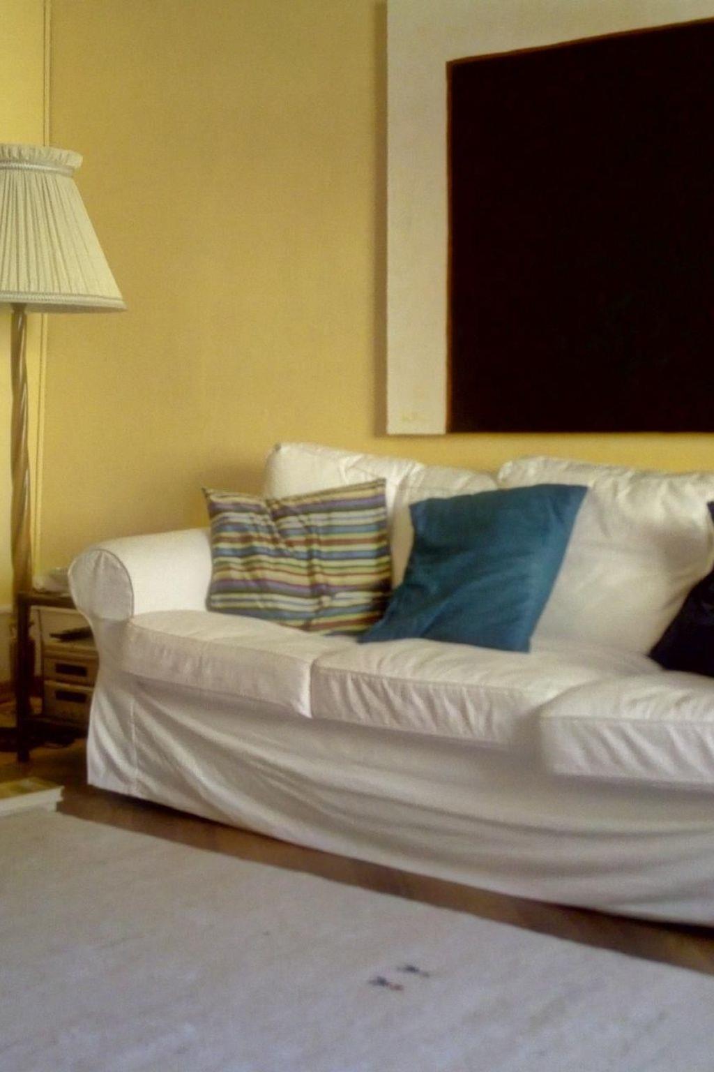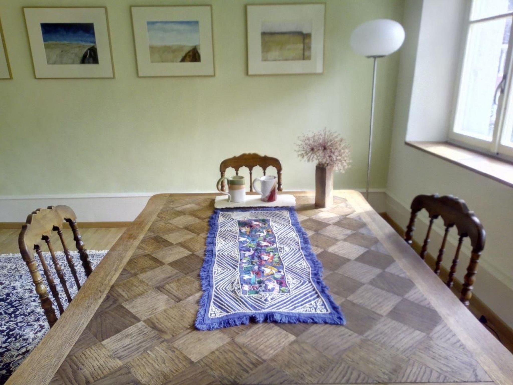 Inside, guests are greeted by a spacious entrance area, which remains pleasantly cool in the hot summer months. To the right is a gallery full of oil paintings and objets d'art to delight the eye. The large kitchen on the first floor offers an inviting table for communal meals, while the adjoining dining area with its large, extendable wooden table, beautiful carpet and pastel and oil paintings creates a cosy atmosphere. Opposite the kitchen, the living area invites you to relax, complemented by a small library for bookworms. The comfort is further enhanced by two wing chairs and a CD player. On the second floor are the bathroom, a large bedroom and a small bedroom, both with ample storage space, including fitted wardrobes and a chest of drawers for comfortable accommodation.