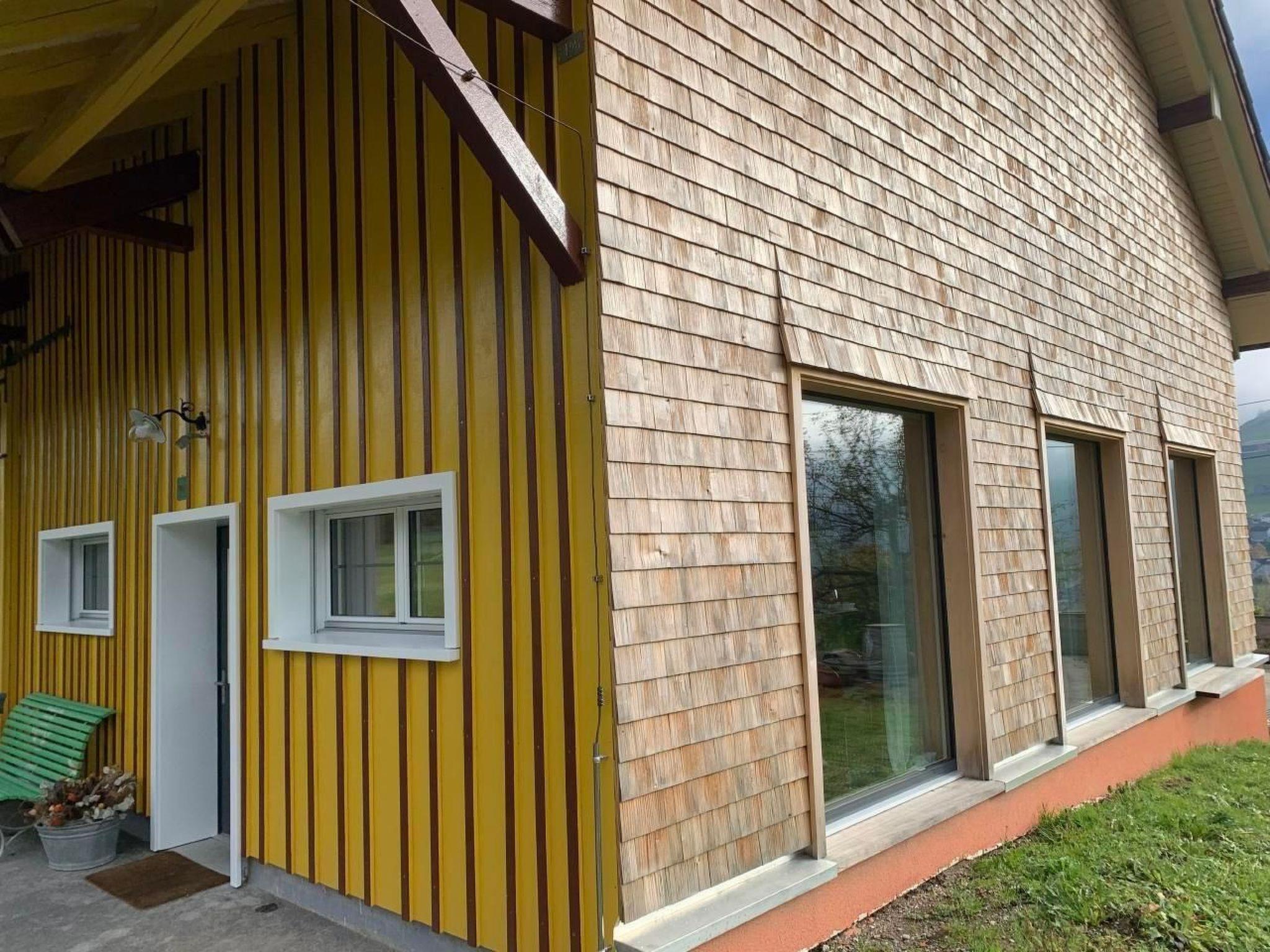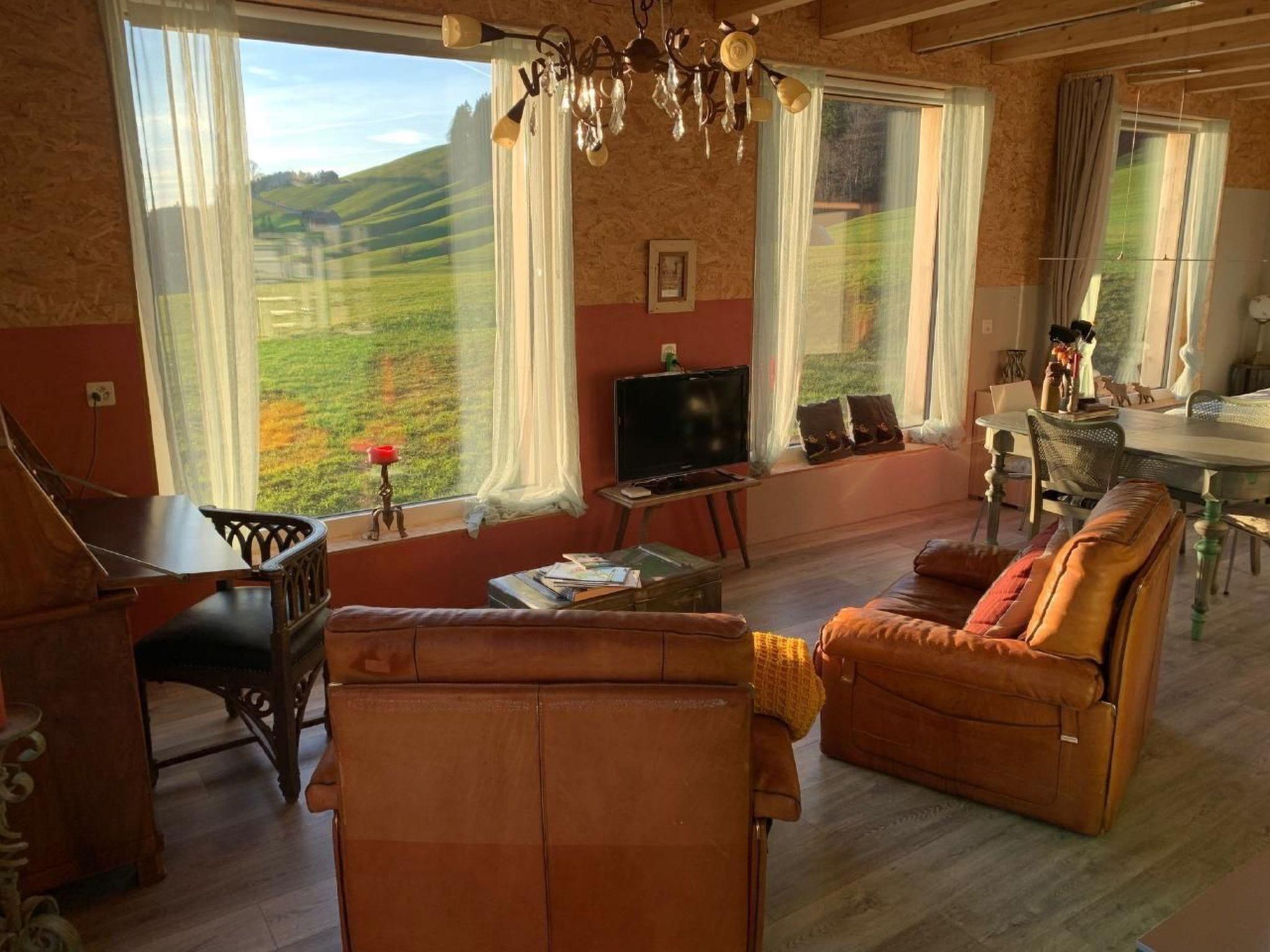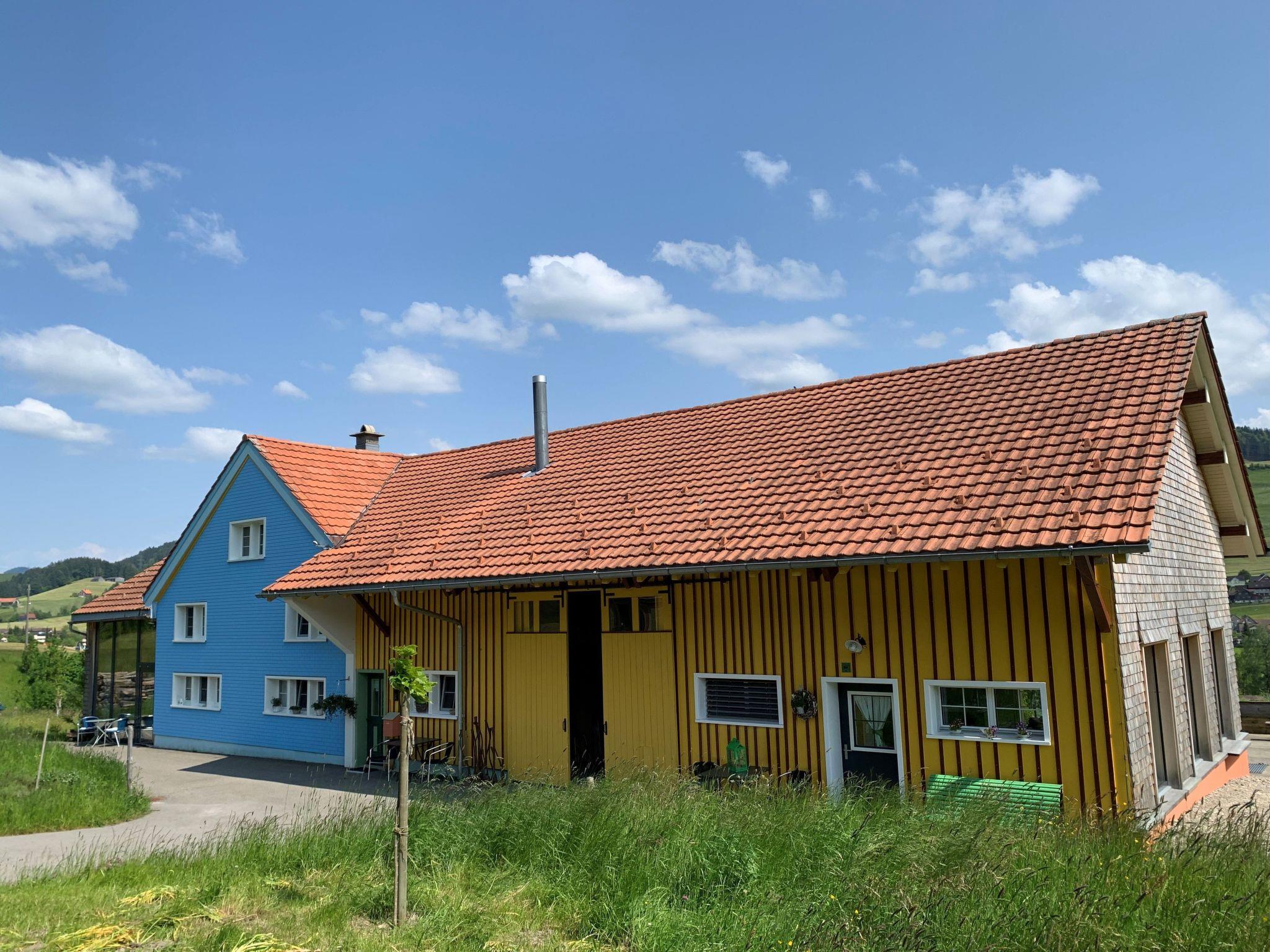 The spacious, loft-like studio (ceiling height 2.90 m) built into the former stable - as a separate part of the house with its own outside entrance and terrace access - offers a wide view of the countryside through its three panoramic windows (no immediate neighbours) and of the starry sky at night. Our farmhouse is within walking distance of the village on the outskirts with a beautiful view of the village of Schönengrund and the surrounding area. At the rear, with a view of the Way of St James, you feel as if you are on an alpine pasture and yet you are within walking distance of the bakery, butcher's, grocery shop and country shop. You can also retreat to our forest with stream during the day. If you are travelling on the Way of St. James, you can reach us on foot in 15 minutes. If you are travelling by public transport, we will be happy to pick you up at one of the stops.