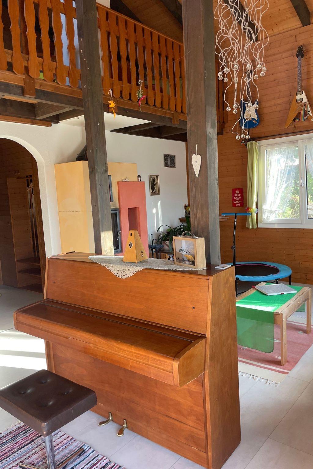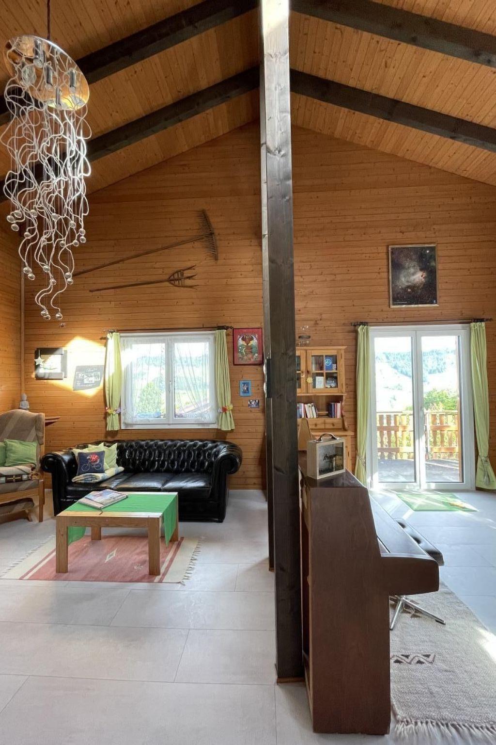 Inside, the chalet awaits you with well thought-out furnishings to make your stay comfortable. A cosy living area with a lounge and dining area allows guests to relax while gazing out over the gently rolling green or white hills. In addition, the mountain spring water provides you with the best quality drinking water straight from the tap. Piano, electric guitars and a diverse collection of literature in German, English and French invite you to find inspiration. Free internet for the home office. Also ideal for creative minds, authors, musicians and composers.