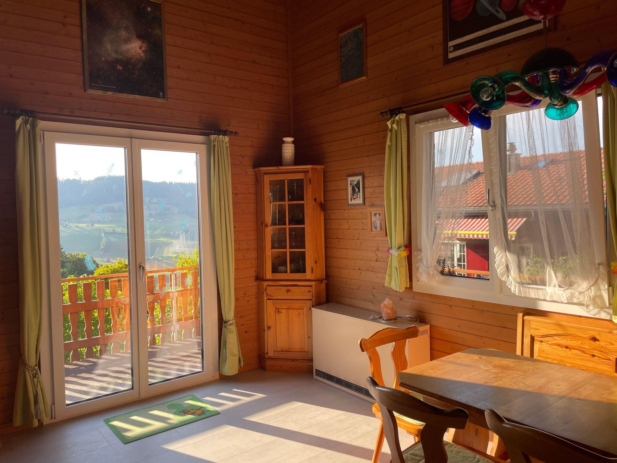 Experience the inspiring tranquillity and generous beauty of Chalet Muse, which invites you to relax and enjoy yourself. Surrounded by the peaceful, expansive landscape of the picturesque Entlebuch. The chalet impresses with its unique, peaceful expanse, with a room height of around 7 metres and a wrap-around balcony offering a breathtaking view of the picturesque Entlebuch. A UNESCO-labelled biosphere with gentle tourism and nature-friendly offers. The perfect setting for an unforgettable stay.