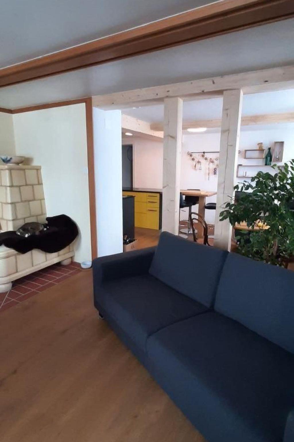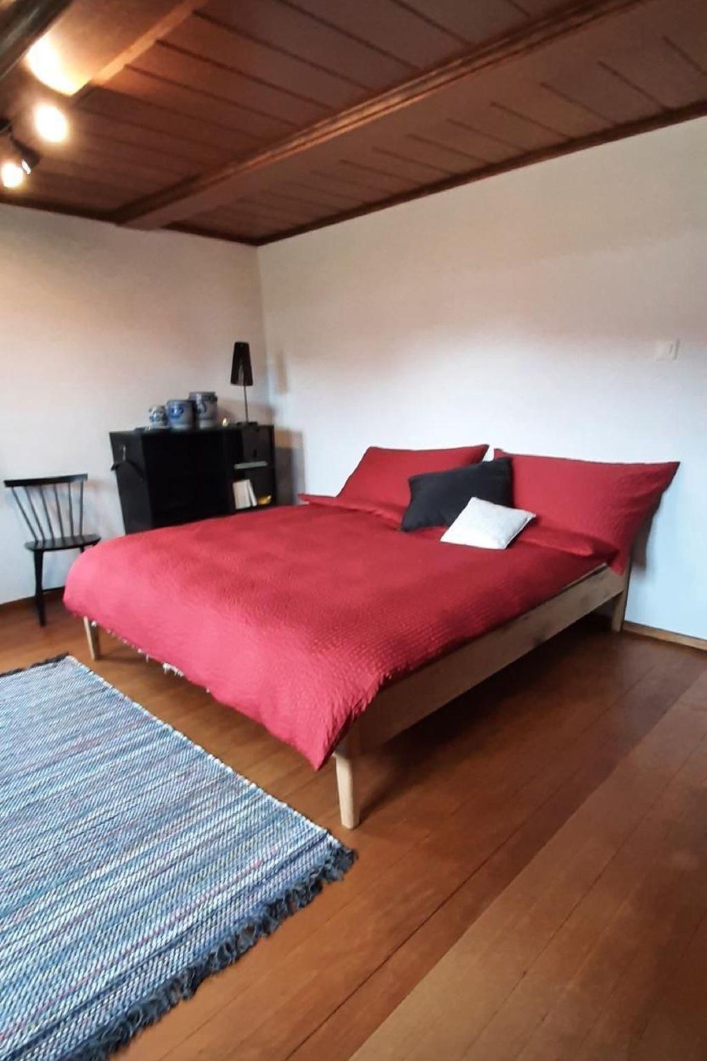The interior of our holiday flat on the ground floor includes a sunny, bright living room that invites you to linger and has a round dining table for four people. The kitchen is practically equipped with an integrated extractor fan in the cooker and a freezer compartment in the fridge. The bedroom presents itself with a beautiful, lovingly and carefully restored old ceiling and a "strap floor", which emphasises the historic charm of the flat.