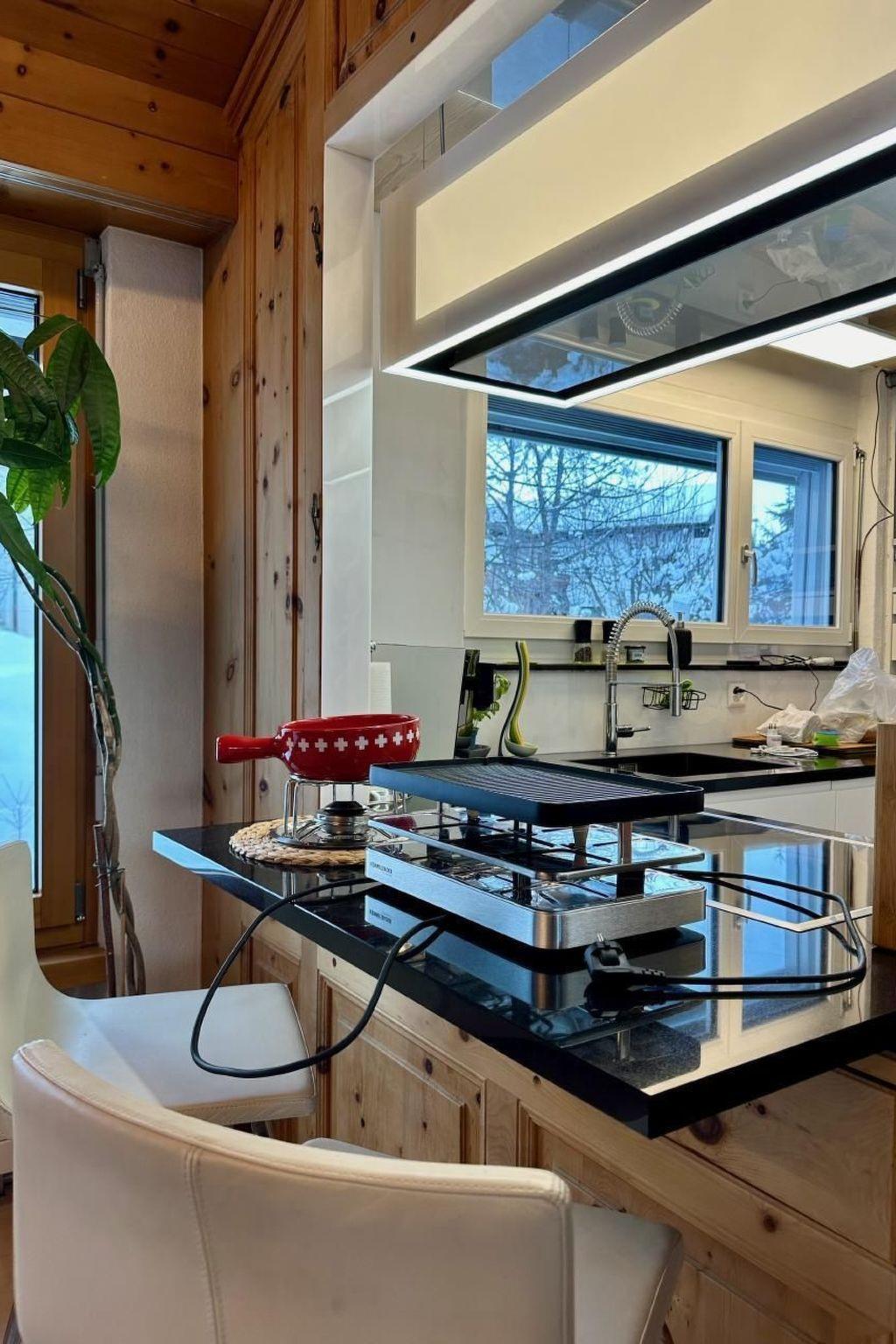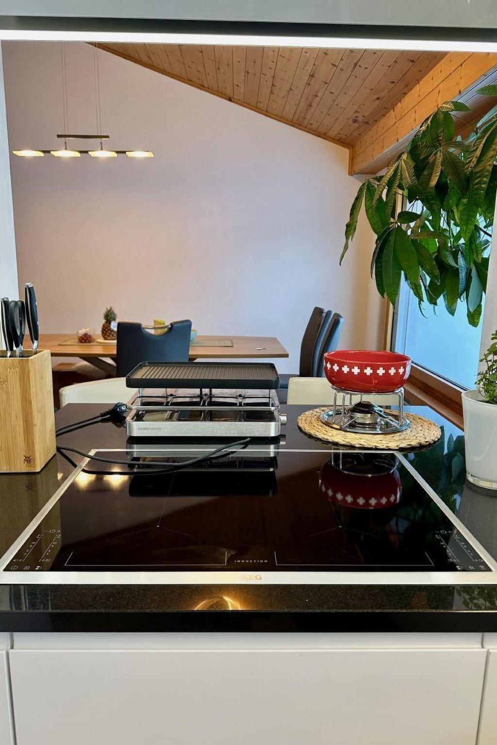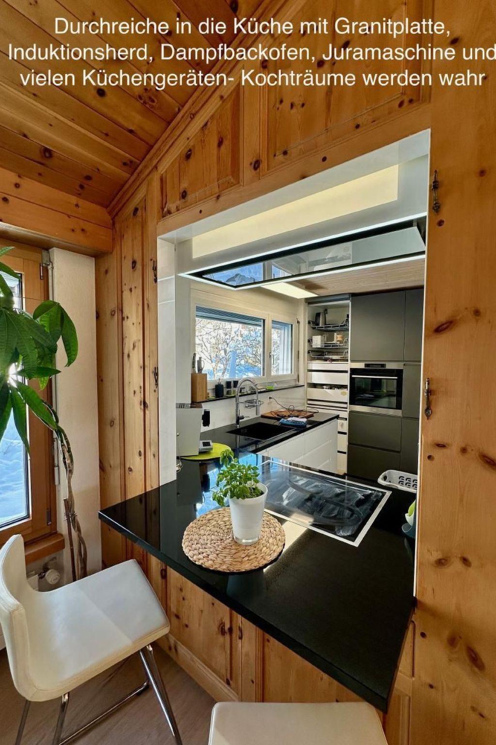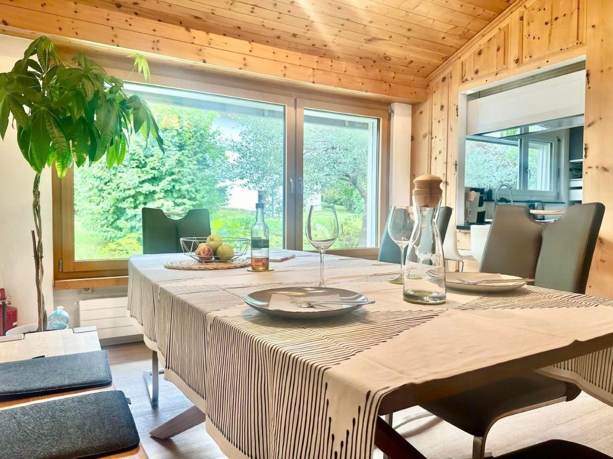 The flats have fast Internet, WLAN, 2 TVs, a massage chair, two spacious open and fully equipped kitchens, two bedrooms with new upholstered beds with new very high-quality pocket spring mattresses, Swiss stone pine furniture and wardrobes, high-quality and modern furniture in an exciting mix with Swiss stone pine elements. Our house has a south-facing balcony with a fantastic mountain view, 2 terraces with mountain views, a private garden with herbs and delicious berries in summer. Garden spa with sauna and whirlpool.