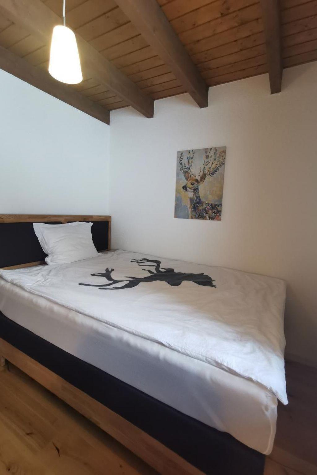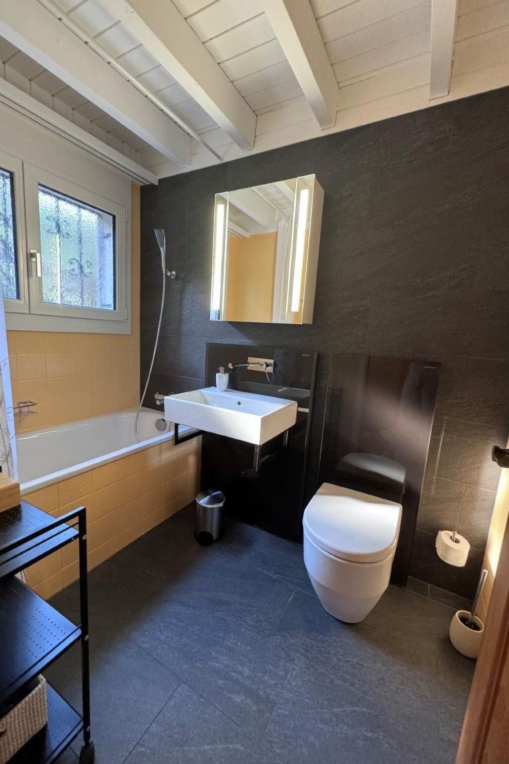 Top level After you've entered the house you will find a bathroom with a bath/shower on your left. On your right there's a single bedroom 140x200 boxspring bed (that fits also for 2 small children) and a office workspace (22inch display and keyboard/mouse is available). Next bedroom on your right is the main double. The living room is fully furnished, Internet/TV, radio/Hi-Fi and a log burner. From there you can reach the balcony with the BBQ. The kitchen is fully equipped with induction cooker, oven, microwave, fridge, Nespresso coffee machine, dish washer, table grill, fondue-set. We also provide a laptop and board games. Base level Downstairs you'll find an utility room with washing machine and a shower. You will also find an additional room with a double Boxspring bed and access to the terrace. The house has a heat pump with underfloor heating which can be controlled remotely.