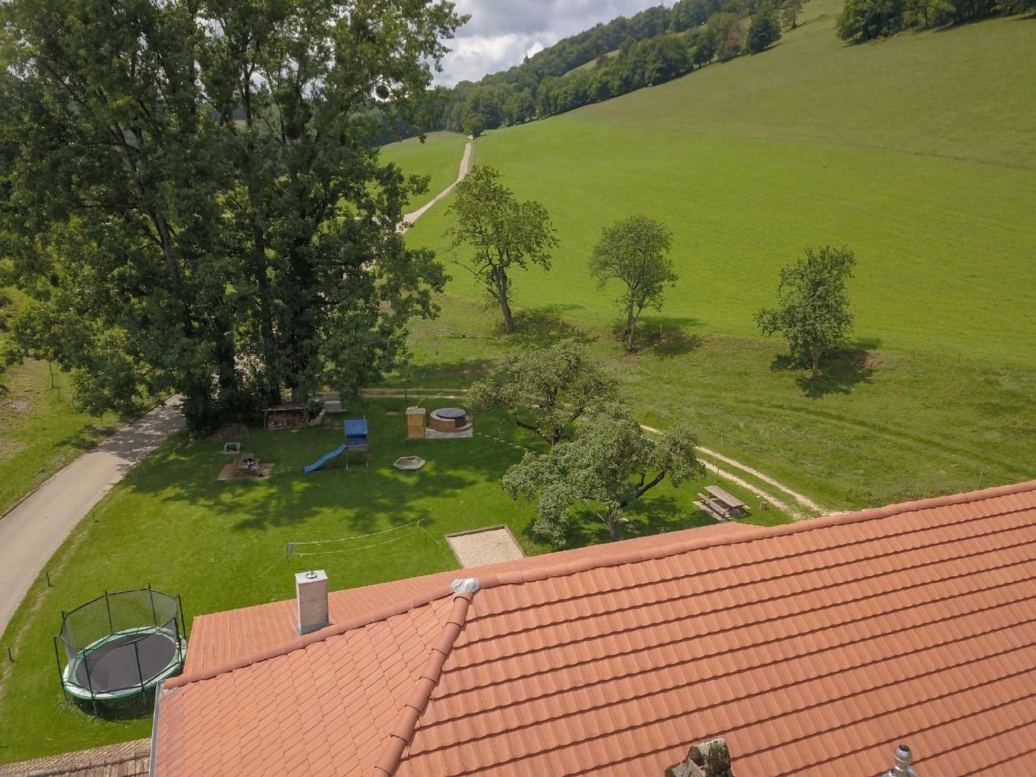 The holiday home Ferme d' Alma, located in the idyllic and personal Jura village of Seleute, offers many extras and amenities in addition to exclusive furnishings. In the "Moderne" holiday flat on the mezzanine floor, you and a total of 14 people can stay in 5 lovingly furnished bedrooms and freshen up in two spacious bathrooms. The modern kitchen offers everything you need to fully cater for all guests. Open to the kitchen is the large, bright living/dining room with a table for a total of 14 people, which invites you to relax and unwind. In the large cellar room on the ground floor, accessible from the east, you will find various games and leisure equipment for games and sports (table football, table tennis, darts, billiards, etc.) In the large garden you will find everything you need, from a barbecue area to play and sports areas. An outdoor whirlpool and a top modern wellness room are also available on request (not included in the price). For leisure activities, we also recommend the nearby historic town of St. Ursanne, which is just 6km away, where you can enjoy swimming, canoeing and rubber dinghy trips, discovery tours or simply a cosy picnic in the Doubs river that flows through the town.