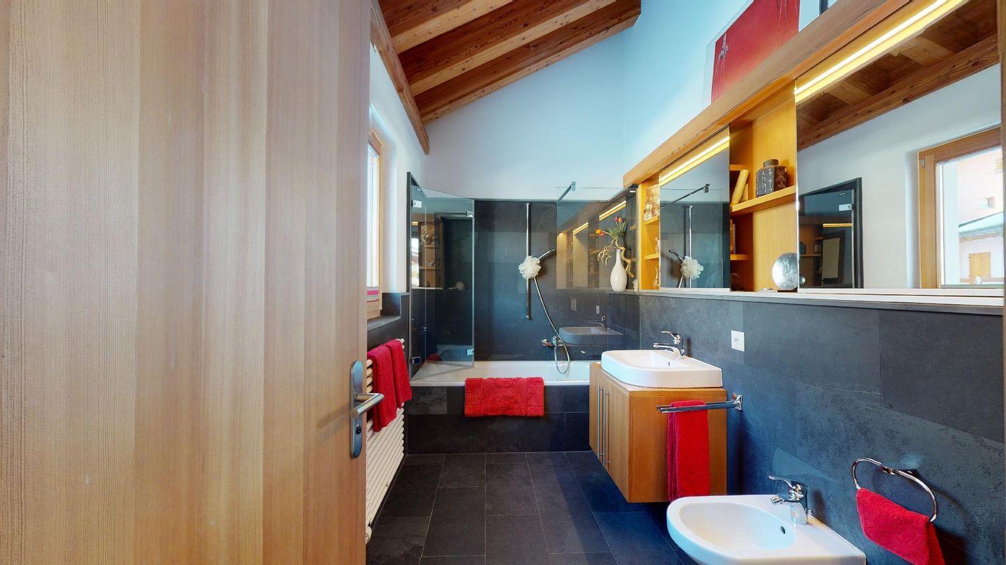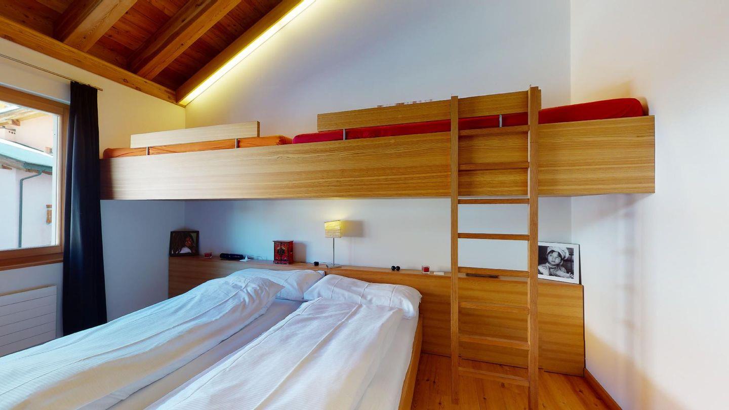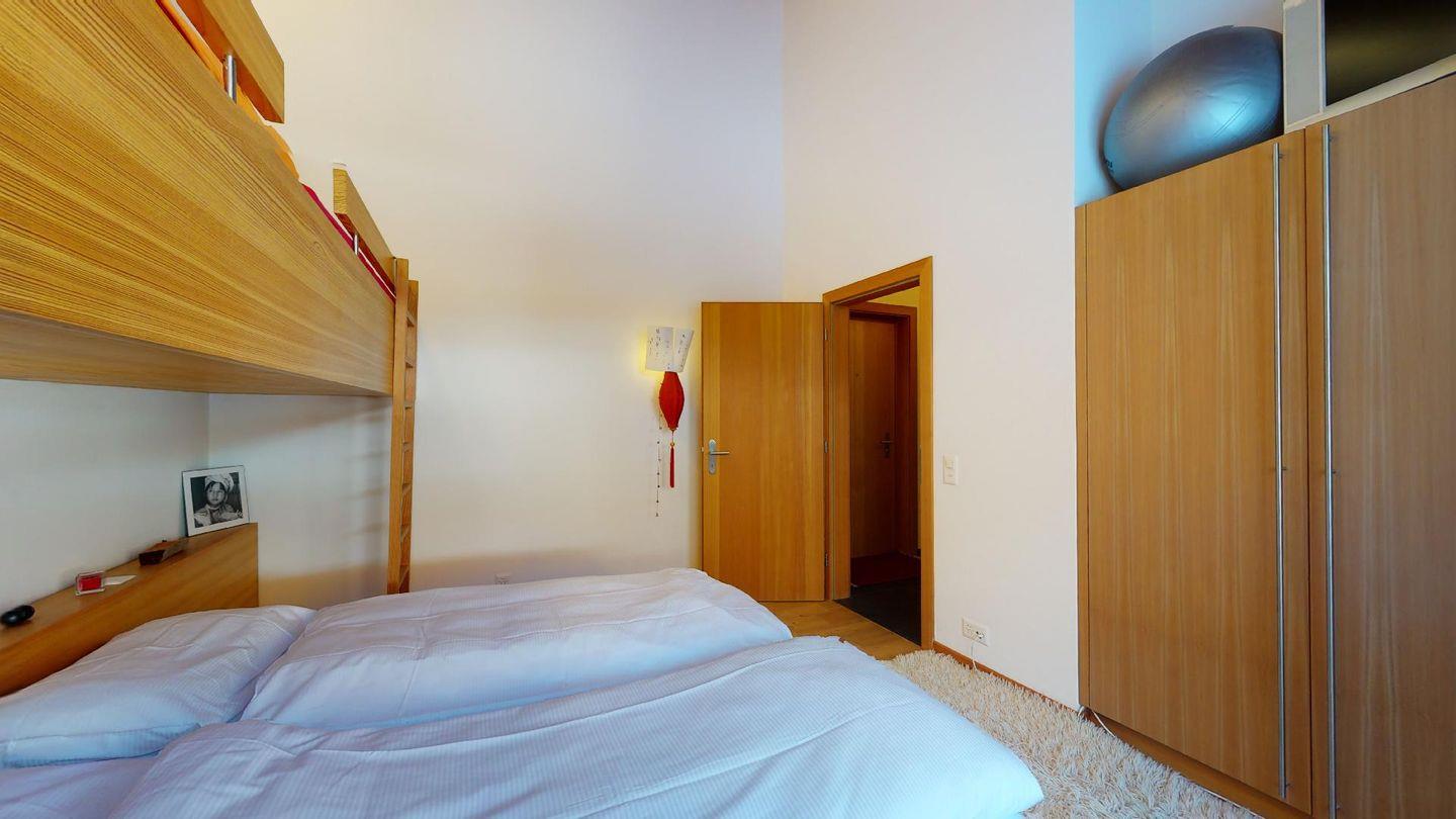 Grosse 3-½ Zimmermaisonette Wohnung im 2. Stock. Eingang mit grosser Garderobe. Ein Doppelschlafzimmer mit eigenem Badezimmer. Ein Schlafzimmer mit zwei Einzelbetten und zwei Hochbetten. Badezimmer mit Dusche. Obere Etage mit offener Küche mit Kühlschrank, Tiefkühler, Herd, Ofen, Mikrowelle und Geschirrspüler, Essecke sowie Balkon. Wohnzimmer mit TV und Kamin. Gemeinschaftliche Waschmaschine. 2 Parkplätze in der Tiefgarage. Haustiere sind nicht erlaubt.