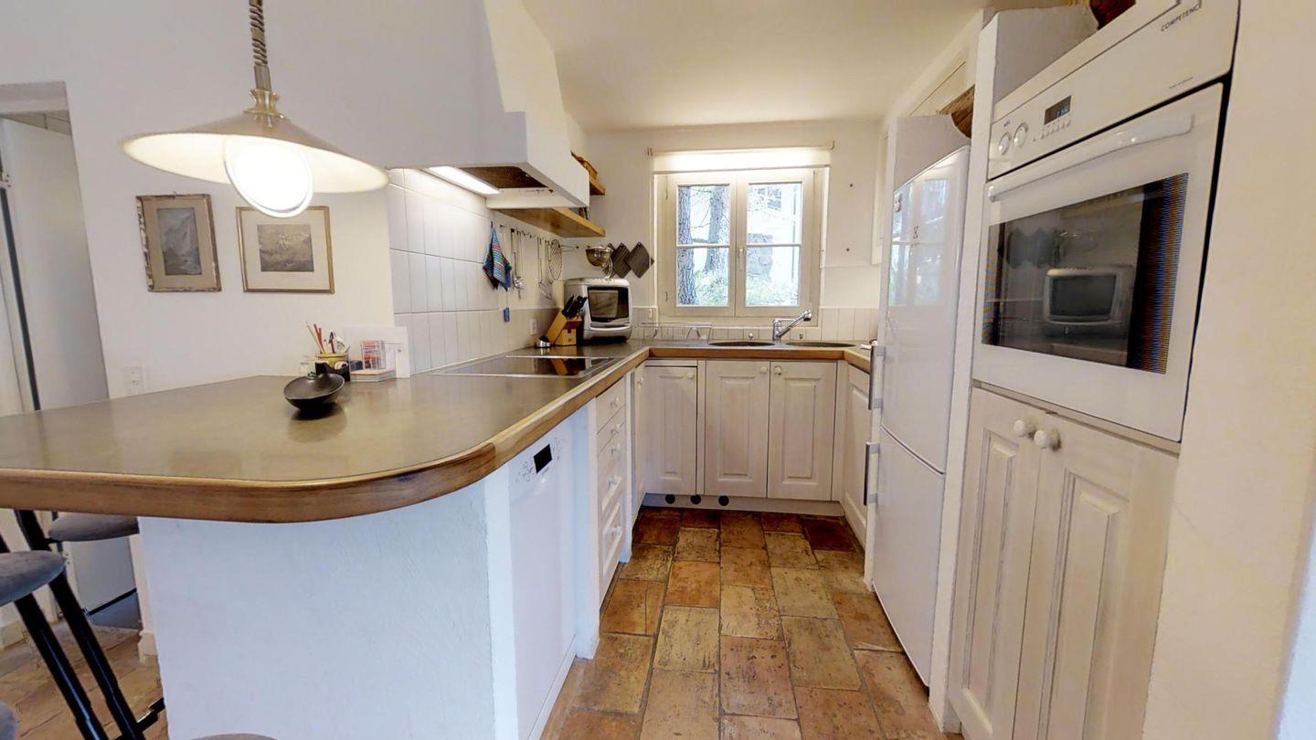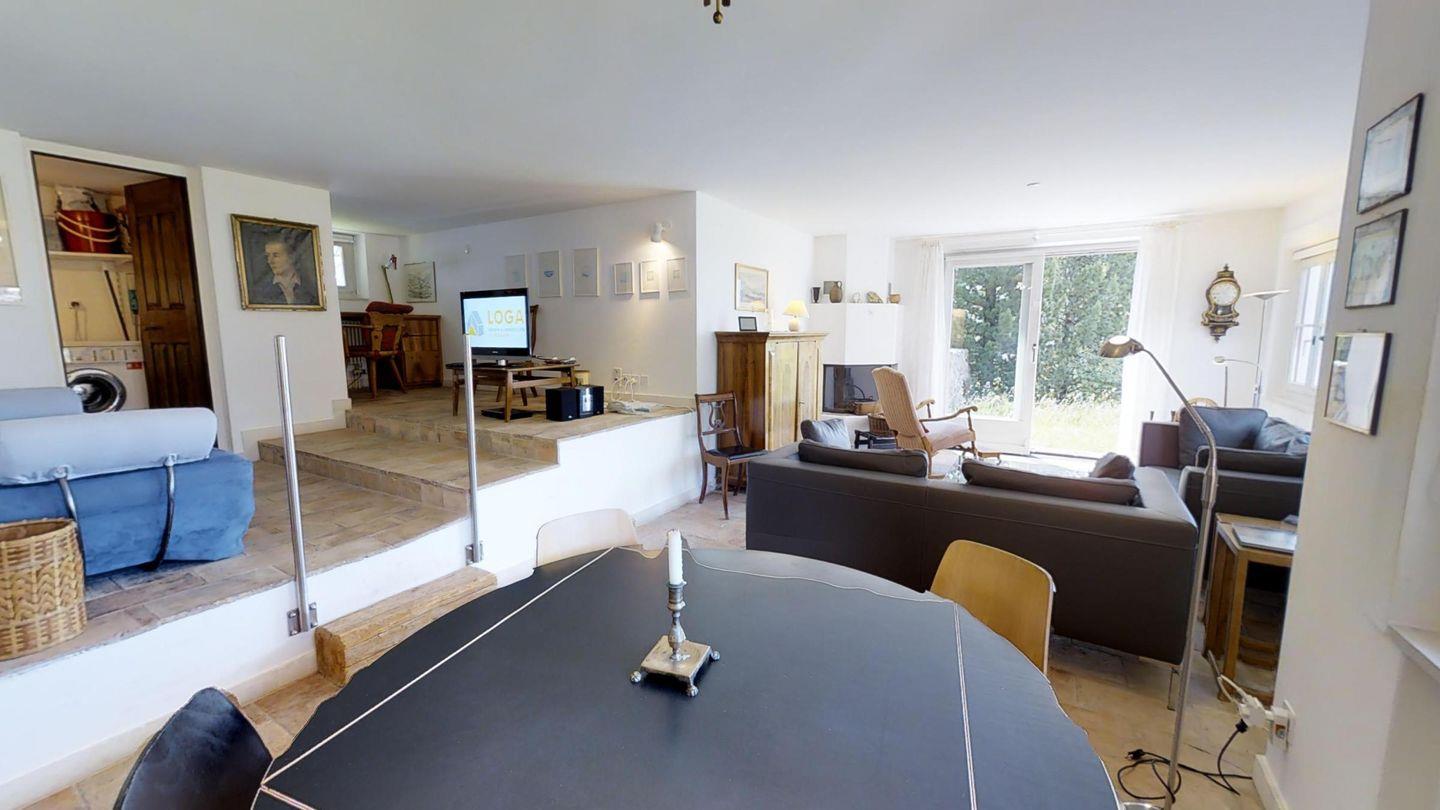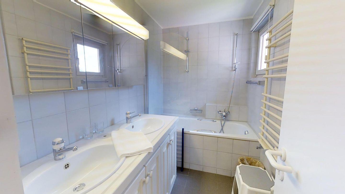 Einzigartige 3 ½ -Zimmerwohnung im Erdgeschoss. Ca. 120 m2, an sehr sonniger und ruhiger Lage direkt am Waldrand. Eingang mit Garderobe. 1 Doppelschlafzimmer mit Bad/Doppellavabo/WC. 1 Zimmer mit zwei separaten Betten. Dusche/WC/Lavabo. Offene Küche mit Backofen, Kühlschrank, Tiefkühler und Geschirrspüler. Kaffeemaschine CHICCO D'ORO. Gemütliches und helles Wohn-/Esszimmer mit Kamin und direktem Ausgang zum Garten. Einzigartige Berg- und Seesicht. Abstellraum mit Waschmaschine und Tumbler. 2 Garagenplätze. Haustiere sind erlaubt.