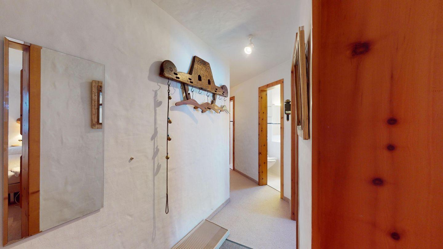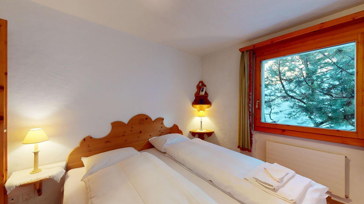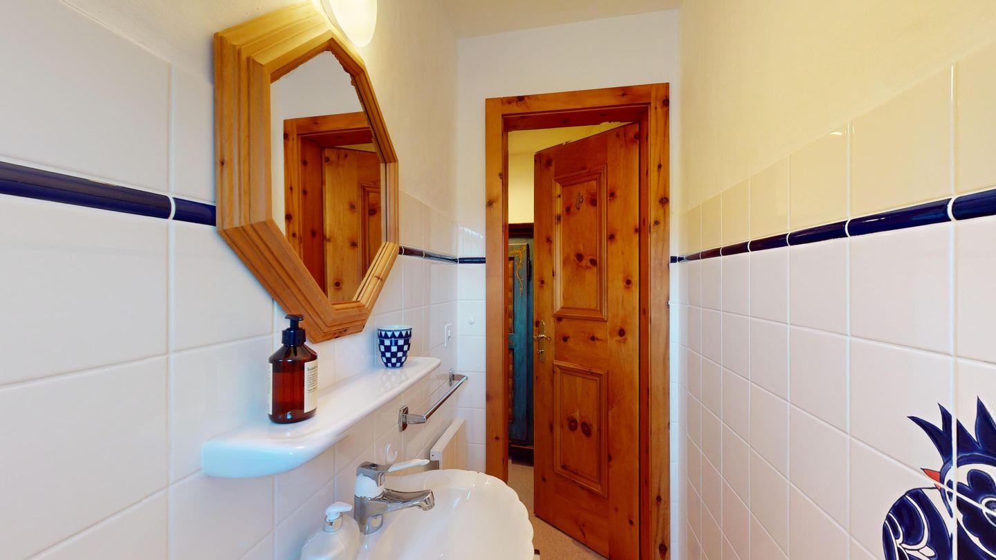 3-Zimmerwohnung im Erdgeschoss, Eingang mit Garderobe, Wohnzimmer mit Essecke, Cheminée und Ausgang auf den Sitzplatz. Geschlossene Küche mit Chicco d'Oro Kaffeemaschine. Zwei Doppelzimmer. Badezimmer mit Badewanne, Waschbecken, WC. Gäste-WC. Gemeinschaftliche Waschküche. Garagenplatz (Höhe 1.95 m, Breite 2.35 m)