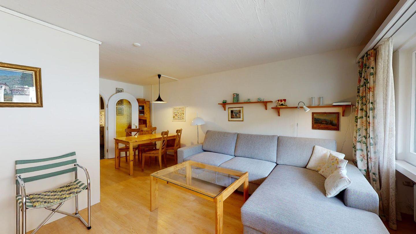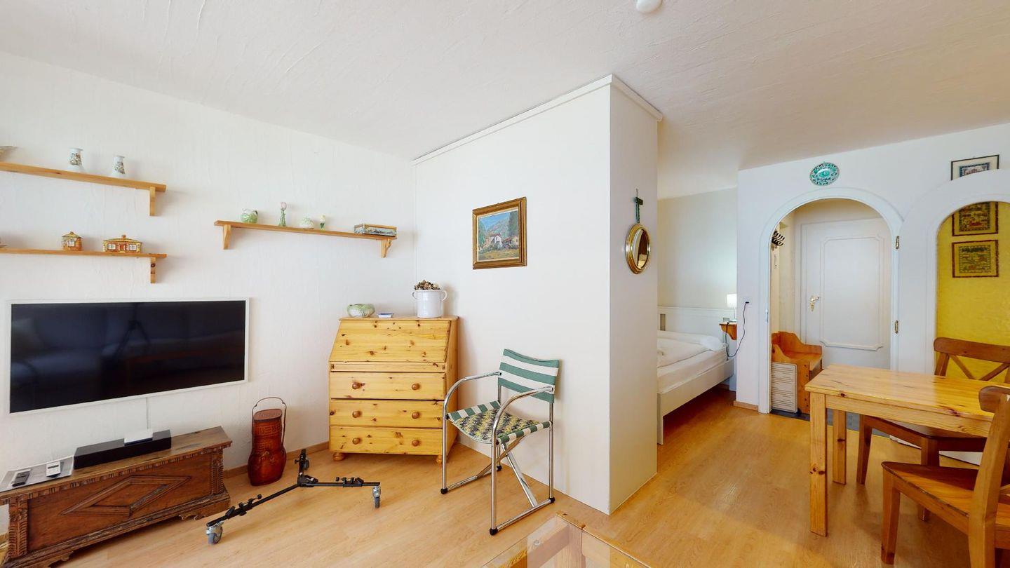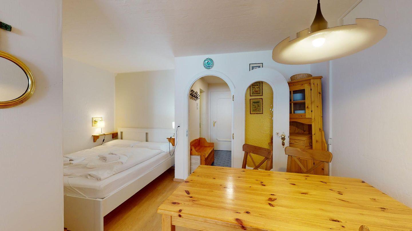 1-Zimmerwohnung im 1. Stock, ca. 40 m2, an ruhiger, sonniger Südlage. Entree mit Kochnische, Kühlschrank und Backofen. CHICCO D'ORO Kaffeemaschine. Hübsches Wohn-/ Esszimmer mit abgetrenntem Schlafbereich. Schöne Bergsicht. Terrasse mit Liegestühlen. Radio, Fernseher, Internet und Telefon. Bad/WC/Lavabo. Komfortable Einrichtung. 1 Aussenparkplatz. Waschküche und Skiraum zur Mitbenützung. Haustiere sind nicht erlaubt.
