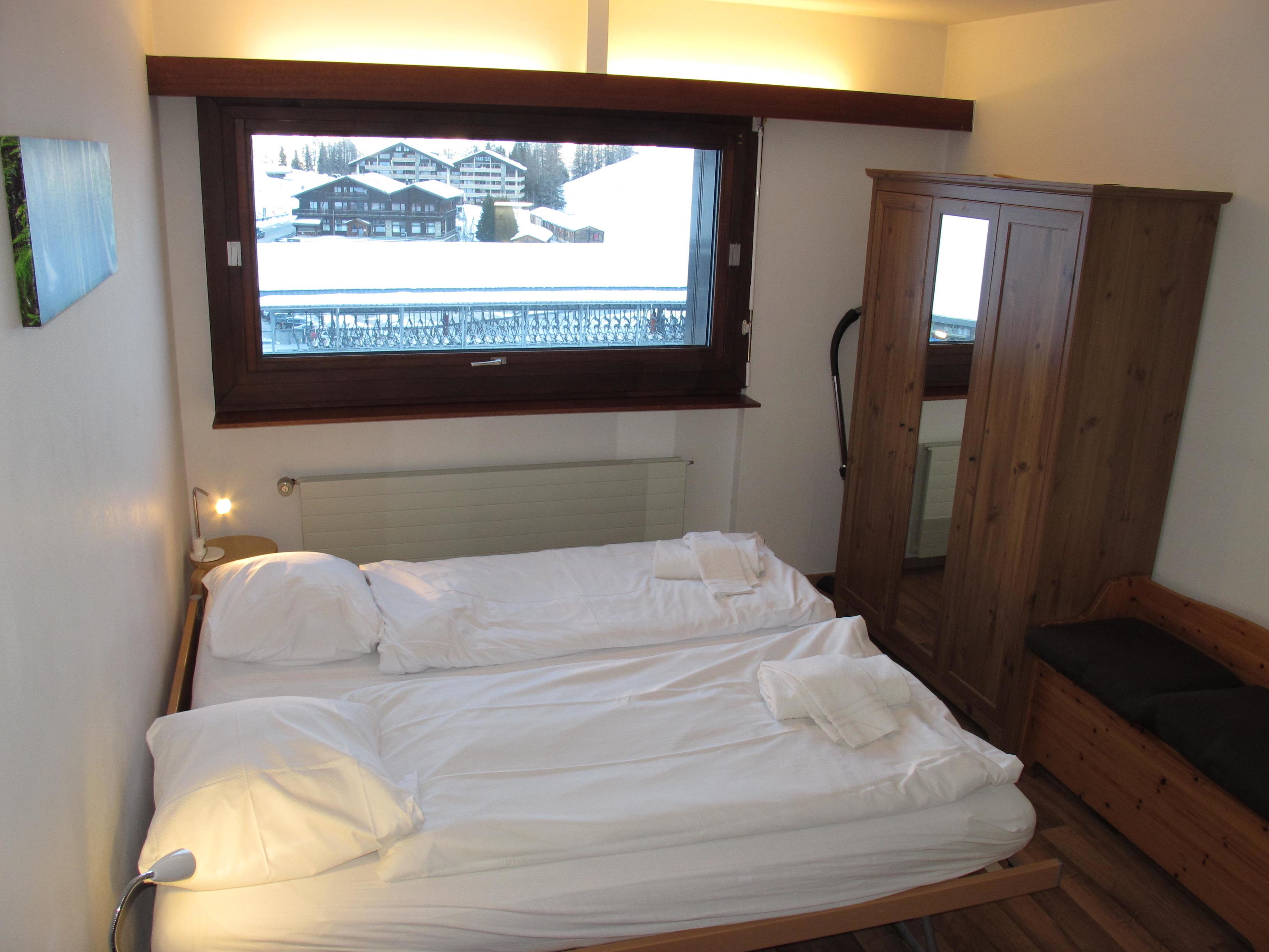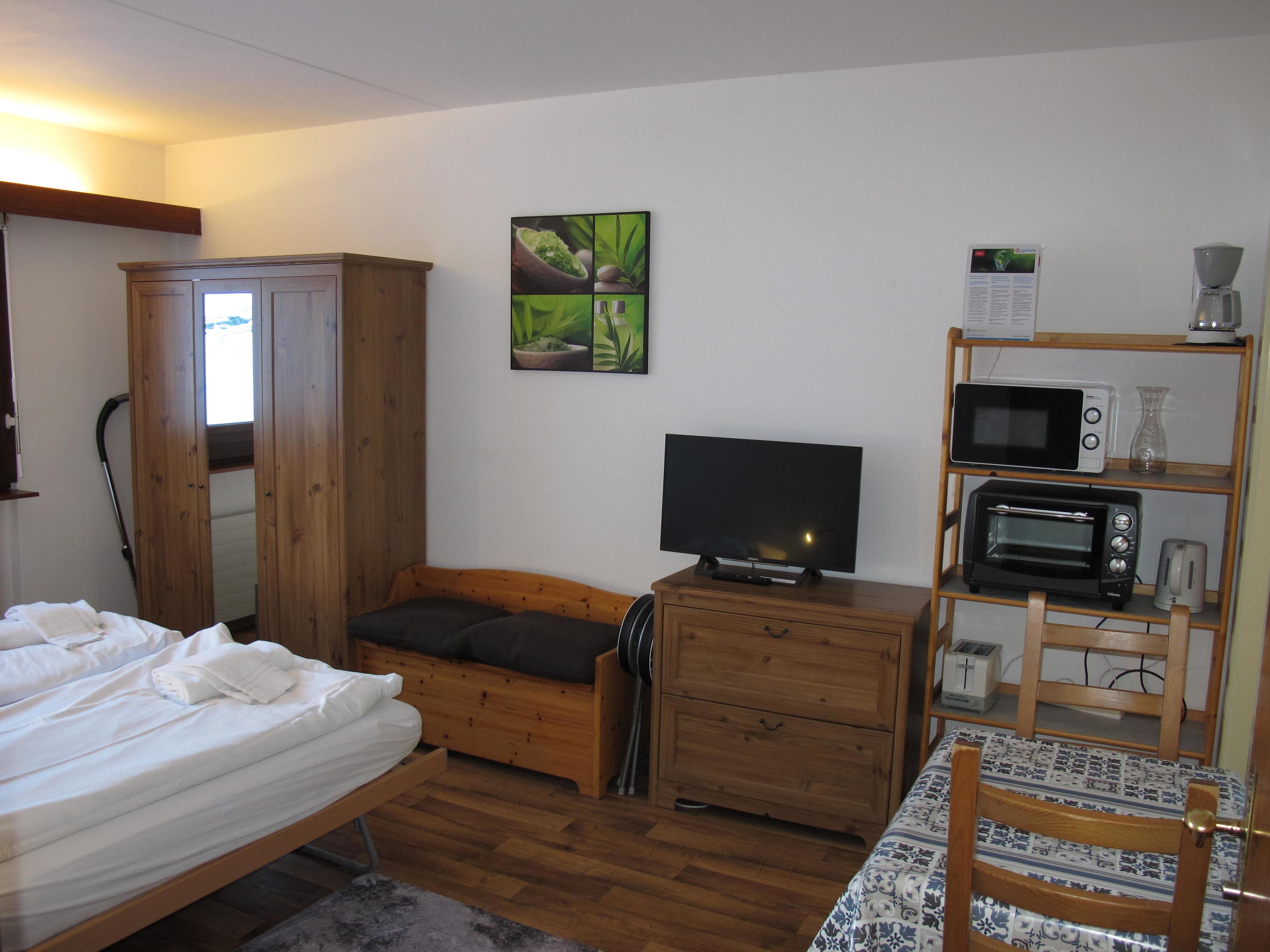 Große, helle, gemütliche, gut ausgestattete 3-Zimmer-Wohnung, 3. Etage (Aufzug) mit ca. 81 m² Wohnfläche: Eingang in Flur mit Garderobe. Wohn-/Schlafraum mit Einzelbett und Ausziehbett (je 0,9 x 2m), offener Kamin (Holz gegen Bezahlung), Eßplatz und Ausgang auf überdachten Südbalkon mit Panoramablick und Mobiliar. Küche mit Einbauherd (3 Platten, Backofen), Geschirrspüler, Mikrowelle, Kühlschrank mit Gerfierfach, Toaster, Kaffeemaschine, Wasserkocher, Fondue-Rechaud und Raclette-Gerät. Großes Zweibetzimmer mit Blick auf Lift und Pisten hinüber in das Sigebiet nach Veysonnaz. Bad. Sep.WC. Interne Verbindungstür zu separatem Studio mit 2x Enzelbett, kleine Kochnische (2 Platten, Mikrowelle, Minibackofen, Kaffeemaschine, Wasserkocher, Toaster) und Dusche/WC.