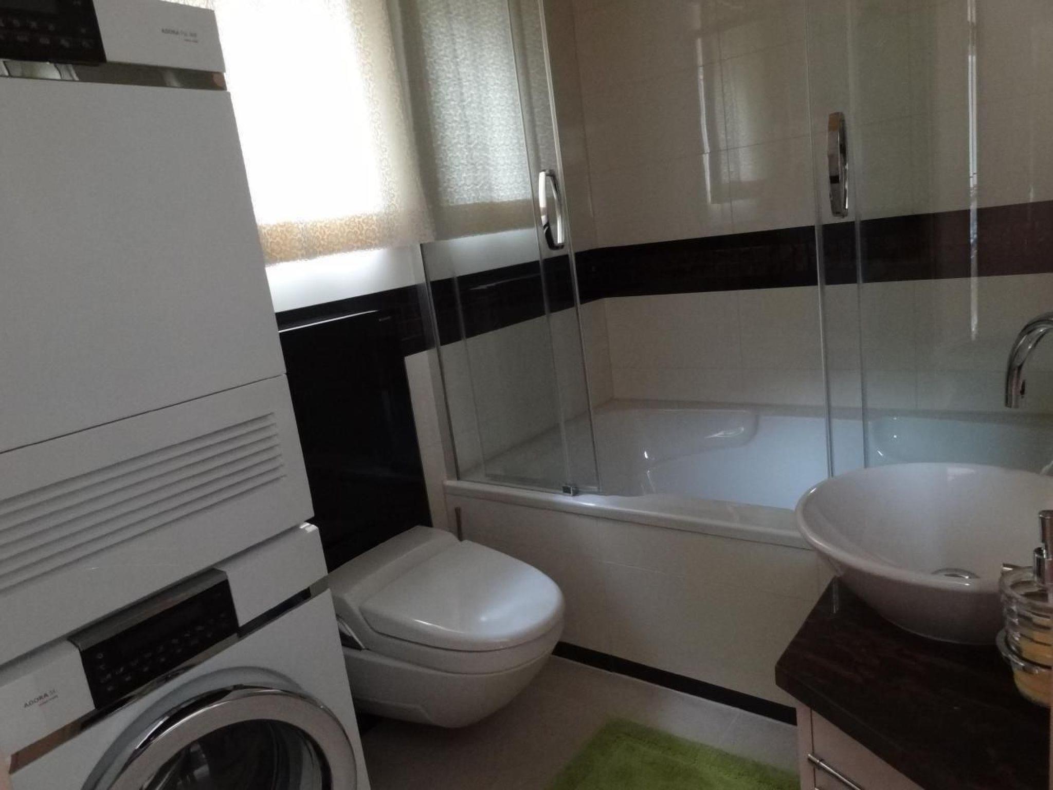 - Bathroom with bathtub 110×180 cm, washing machine and tumble dryer, Geberit shower toilet, washbasin