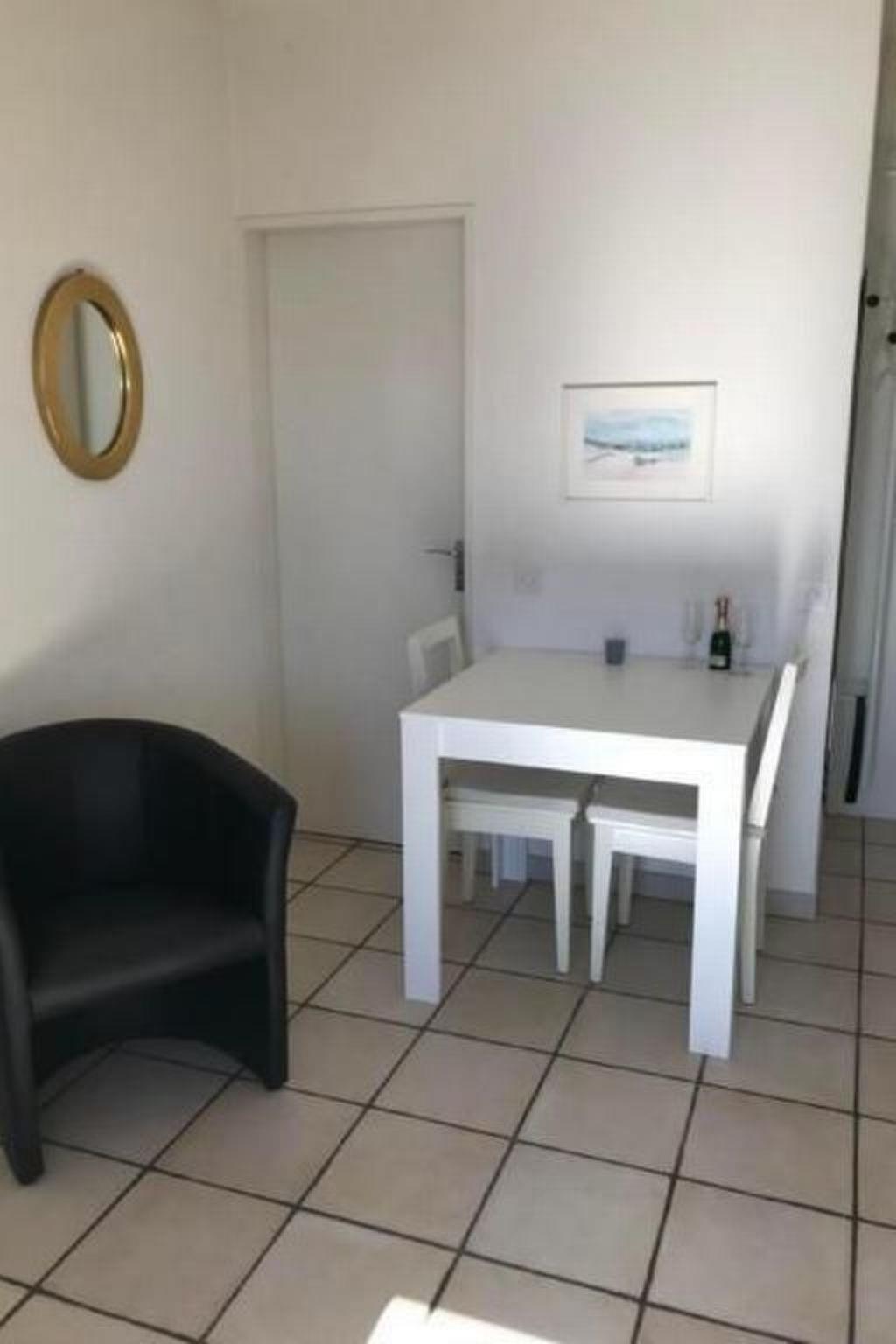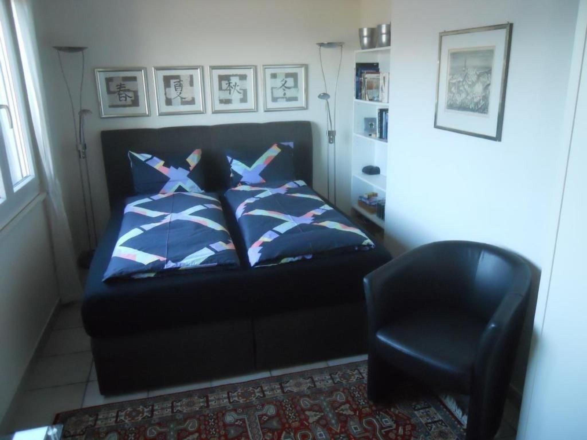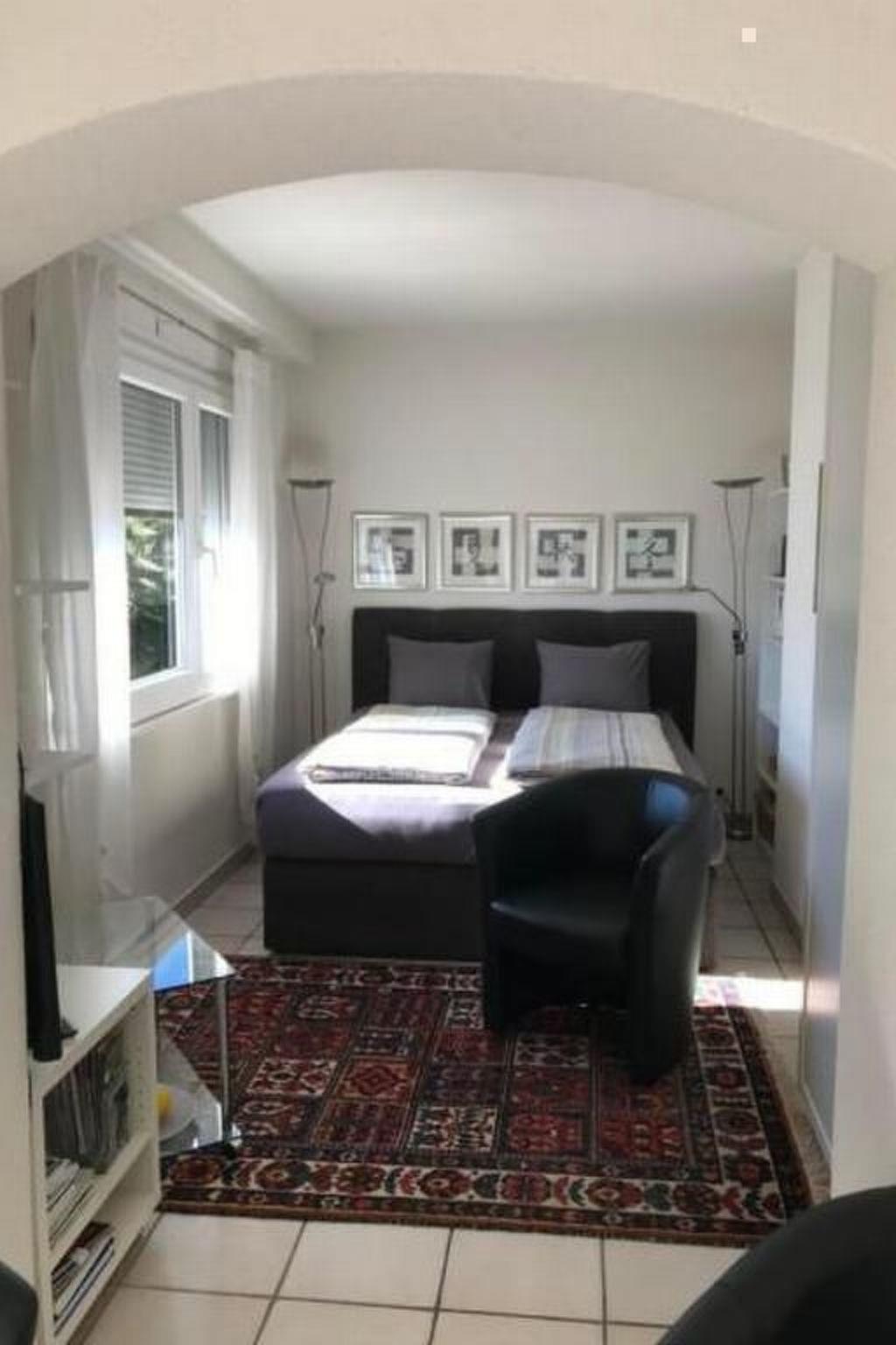 Inside, you will find a tastefully furnished flat equipped with all the necessary amenities for a carefree stay. The living and dining area leads directly onto the cosy balcony. A modern box-spring bed in the sleeping area, which is separated from the rest of the room by a round arch, promises a restful night's sleep. The bedroom is also equipped with a wardrobe and TV for your entertainment.