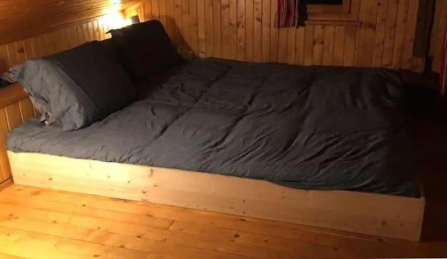 Das Obergeschoss erreichst du über eine steile Treppe. Dort gibt es unter der Dachschräge 2 Einzel- und ein Doppelbett, abtrennbar durch einen Vorhang. Da die Geschosshöhe oben sehr niedrig ist, sind Betten praktisch am Boden.