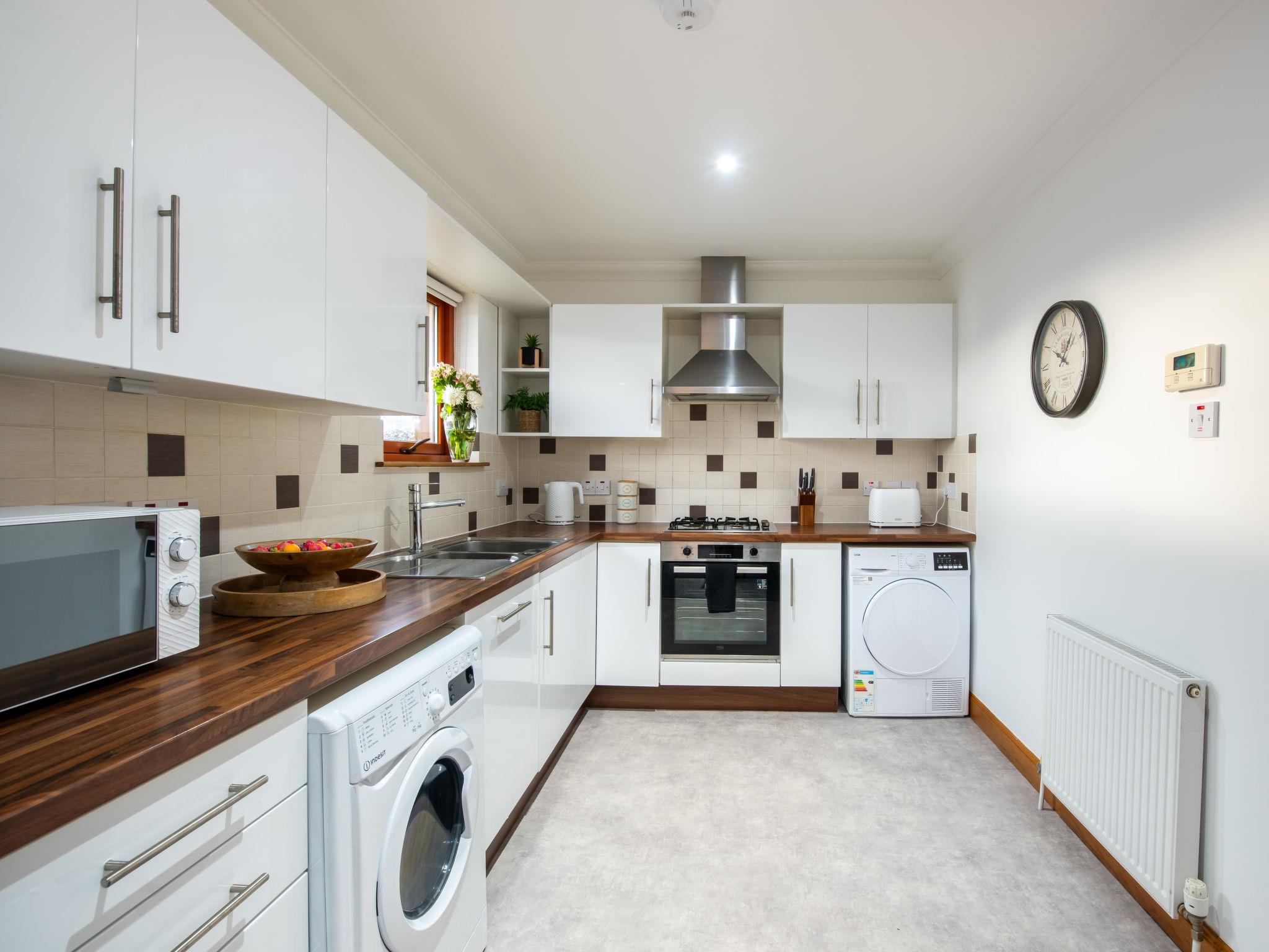 Modern, comfortable apartment block "Forres View". In the centre of Forres, in a central position, 10 km from the sea, 10 km from the beach. Parking at the house. Shop, café 460 m, bus stop "Old Bridge Court" 460 m, railway station "Forres" 2 km, sandy beach "Nairn" 10 km. Golf course (18 hole) 1 km. Nearby attractions: Findhorn Beach 11 km, Nelson Tower 2 km, Brodie Castle 7 km, Randolph's Leap 25 km, Cluny Hill & Grant Park Gardens 2 m, Swimming Pool 1 km. Well-known lakes can easily be reached: Loch Ness 64 km, Loch of Blairs 4 km, Lochindorb 26 km. Hiking paths: Blairs Loch 4 km, Dava Way (incudes a viaduct). Please note: car recommended.