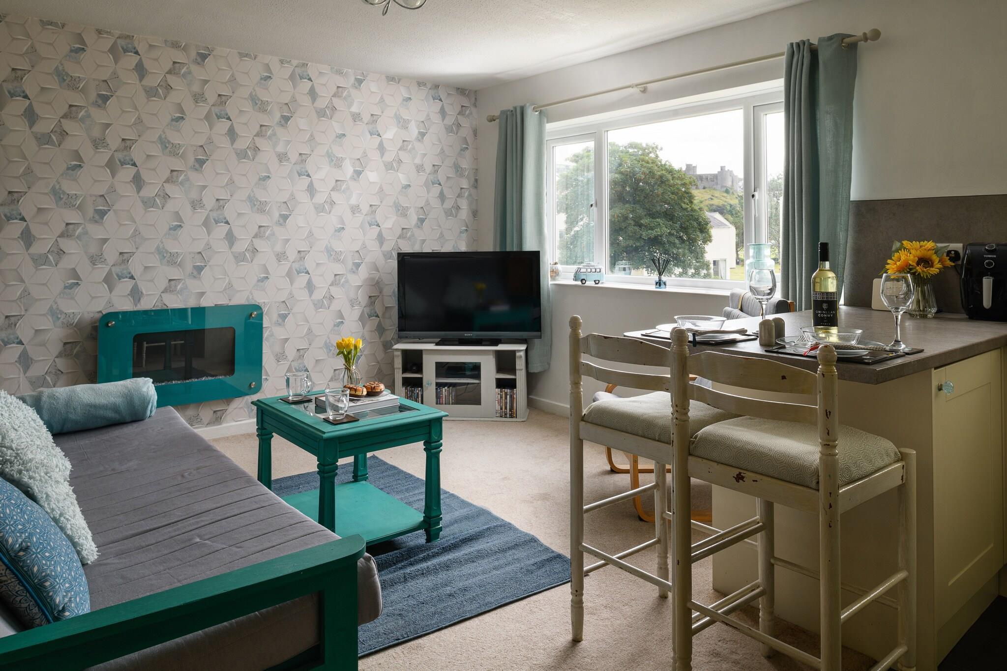 Stay in a bright and welcoming apartment in beautiful Harlech, offering easy access to the town centre, stunning beaches, and breathtaking views of Harlech Castle. This well-equipped home provides everything needed for a perfect getaway, whether you're exploring the coast, enjoying local attractions, or heading for a golfing weekend at the nearby Royal St David's Golf Club, less than a mile away. The open-plan layout combines a kitchen, dining area, and living space with comfortable sofas, a TV, DVD player, and an electric feature fire. The kitchen includes an oven, hob, microwave, fridge freezer, kettle, and a washing machine for added convenience. The bedroom features a double bed, ample storage, and views over the well-maintained communal gardens. With free parking right outside and excellent road links to Snowdonia, Anglesey, and the Llyn Peninsula, this location is ideal for exploring North Wales. Access is via external steps to the first floor. Pets are welcome (up to one medium-sized dog), but must not be left unattended. No smoking allowed. Children of all ages are welcome.