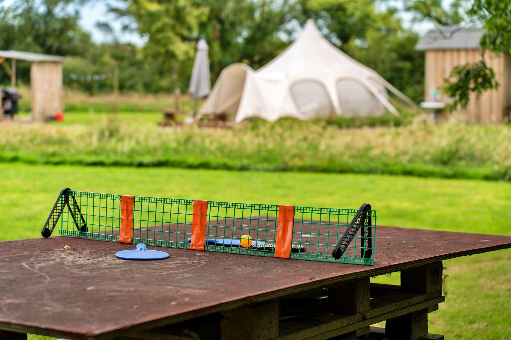 Nestled in a tranquil, sheltered field on a family-run dairy farm in picturesque North Devon, this charming bell tent offers the perfect escape to nature. Surrounded by lush countryside, guests may encounter local pheasants, deer, and owls, while the nearby eco-friendly marshlands attract a variety of birds and insects. It’s an ideal retreat for those seeking relaxation, fresh air, and a chance to connect with the natural beauty of the area. The bell tent is set on a wooden platform within a private 4-acre field, comfortably accommodating up to four guests on proper beds with mattresses—one double and two singles, all ready for your arrival. Children will delight in the cow-themed duvet covers! There's also space for an additional child on a pull-out mattress, with the option to bring your own bedding or small inflatable bed. A modern wood-burning stove outside the tent provides warmth on cooler evenings and can be used for cooking, while fairy lights and battery-powered tea lights create a cozy ambiance inside. Guests have access to a private covered outdoor kitchen with a gas barbecue, cooking equipment, and crockery, along with an outdoor seating area for meals and relaxation. For a more authentic camping experience, enjoy the fire pit—perfect for roasting marshmallows under the stars. Please note, there is no electricity inside the tent to promote digital detox, though power is available in the nearby play barn if needed. This pet-free retreat offers parking, a garden, and amenities like a washing machine and microwave, making it an inviting countryside getaway for nature lovers.