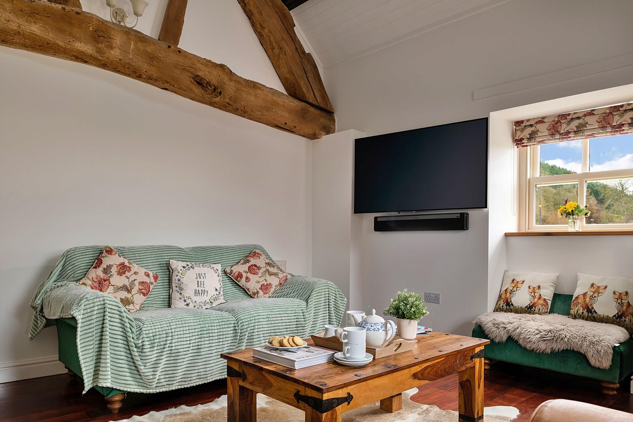 This is a luxurious cottage nestled in the picturesque hillside of North Wales, offering an unforgettable escape. The property features two spacious bedrooms, including a king-sized room and a twin room, each with an en-suite bathroom and flat-screen smart TV. The living room is designed for comfort, featuring a log-burning stove and plush sofas. For families or small groups, the traditional farmhouse kitchen is fully equipped with modern amenities such as an induction hob, boiling water tap, dishwasher, and washing machine. The cottage also includes private off-road parking with an EV charger, making it convenient for guests traveling by electric vehicle. A private wood-fired hot tub adds a touch of indulgence to your stay, available for an additional fee. Located in the heart of North Wales, Moelis Granary offers spectacular views of the surrounding valley, making it a perfect base for outdoor enthusiasts. Guests can relax on the wrap-around terrace, enjoying garden furniture and breathtaking vistas. The nearby area provides ample opportunities for hiking, biking, and exploring the natural beauty of the region. For a bit of fun, there is a giant chess set in the garden, ideal for family entertainment. The charming town of Llandrillo is a short distance away, offering local shops and eateries. The cottage’s exterior, with its traditional stone design, complements its luxurious interior. In addition to the hot tub and BBQ, guests can also access optional services such as an accidental damage cover. Please note that pets are not allowed, and the property is not suitable for those with mobility issues due to steps between most rooms. Additional fees apply for the use of the hot tub and BBQ, which are payable to the owner in cash upon arrival.