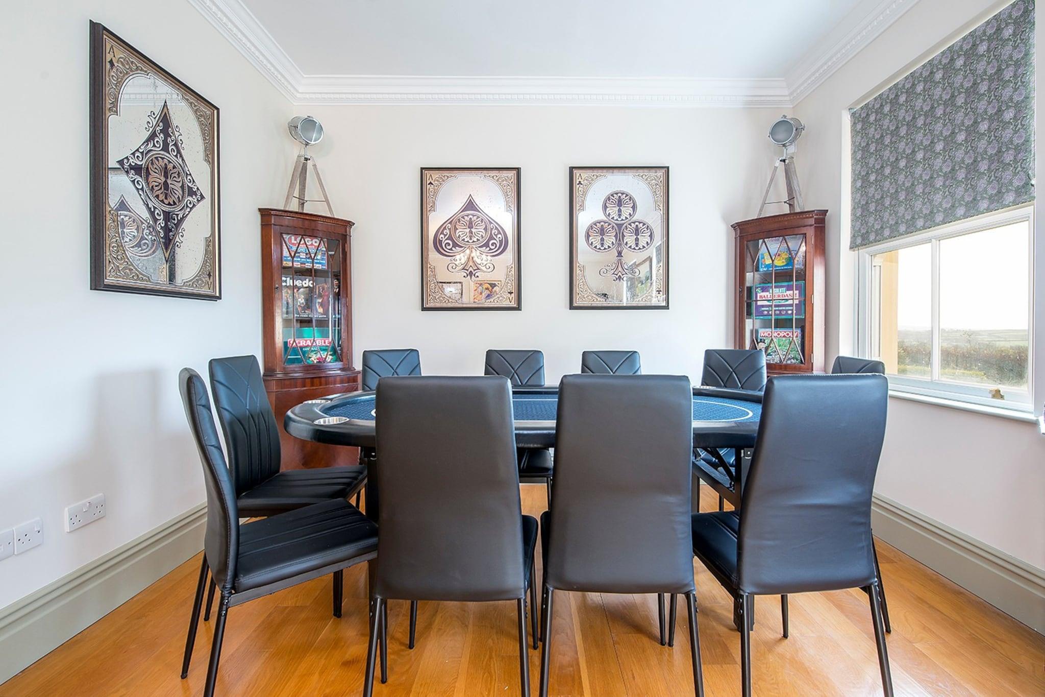 This majestic Georgian-style mansion in Carmarthen offers the ultimate luxury escape for large groups and families. Newly renovated in 2025, this grand property combines historic charm with contemporary comforts, featuring an indoor swimming pool, sauna, steam room, private cinema, and games room. With accommodations for up to 24 guests, it's perfect for family reunions, special celebrations, or an unforgettable getaway with friends. Set within 1.8 acres of beautifully landscaped gardens, the property boasts breathtaking panoramic views of the Lower Towy Valley. The main house offers nine luxurious bedrooms across two wings, each named after the iconic waterfalls of the Brecon Beacons. An adapted annex provides additional accommodation, ideal for guests with mobility needs. The Leisure Wing is a haven for relaxation, offering a 12m x 6m indoor pool, heated loungers, a 6-person Jacuzzi, and a family-friendly area with a ping-pong table and large TV. The expansive grounds also feature a multi-use games area for pickleball or football, as well as a pirate ship play area for younger guests. Inside, you'll find a family-style kitchen, a second smaller kitchen for large groups, and an elegant dining room that seats up to 24 guests. For entertainment, there’s a games room, music room, billiard room, and even a jukebox with a disco ball for dancing the night away. With thoughtful amenities like an EV charger and pet-friendly options (up to two dogs allowed), this luxurious estate ensures your stay is as comfortable and convenient as it is memorable. Whether you're lounging by the pool, exploring the gardens, or enjoying the wealth of entertainment options, this property promises an unforgettable experience in the heart of Wales.