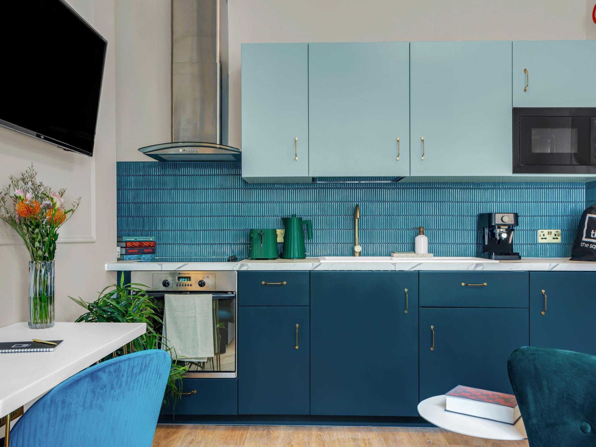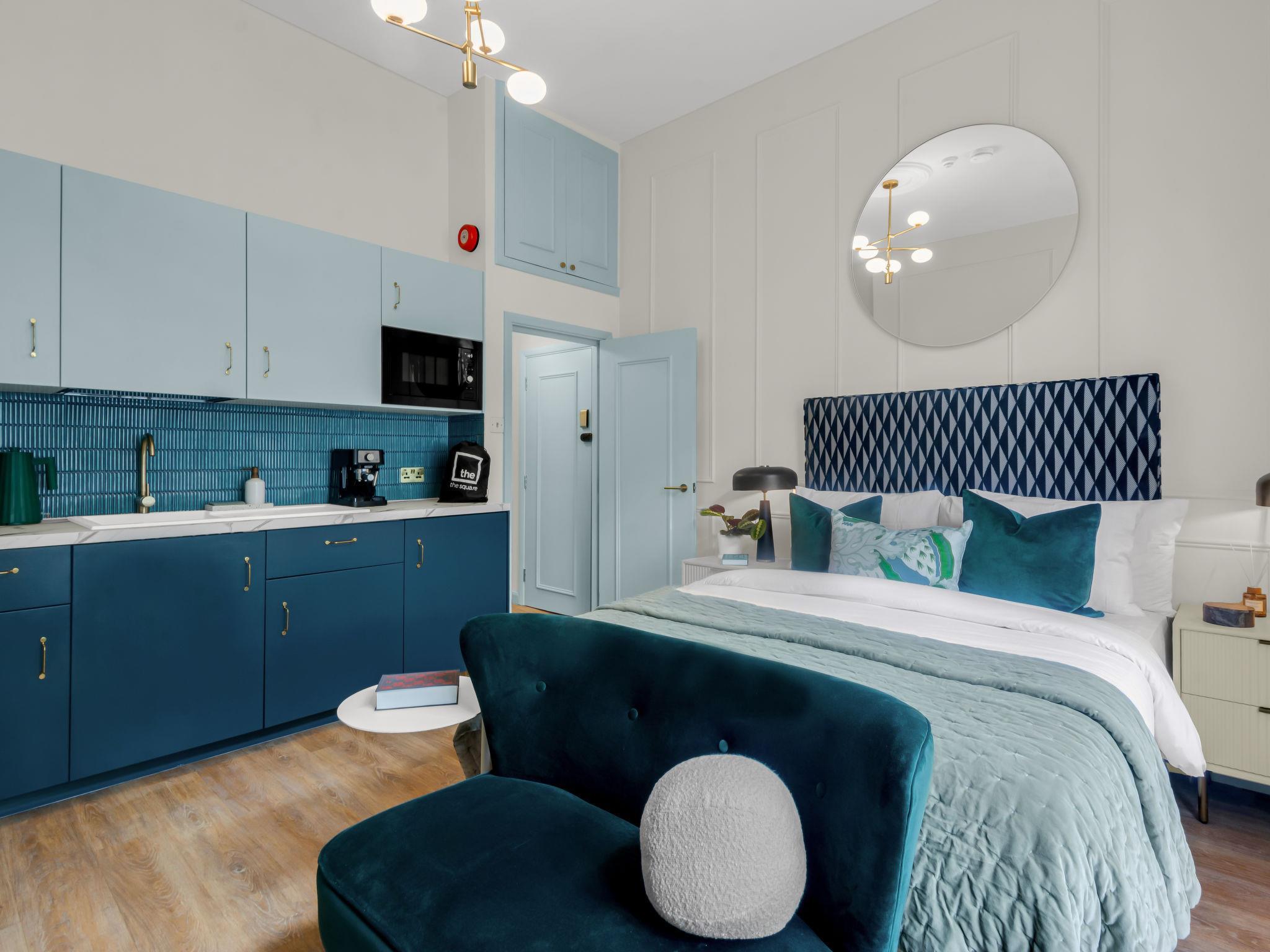 "Kensington Studio", 1-room studio 25 m2. Object suitable for 2 adults. Beautiful and stylish furnishings: open living/sleeping room with 1 double bed, shower/WC, TV, cable TV and flat screen. Open kitchen (oven, 4 ceramic glass hob hotplates, toaster, kettle, microwave). Facilities: hair dryer. Internet (WiFi, free). Please note: not suitable for small children. TV only EN. Smoke alarm, fire extinguisher, no lift. The property is one of a type of property or apartment.