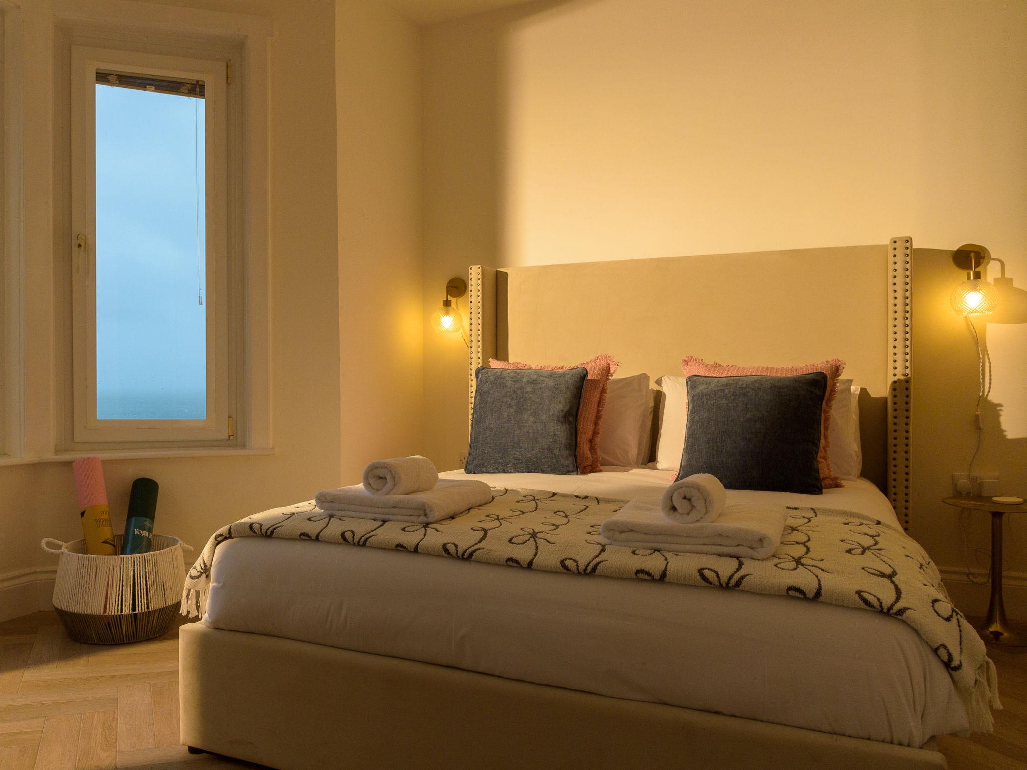 "4 Ocean Heights", 3-room apartment. Spacious and bright, modern and luxurious furnishings: open living room with panoramic window. Exit to the balcony. 1 double bedroom with 1 double bed and shower/WC. 1 double bedroom with 1 double bed. Open kitchen (2 hot plates, dishwasher, toaster, kettle, freezer, electric coffee machine) with dining table. Shower/WC. Electric heating. Small balcony. Balcony furniture. Marvellous panoramic view of the sea and the town. Facilities: washing machine. Internet (WiFi, free). Parking space n 4. Please note: TV only EN. Smoke alarm, no lift. Kitchen with no oven, 2 X hot plates, microwave and air fryer.
