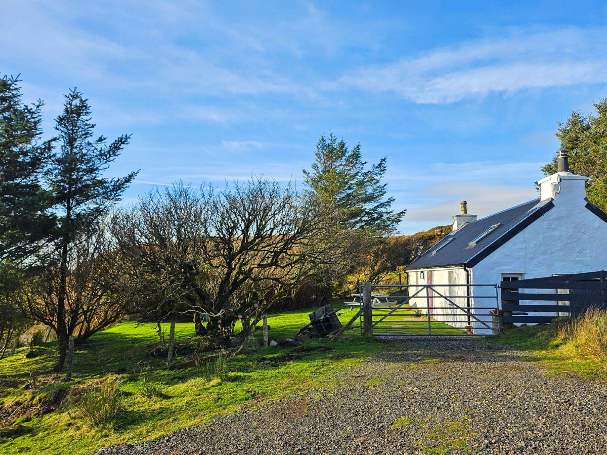 Cosy, comfortable cottage "The Cottage", detached. On the outskirts, 18 km from the centre of Portree, in a secluded, quiet position. Private: garden. Garden furniture, parking at the house. Shop 15 km, grocery 15 km, restaurant 450 m, café 600 m, bus stop "Portree" 18 km. Golf course (9 hole) 27 km. Nearby attractions: Dunvegan Castle and Garden 17 km, Old Man of Storr 30 km, Uig Outer Hebrides Ferry 39 km, The Fairy Pools 23 km. Please note: car recommended.