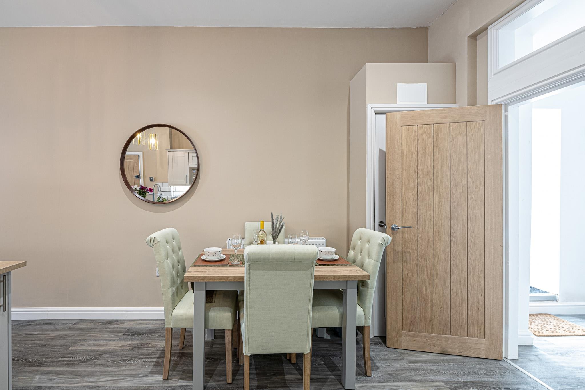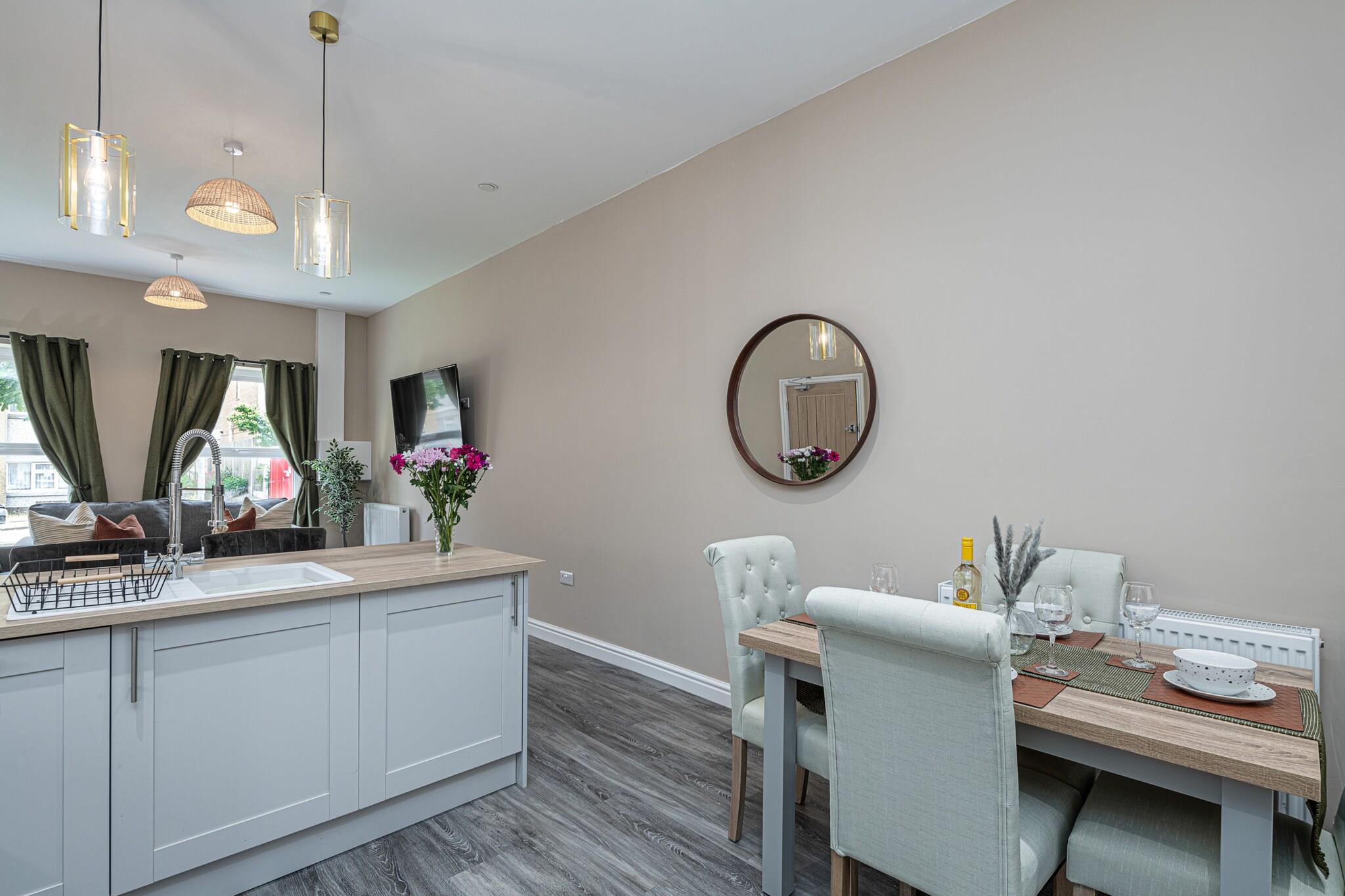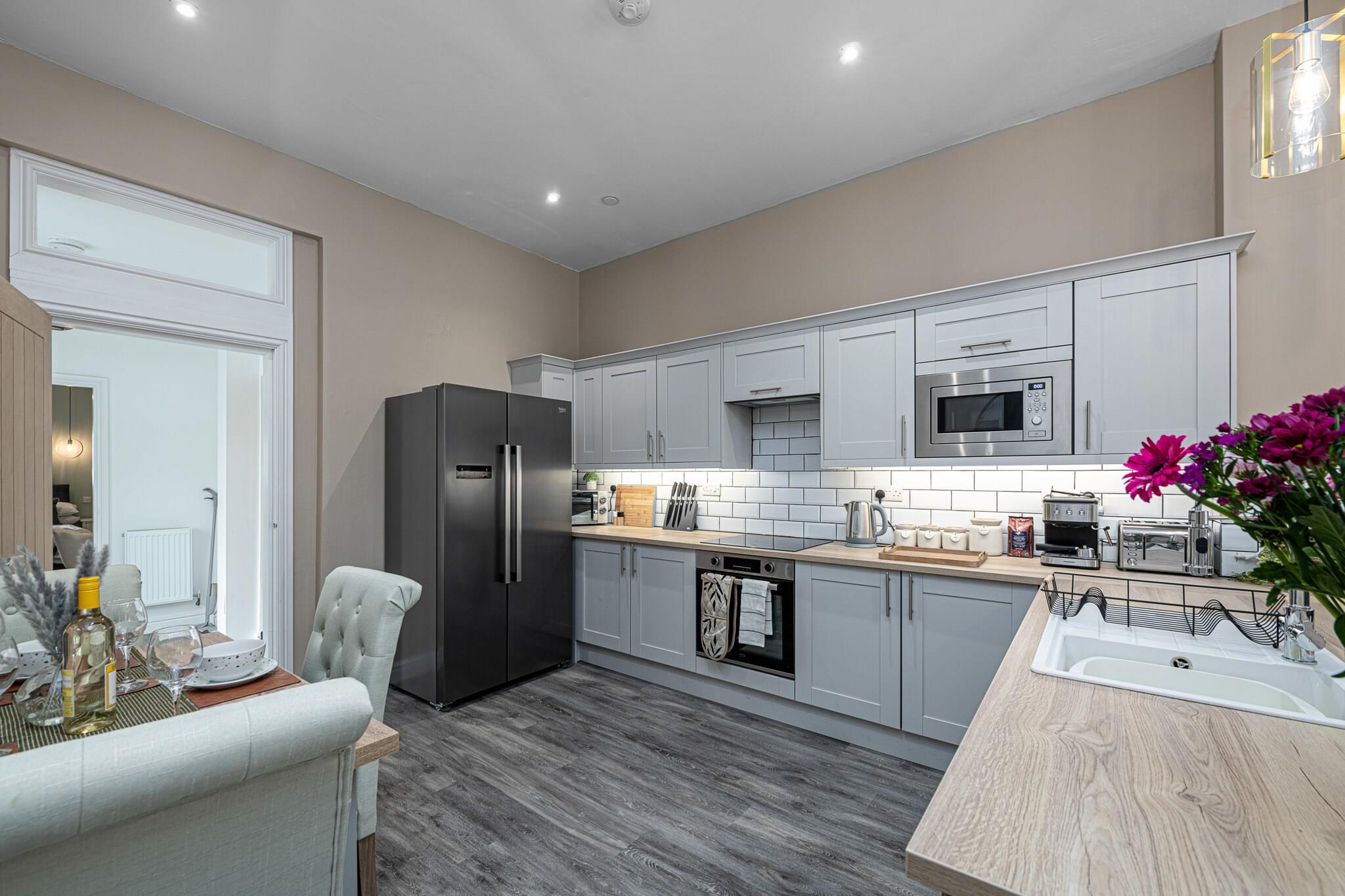 Recently renovated and brand new for 2023, this modern ground-floor apartment offers a comfortable retreat for four guests in the Welsh seaside town of Pwllheli. Located just 500 meters from Blue Flag beaches, it’s ideal for couples or friends seeking a peaceful escape by the coast. Inside, the open-plan living area features a Smart TV and WiFi, while the well-equipped kitchen includes an electric oven, induction hob, microwave, coffee machine, fridge, and freezer, perfect for preparing delicious meals. Designed with comfort in mind, the apartment provides two double bedrooms and a modern family bathroom with a standalone bath, shower, WC, and basin. Step outside to explore the vibrant town, renowned for its charming streets, pubs, cafés, and shops offering local Welsh specialties such as award-winning fish and chips, ice cream, and seaside rock. The town also has three major supermarkets for self-catering needs, making it convenient for longer stays. Pwllheli, meaning 'salt-water pool,' serves as an excellent base for exploring Cardigan Bay and the Irish Sea, with opportunities for coastal cruises to spot seals, seabirds, and dolphins. Off-road private parking is available at the rear for one vehicle. For larger groups, an additional apartment can be booked under Peace Retreats Penthouse, accommodating up to 11 guests.