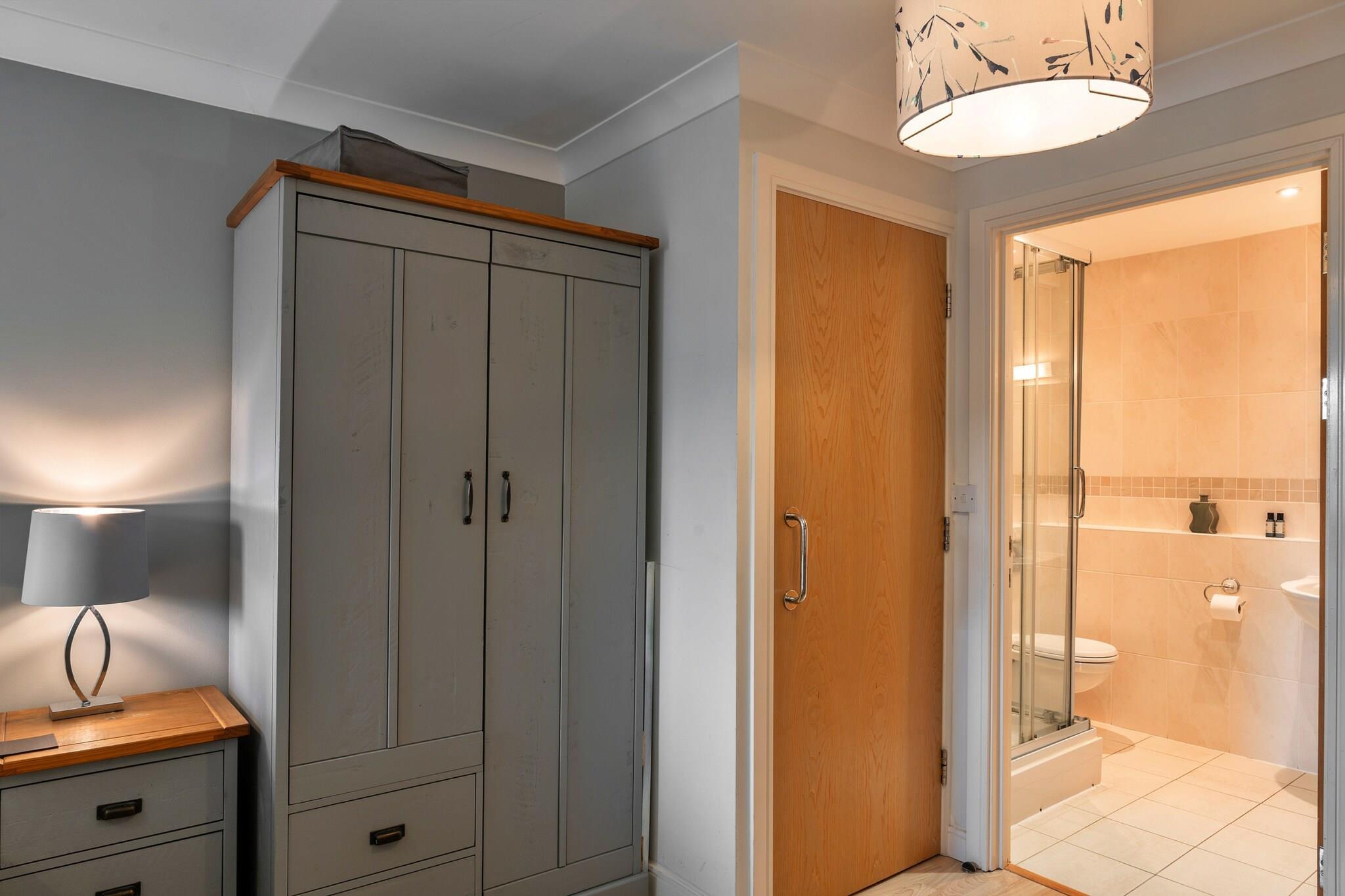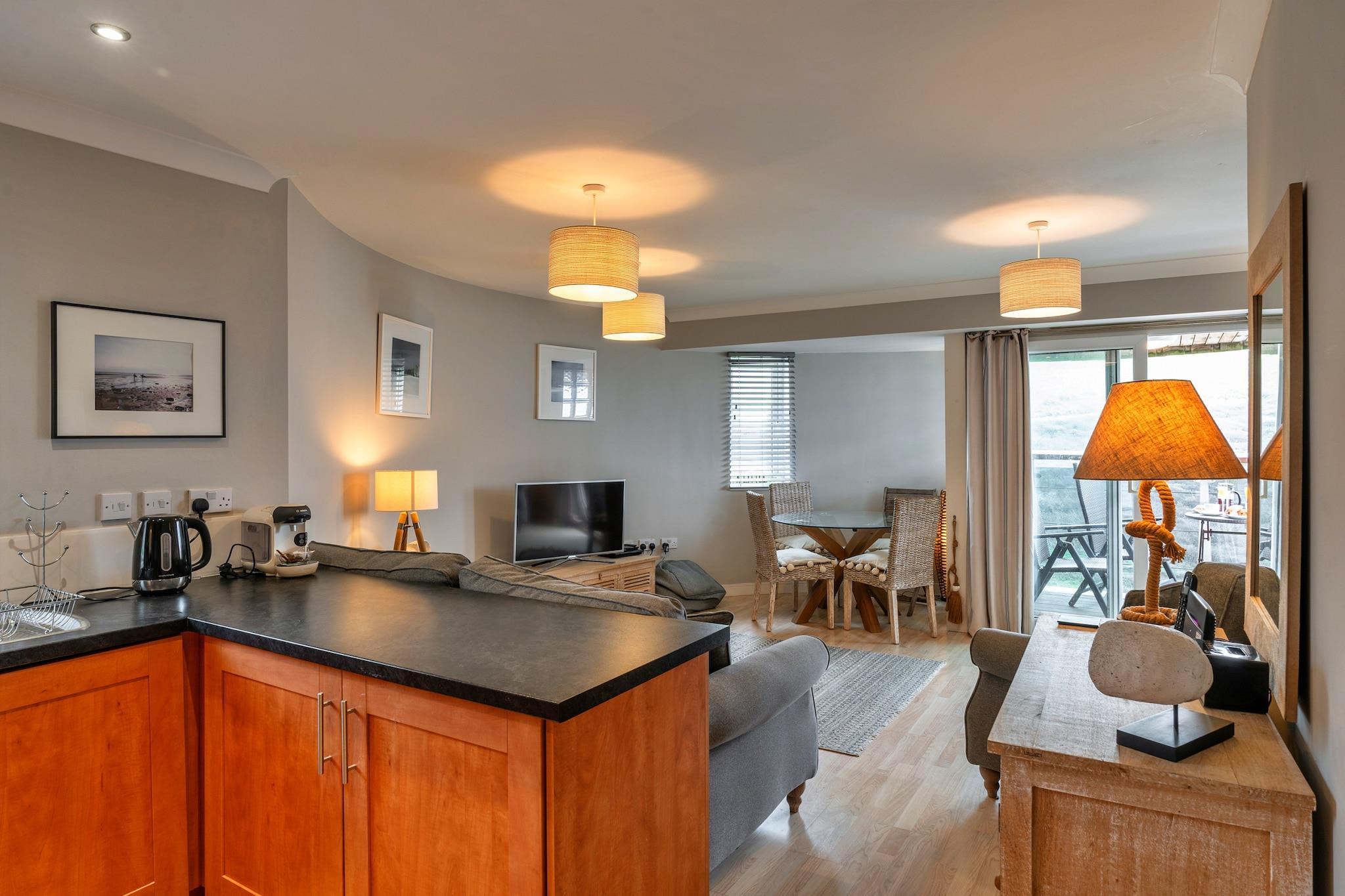 Escape to this stunning third-floor apartment, offering breathtaking views over Watergate Bay and the rolling countryside beyond. Ideal for families and friends seeking an adventurous coastal break, this secure and stylish retreat is also pet-friendly, allowing you to bring your furry companions along for the adventure. With underfloor heating, it ensures comfort throughout the year, no matter the season. The open-plan living space is designed for relaxation and socializing, featuring a sleek, modern kitchen fully equipped with all the essentials. The inviting dining area is perfect for shared meals and lively game nights, while the cozy lounge beckons you to unwind with a movie night after exploring the area. The standout feature is the private balcony, where you can take in spectacular views of Watergate Bay and the surrounding hills—a perfect spot to enjoy a glass of wine as the sun sets. Inside, you'll find two beautifully styled bedrooms that embrace a maritime theme. The king-size master bedroom boasts its own ensuite and incredible sea views, while the twin room offers a comfortable haven for guests. After a day at the beach, you can choose between a relaxing bath or refreshing shower in the family bathroom. The communal shower area downstairs provides a convenient space for rinsing off after beach activities. With access to the stunning surroundings of Watergate Bay, home to one of Cornwall’s premier surfing beaches, you and your pets can enjoy a range of exhilarating watersports or embark on scenic walks along the South West Coast Path, making this a perfect getaway for both you and your four-legged friends.